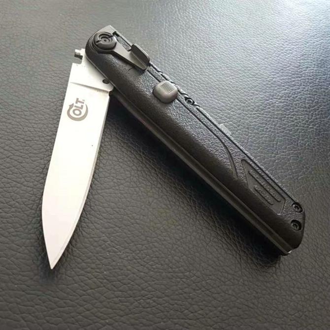 Colt品牌自动战术折叠刀,三分独立锁钮设计,保险-按钮-解锁,类似意大利黑手党设计
