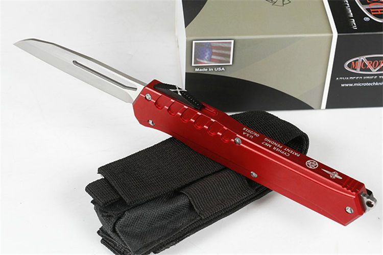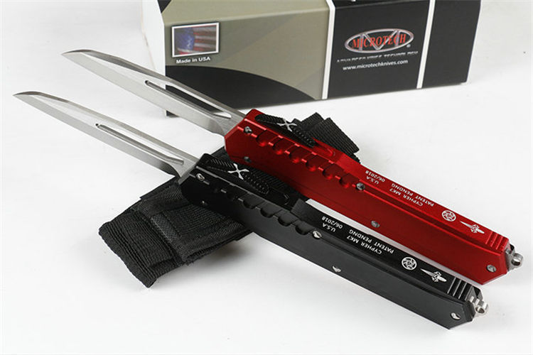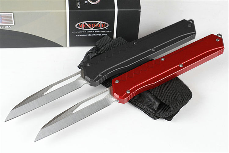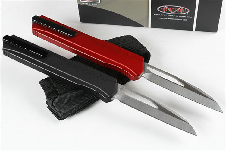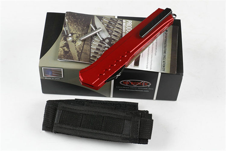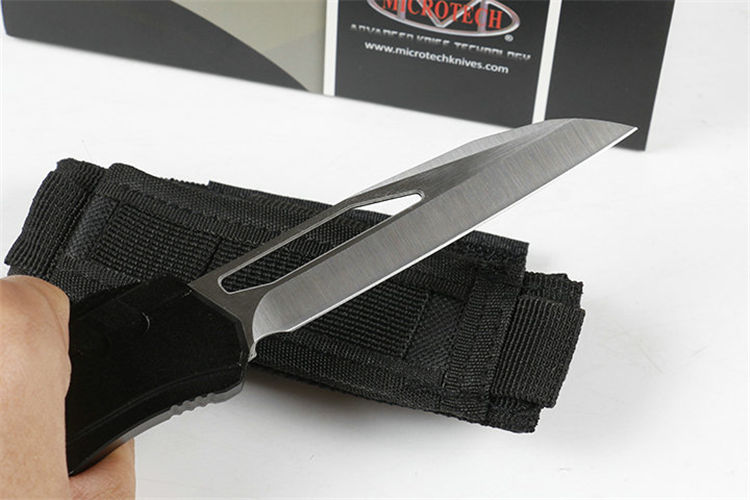 微技术沙光版A2直出跳刀 品牌:MICROTECH 美国微技术 全长:24.2CM 刃长:9.7CM 柄长:14.5CM 刃宽:1.8CM 刃厚:0.3CM 刃材:7CR17灰钛加石洗处理. 柄材:铝合金镀因黑钛 刀型:直跳 锁定类型:按钮锁 重量:220克(含包装) 附件:彩盒,送拆刀工具 整刀用CNC,电脑锣,线切割制作而成,手工,精密度非常高