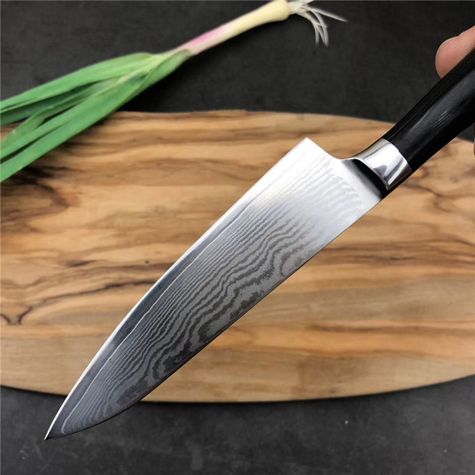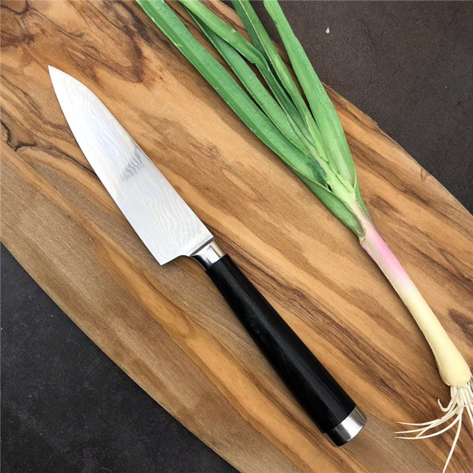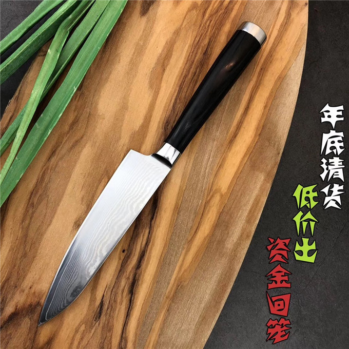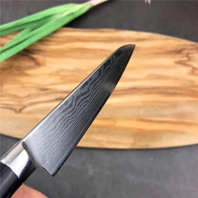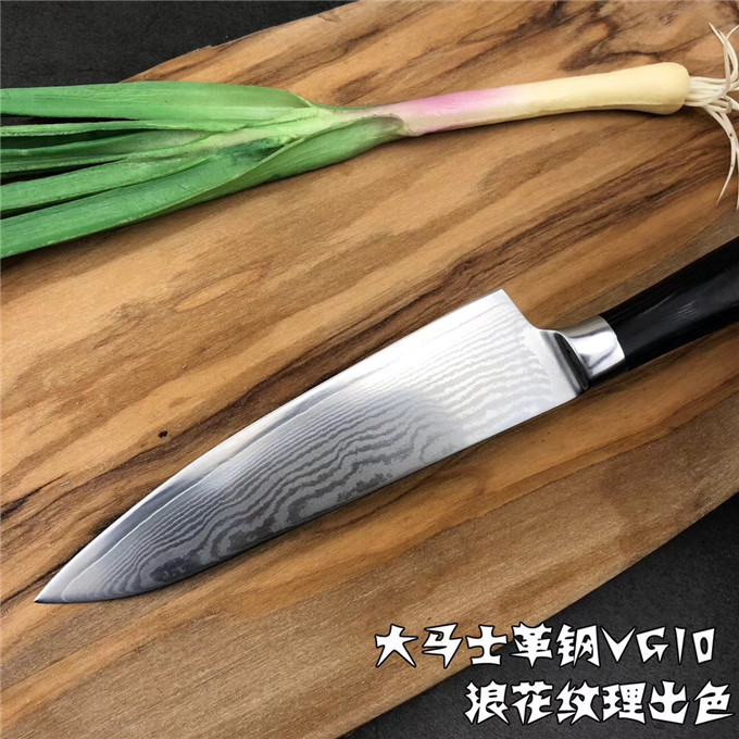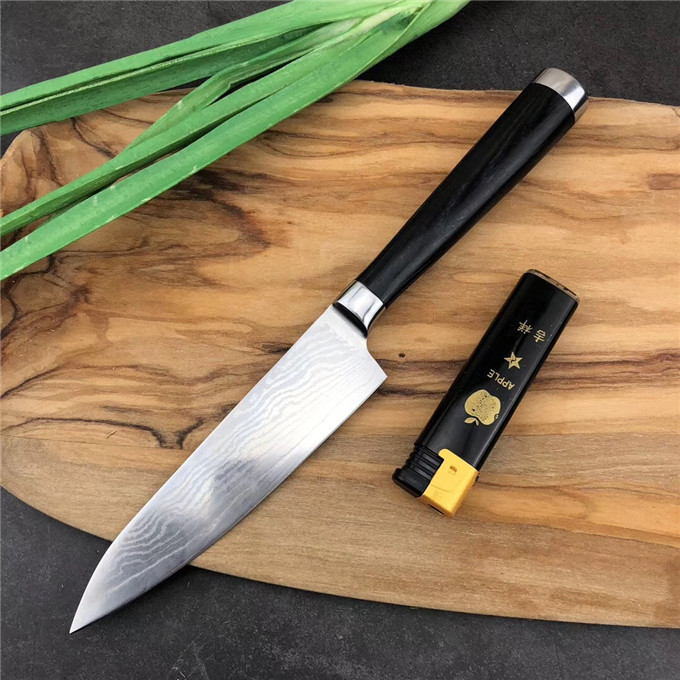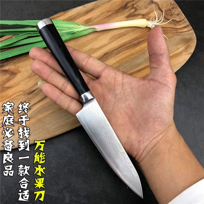 大马士革万能水果厨刀 总长:23.5cm 刃长:12cm 手柄:11cm 刃宽:2.8cm 厚度:1.7mm 刃材:大马士革钢 硬度:59HRC 柄材:黑木+双钢头