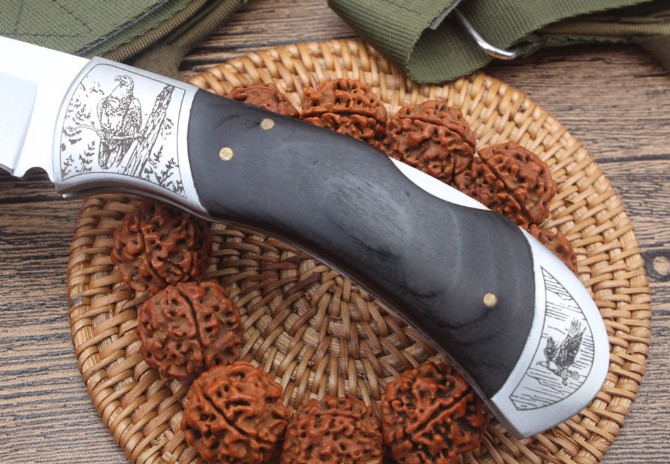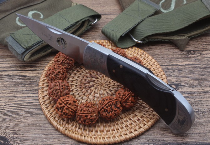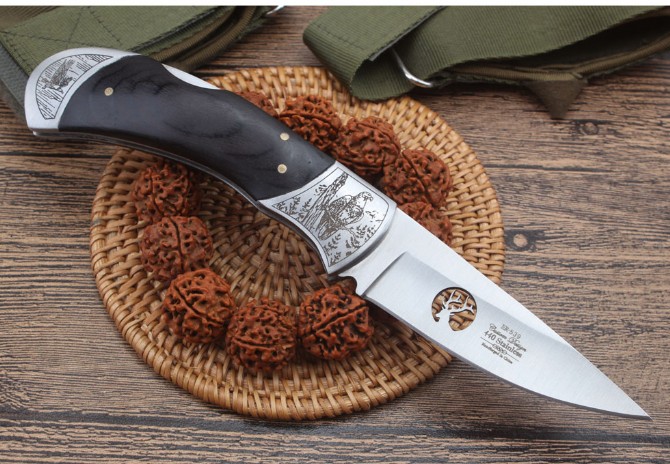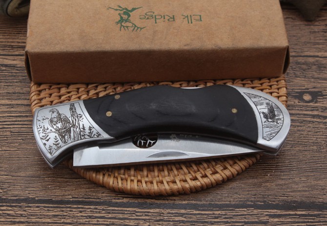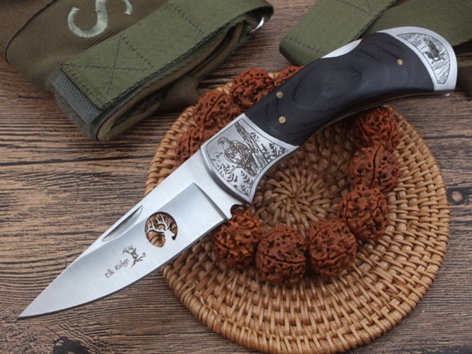勃朗宁鹿头折刀 总长:20.1cm 刃长:8.2cm 柄长:11.5cm 刃宽:2.6cm(最宽处) 刃厚:3.1mm 刃材:7CR13MOV 硬度:58HRC 刀柄:双钢头+彩木 表面:沙光 重量:170g含包装 配原厂包装