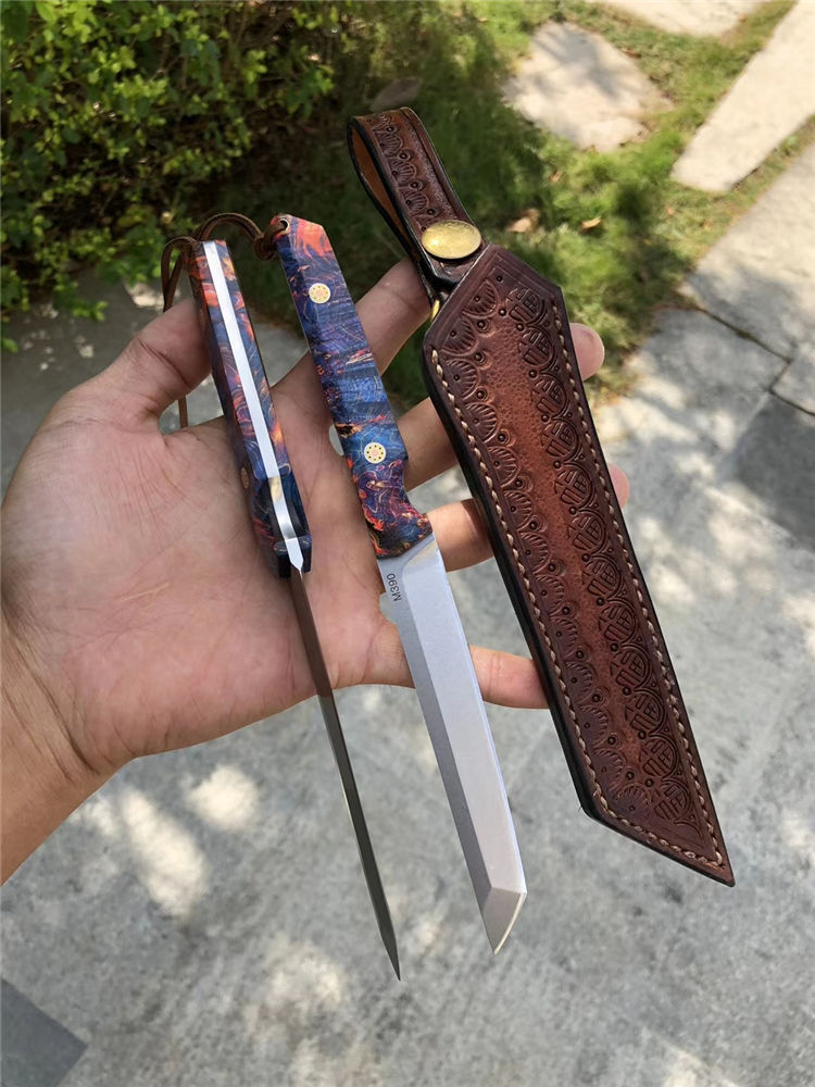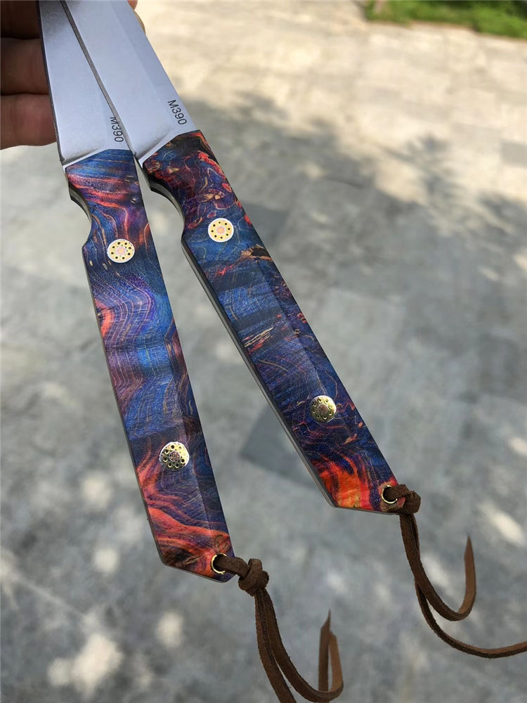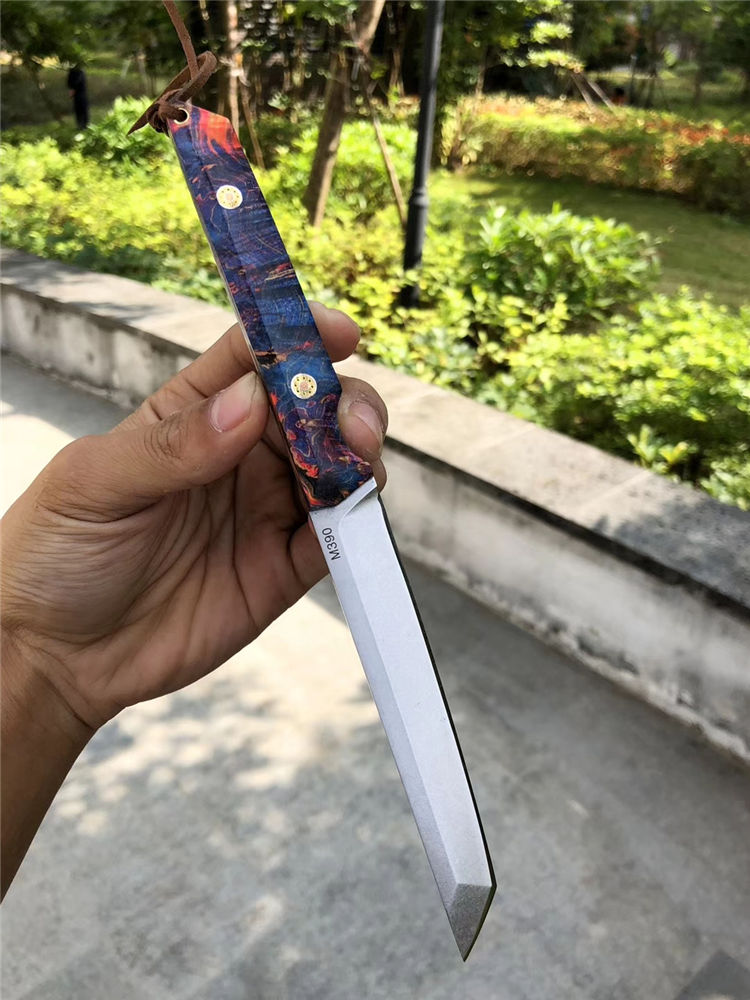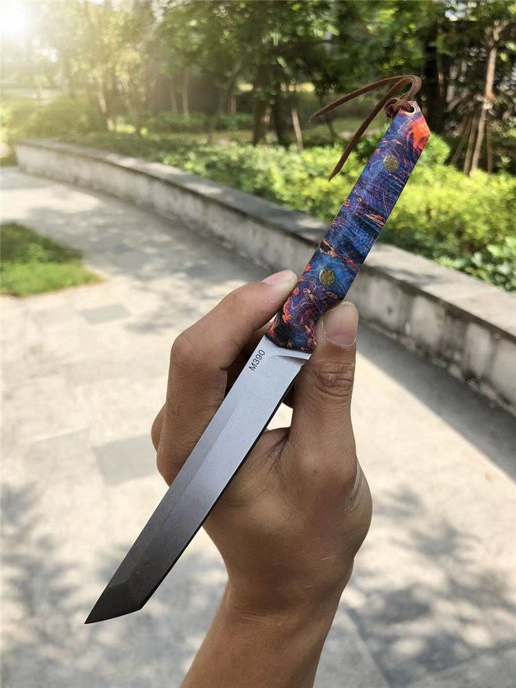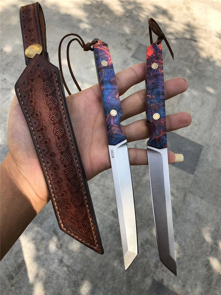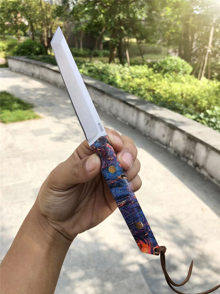 M390必杀武士直刀 总长:21.5cm 刃长:11cm 手柄:10.5cm 厚度:3.2mm 宽度:1.8cm 钢材:一体钢M390粉末钢 硬度:61-62HRC 手柄:稳定固化木材+马赛克柳丁 包装:手工盒 皮套:进口手工复古雕花牛皮套、扣带式 奥地利一体钢M390粉末神钢,超级耐磨耐腐蚀,钢材韧性与防锈性保持度非常好,M390钢被称誉为神钢,可知它的综合性是非常好的一种钢材真空热处理,成品硬度61-62HRC,表面石洗效果、一体钢搭配稳定固化木,星幻火焰/瑰丽绚烂,充满了神秘的浪漫色彩