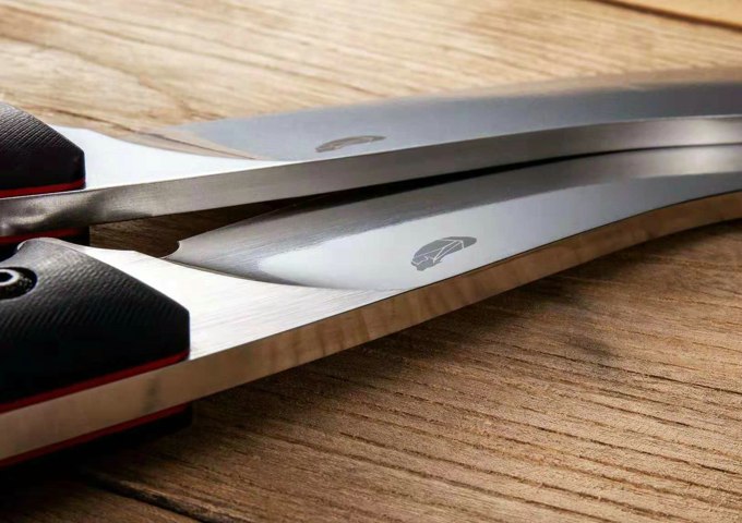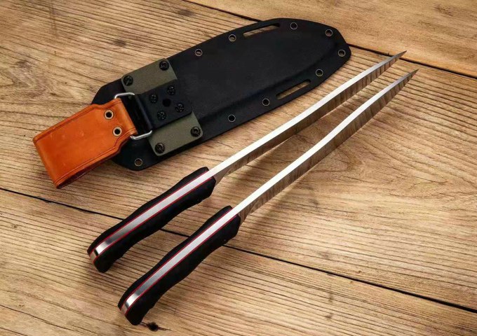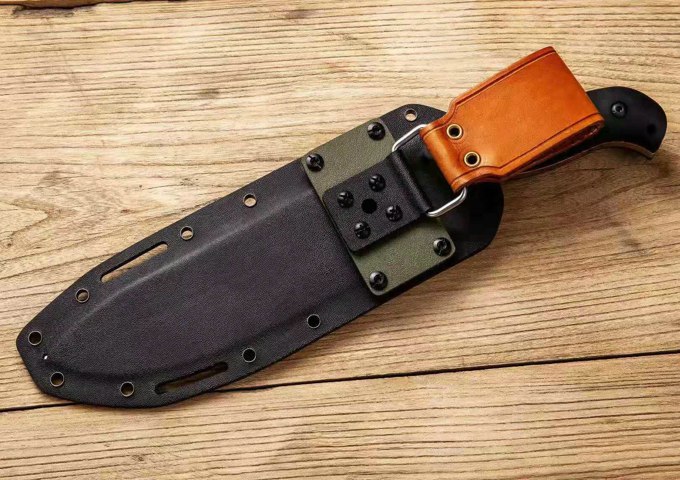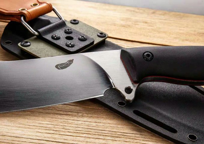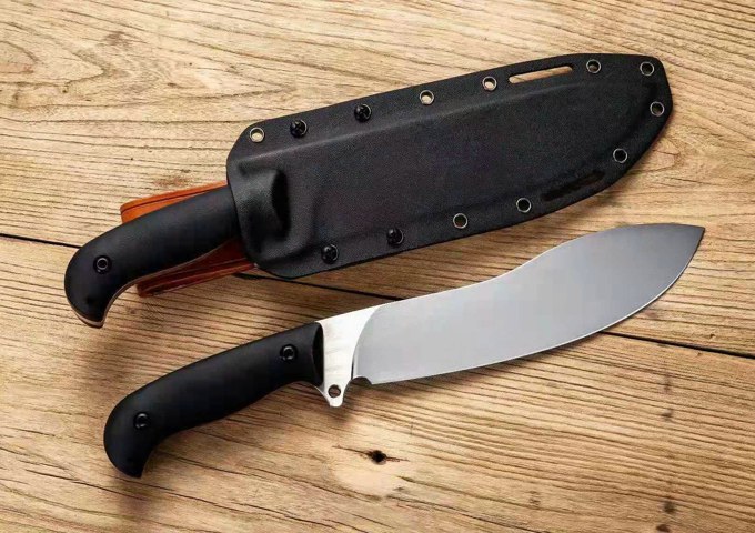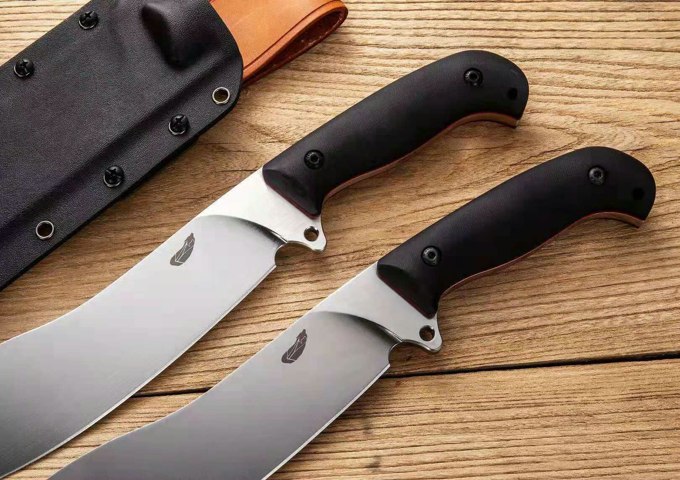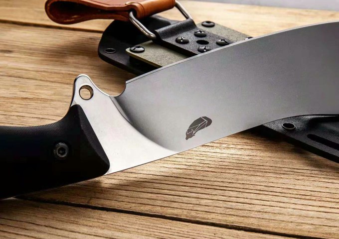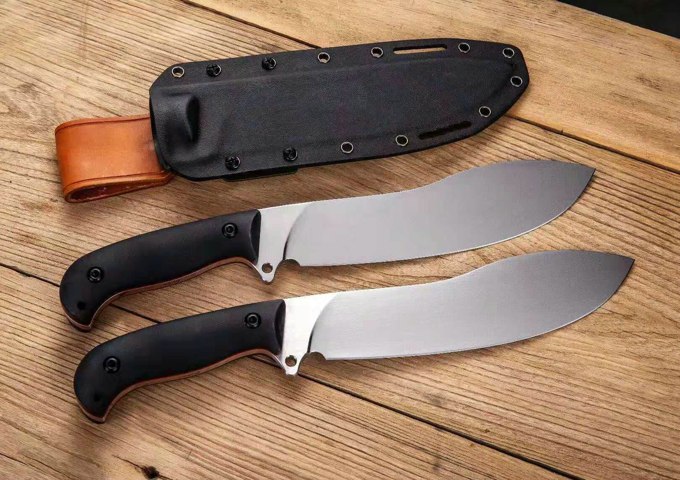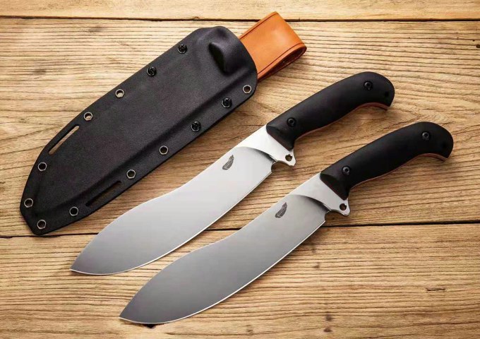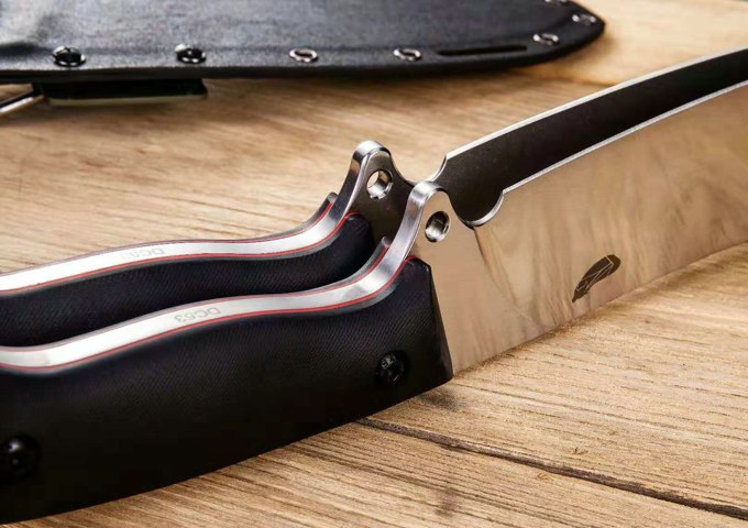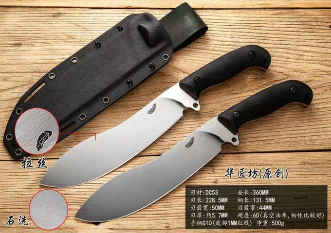 华匠坊大茄子直刀 刃材:DC53 全长:360MM 刃长:228.5MM 柄长:131.5MM 刃最宽:50MM 刃最窄:44MM 刃厚:约5.7MM 硬度:60(真空油率,韧性比较好) 手柄G10(底部1MM红线) 净重:500g
