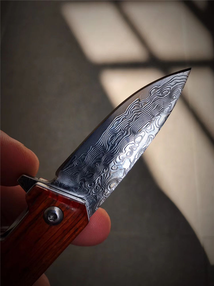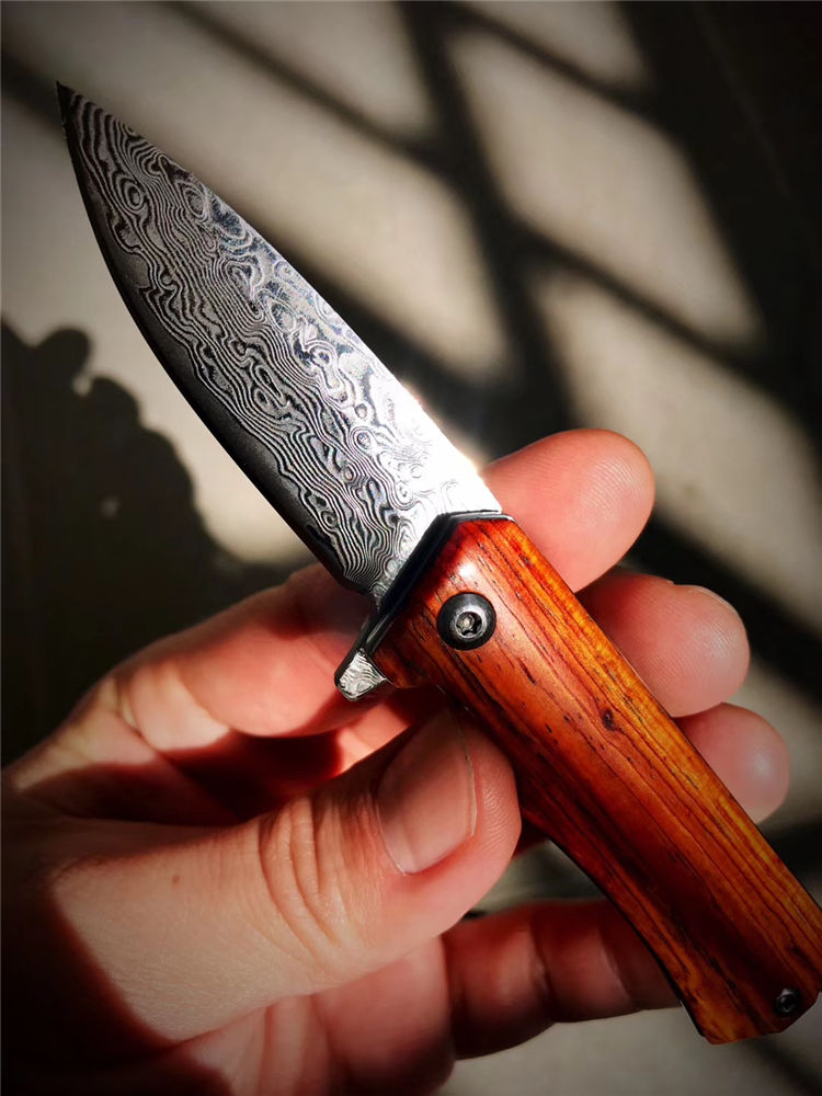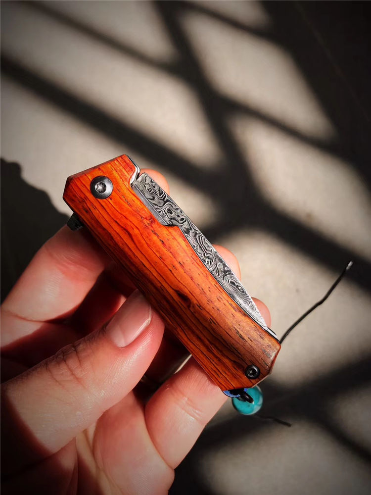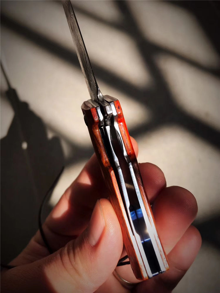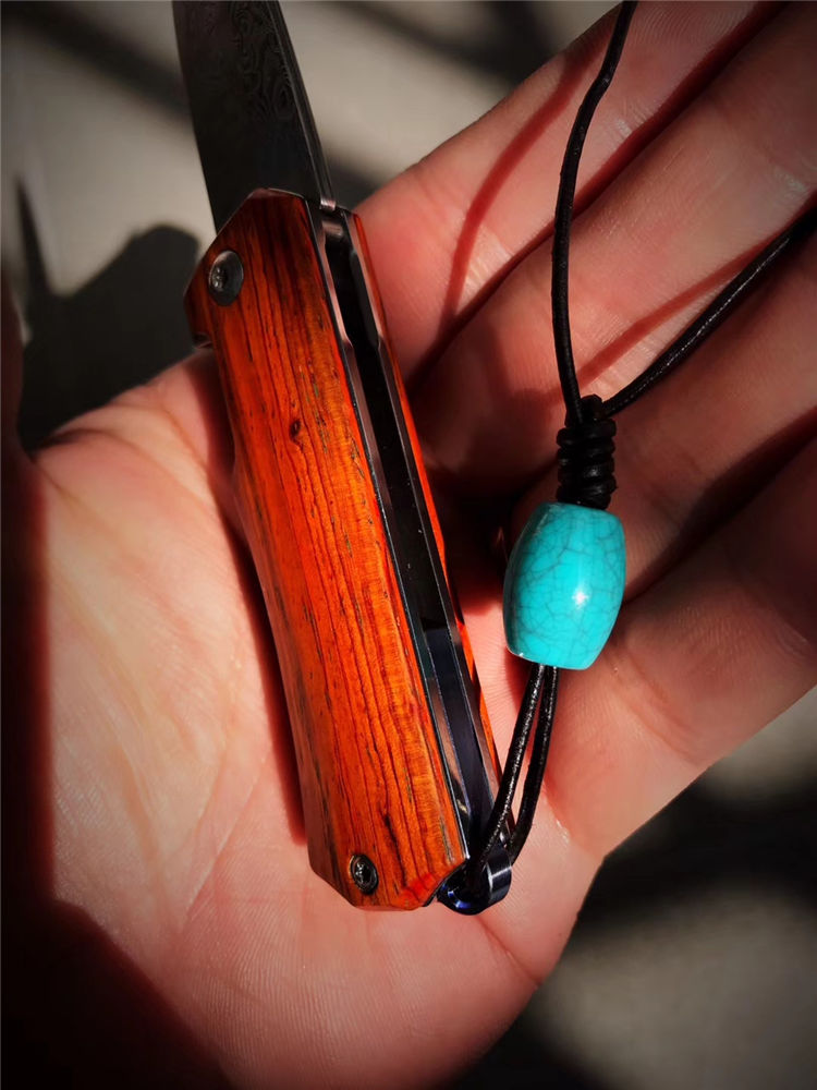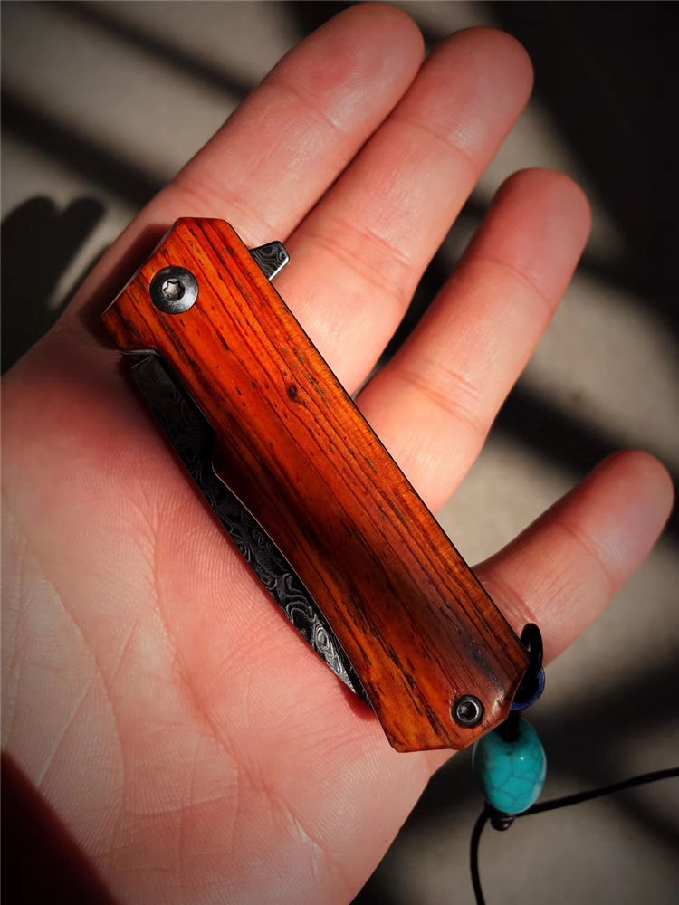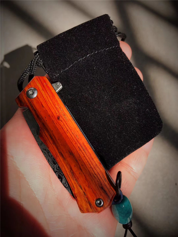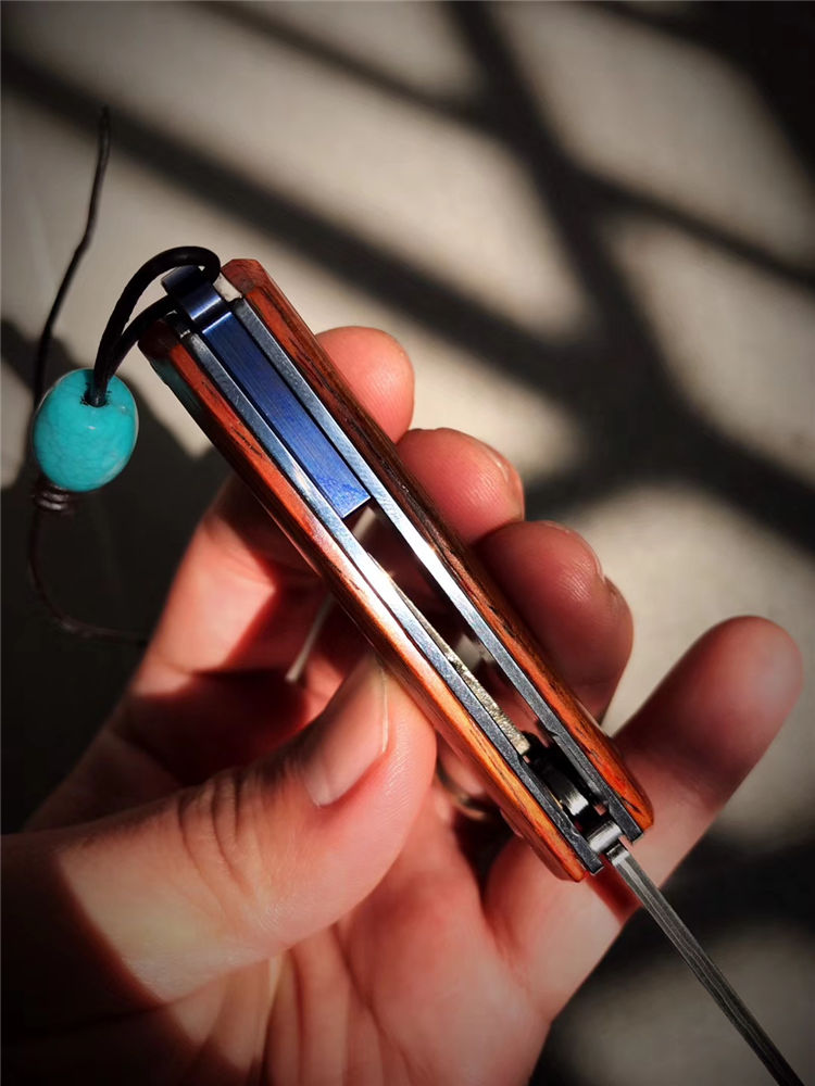 滚珠轴承快开小折刀。夹钢大马士革,真空热处理后芯层硬度达58-60HRC。手柄采用微粒黄檀实木,配合2.0mm厚的不锈钢刀架,蓝色的钛合金背骨,随刀带刀坠