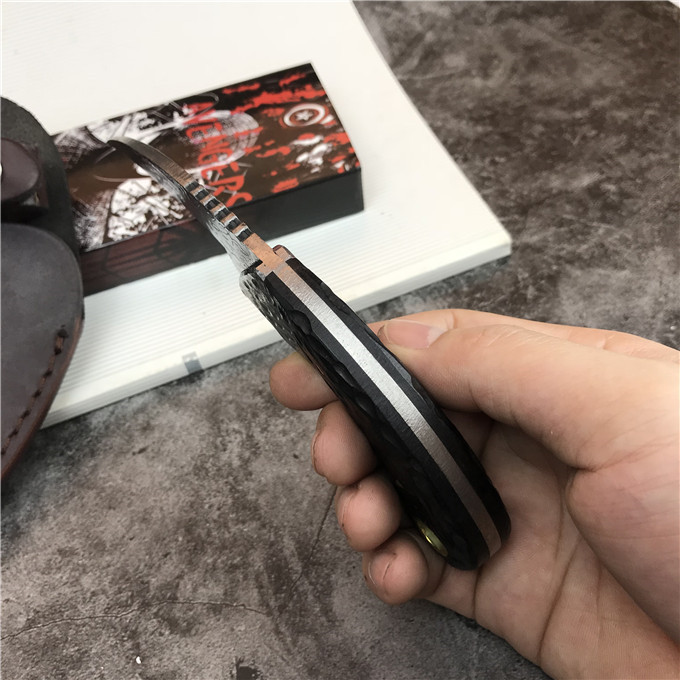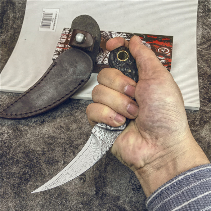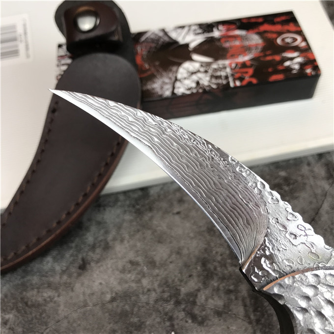 大马士革黑檀木爪刀 全长:17cm 刃长:8.1cm 柄长:9.12cm 刃宽:2.4cm(最宽处) 硬度:59HRC 刃厚:0.35cm 柄材:大马士革钢头加黑檀木 重量:240克含包装 刃材:大马士革 其他:真皮套