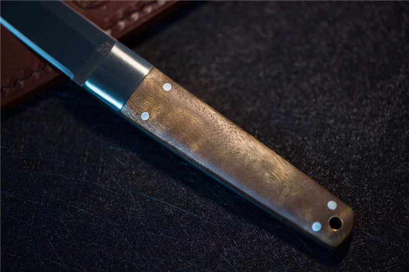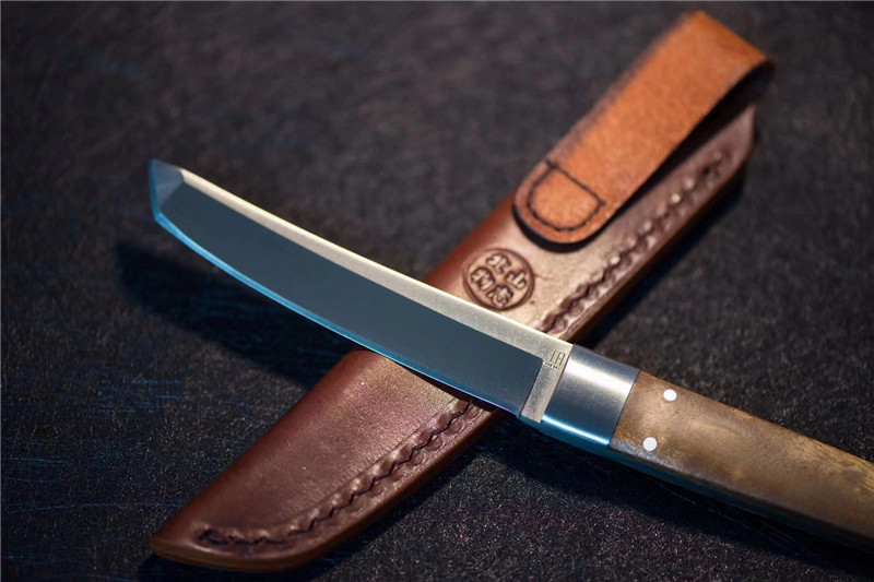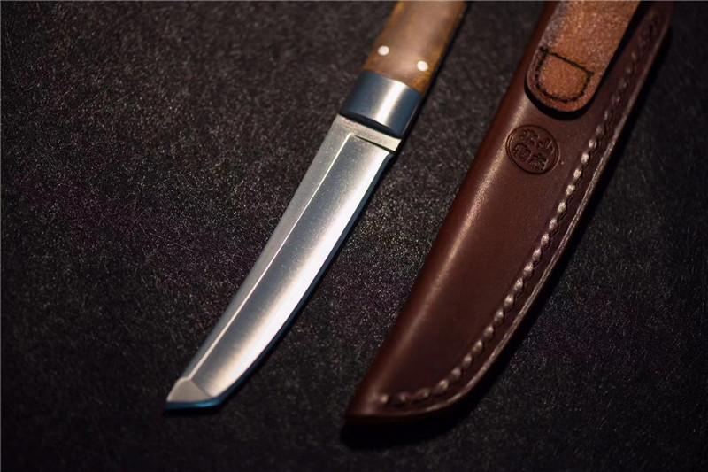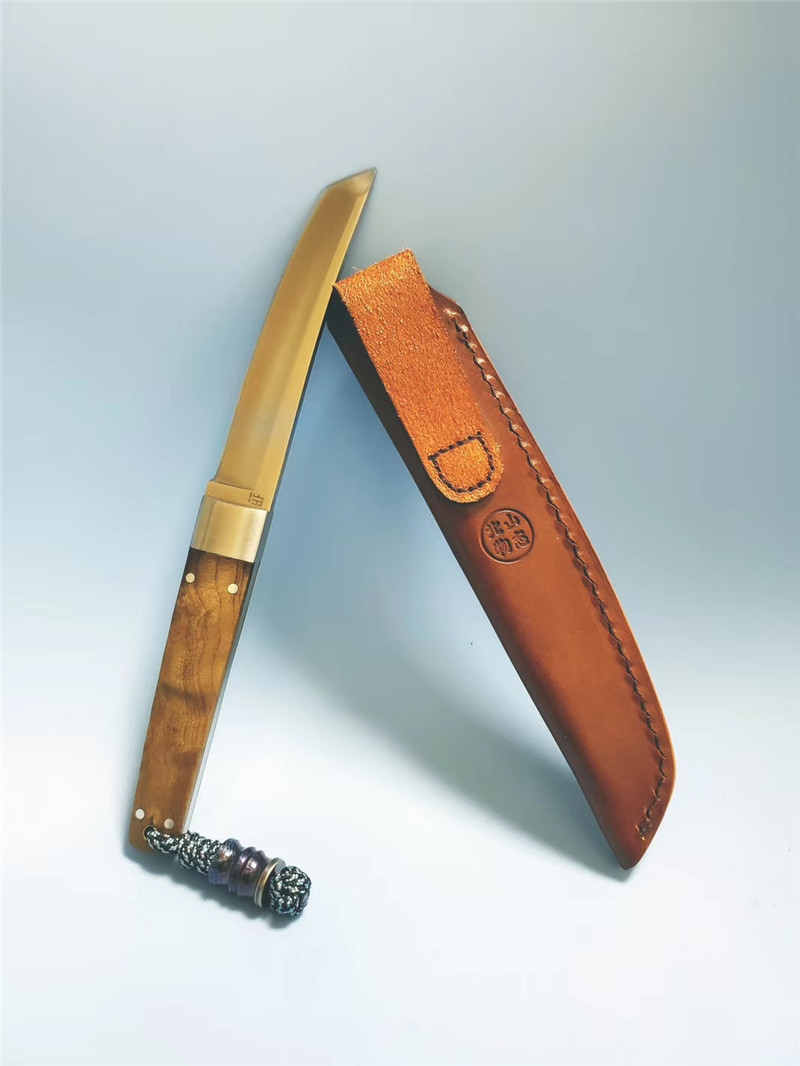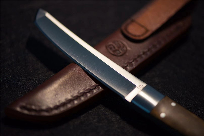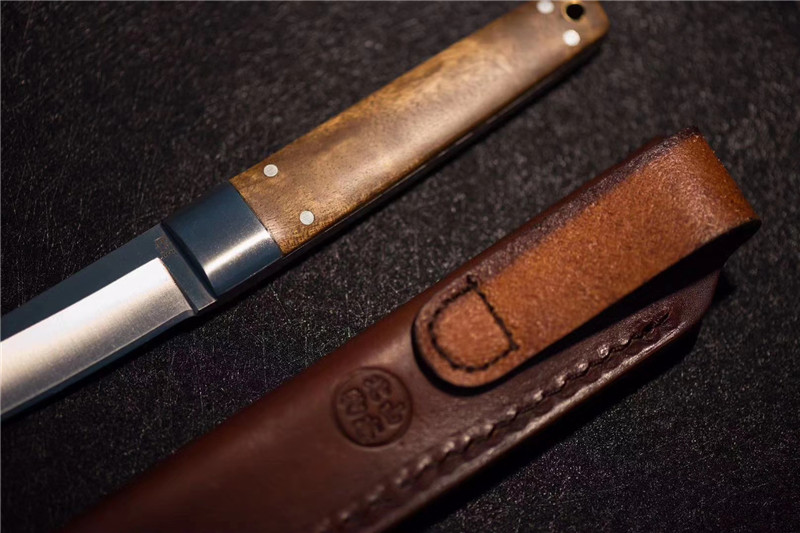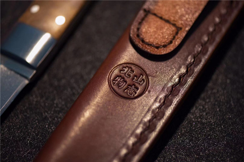 北山物志“侍”直刀 独家材料:9cr18mov 热处理:真空油淬火 硬度:58 全长:220mm 刃长:97mm 刃厚:4mm 鞘材:牛皮鞘 柄材:缅甸疤瘤影子木