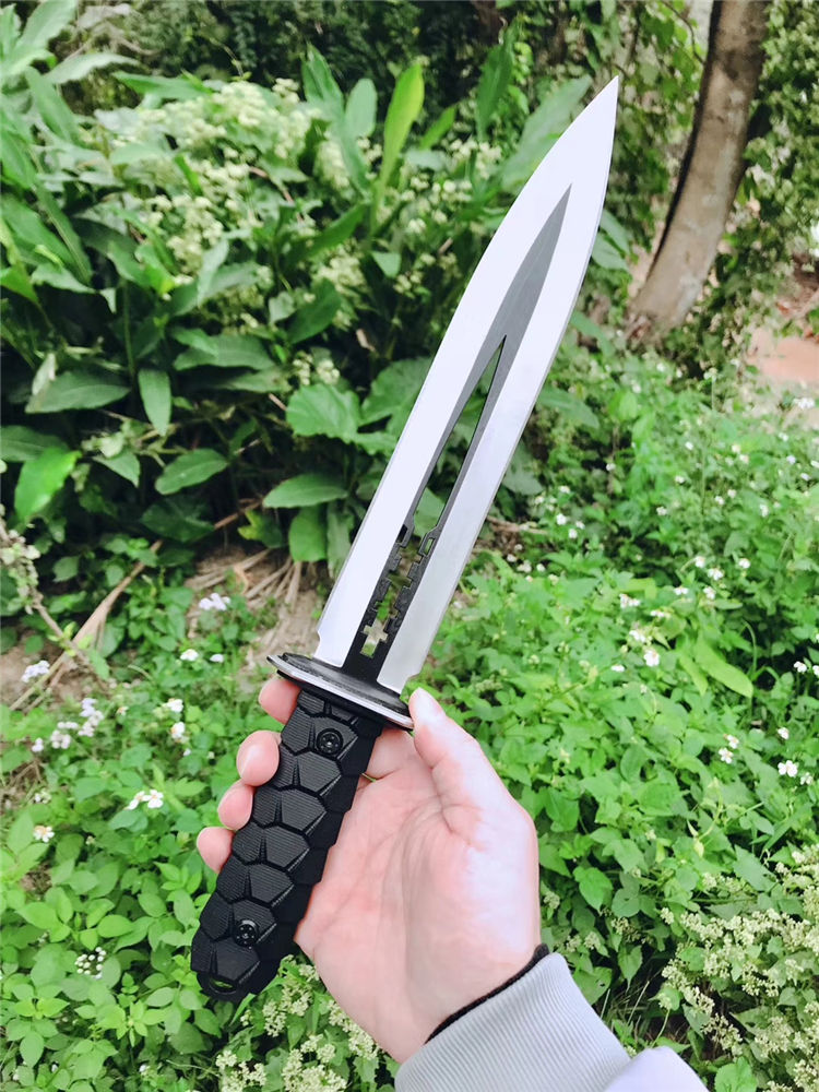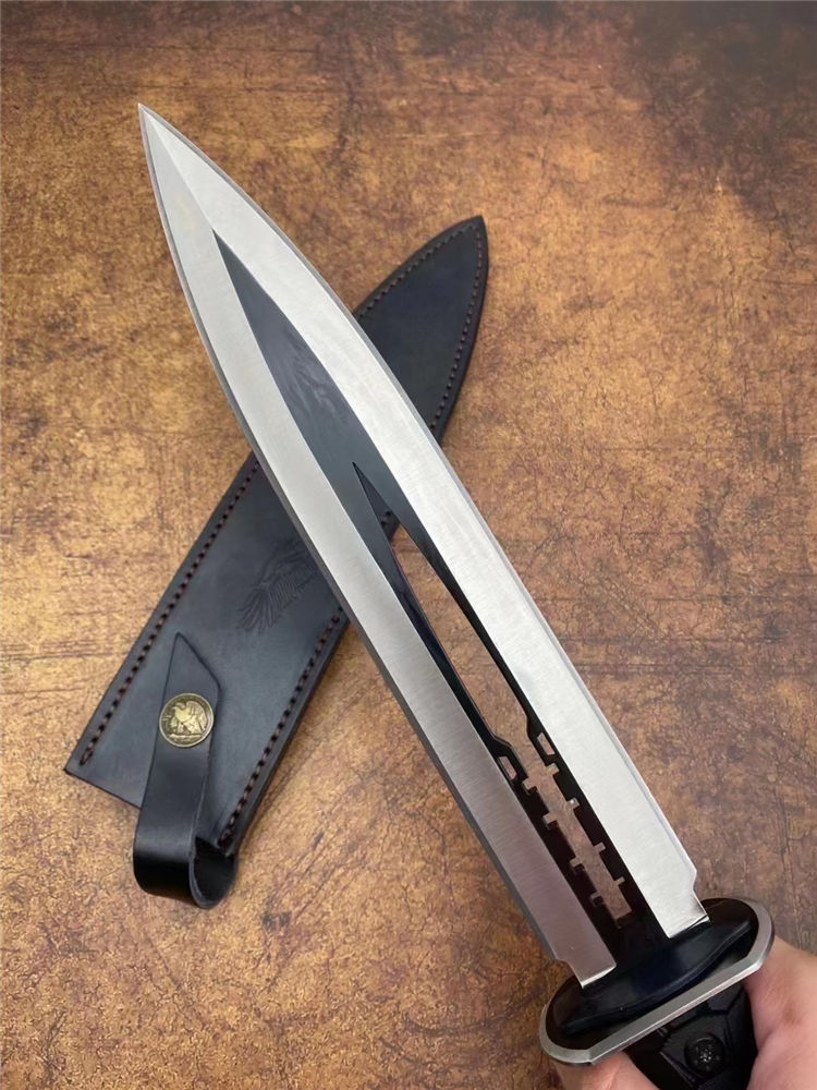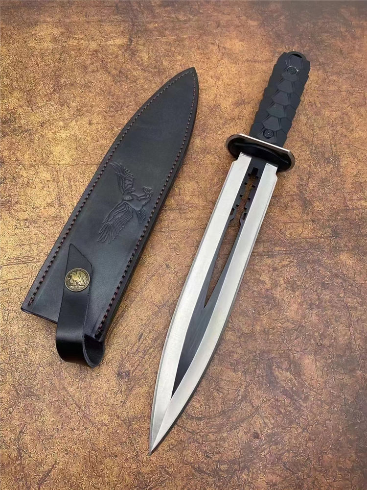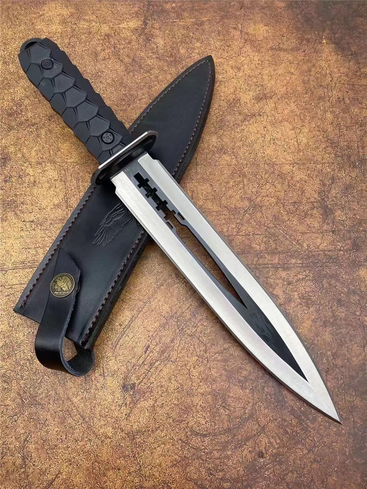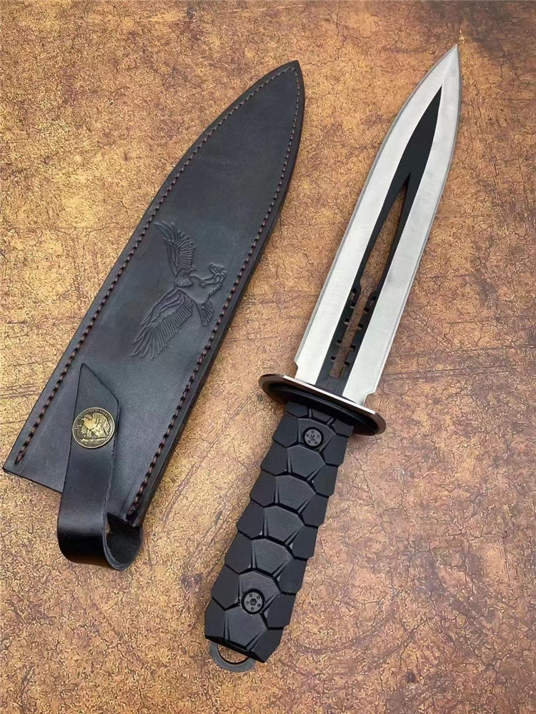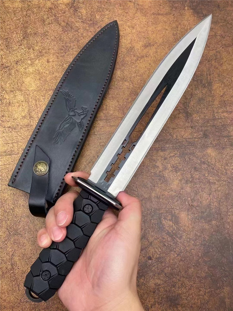 铁血双锋直刀 全长:39cm 柄长:12.5cm 刃厚:0.5cm 刃材:8cr18mov 柄材:G10 配:皮套