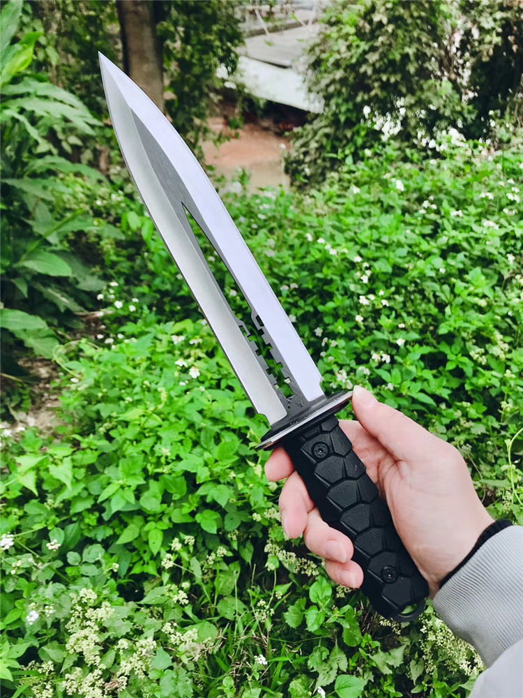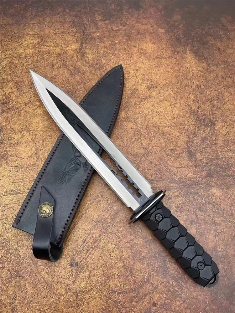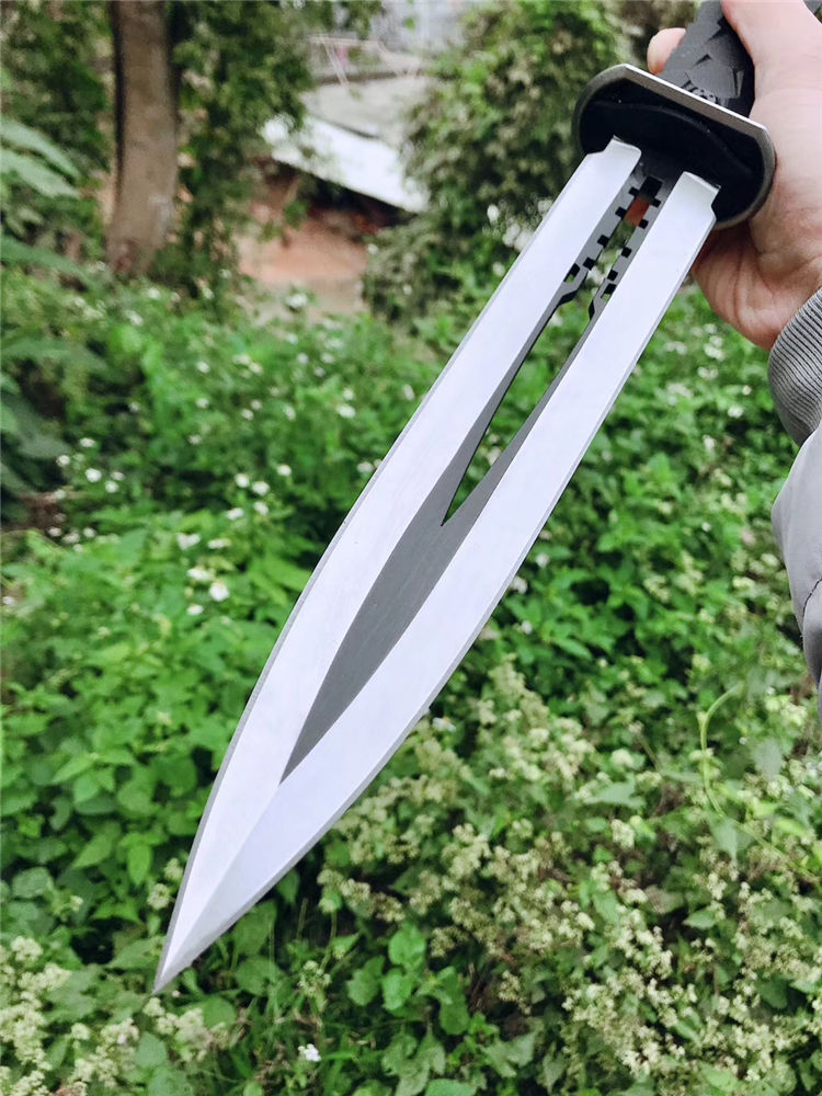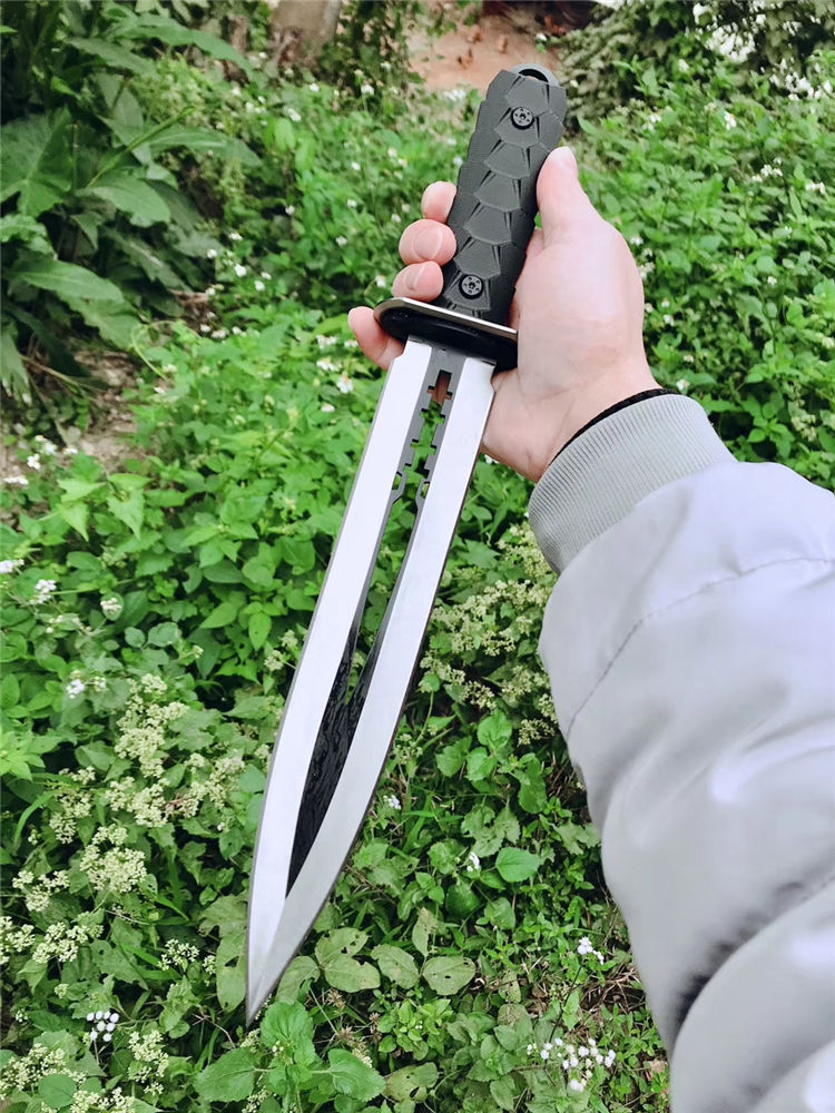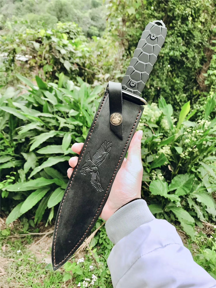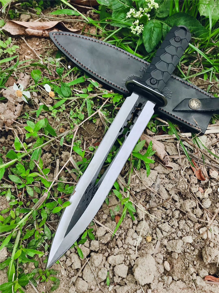 铁血双锋直刀 全长:39cm 柄长:12.5cm 刃厚:0.5cm 刃材:8cr18mov 柄材:G10 配:皮套