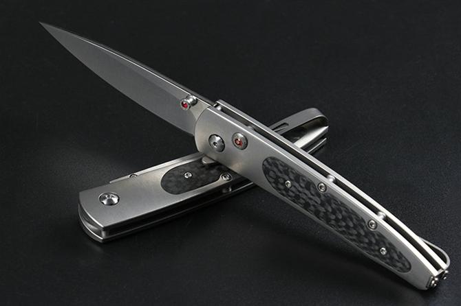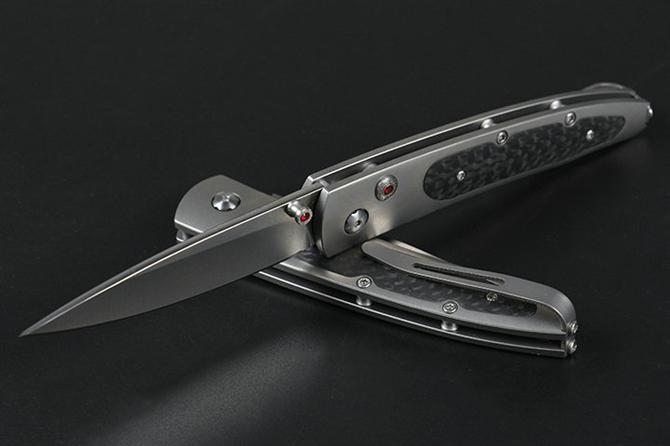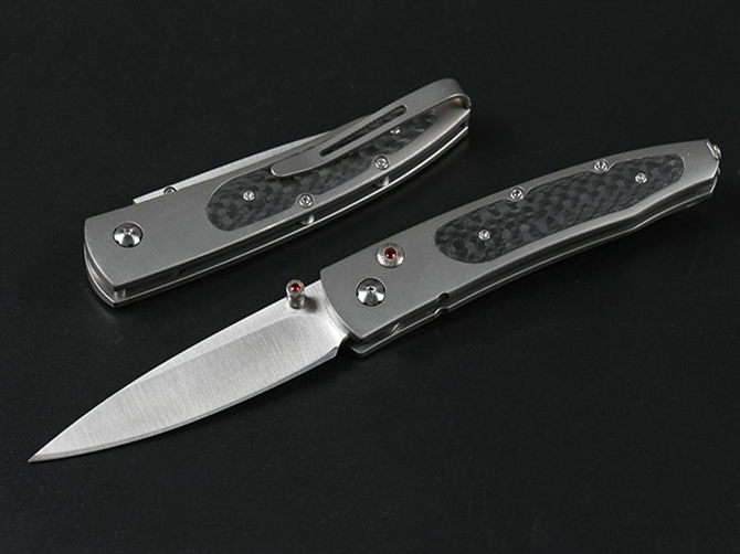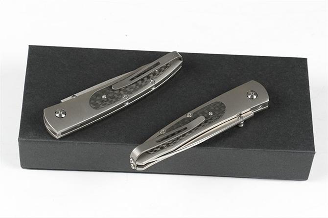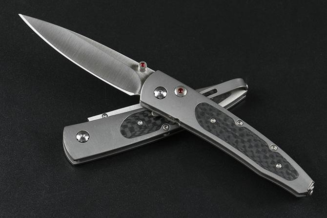 威廉亨利钛合金柄M390折刀 全长:15.5cm 柄长:9.0cm 刃材:M390 柄材:碳纤维+TC4钛合金CNC 刃长:6.5cm 刃厚:2.4mm 柄厚:8.7mm 硬度:60HRC 垫片:特富龙 螺丝:416L不锈钢 背夹:TC4钛合金 重量:93克(含包装物) 包装:礼盒 产地:中国 忠实原版1:1复刻。自补偿锁定,按钮镶嵌红宝石,碳纤维贴片