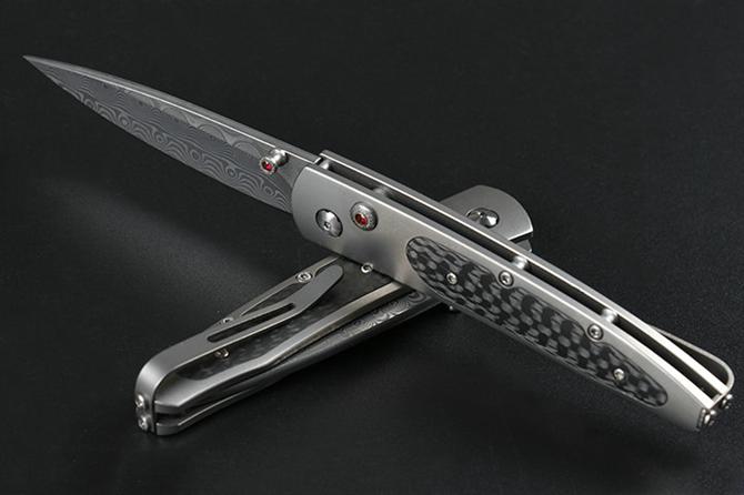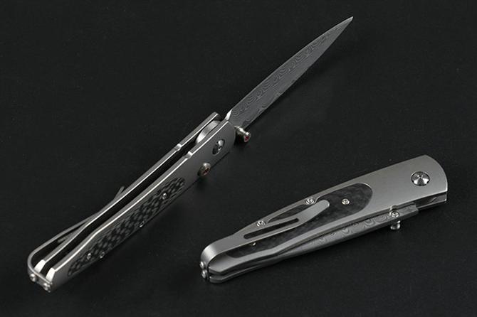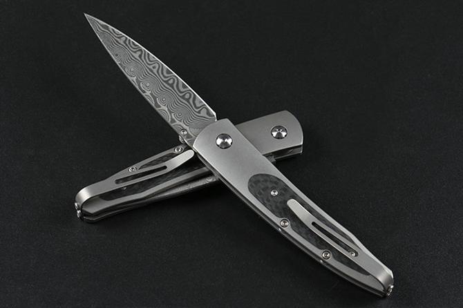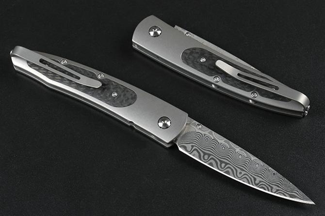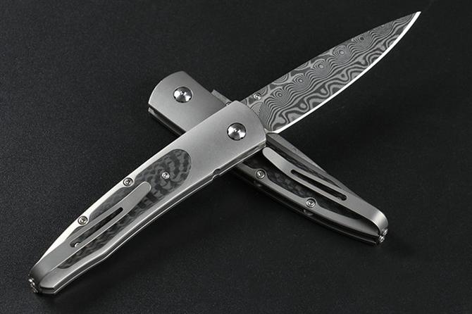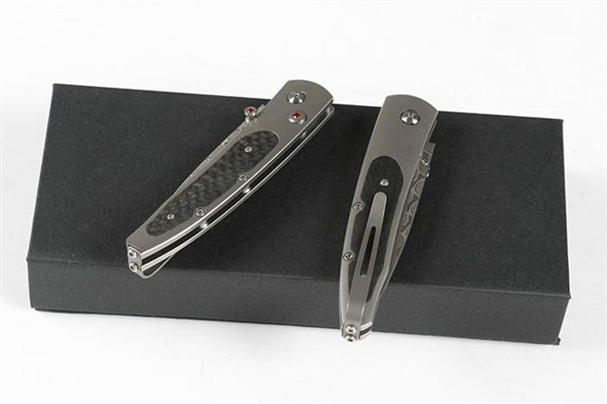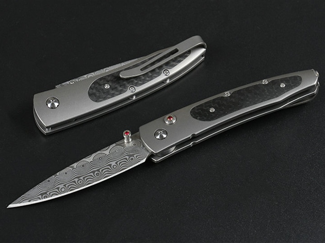 大马士革威廉亨利钛合金柄折刀 全长:15.5cm 柄长:9.0cm 刃材:大马士革钢 柄材:碳纤维+TC4钛合金CNC 刃长:6.5cm 刃厚:2.4mm 柄厚:8.7mm 硬度:58HRC 垫片:特富龙 螺丝:416L不锈钢 背夹:TC4钛合金 重量:93克(含包装物) 包装:礼盒 产地:中国 忠实原版1:1复刻。自补偿锁定,按钮镶嵌红宝石,碳纤维贴片