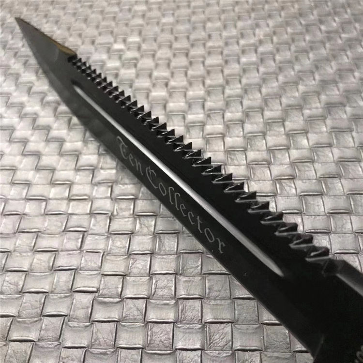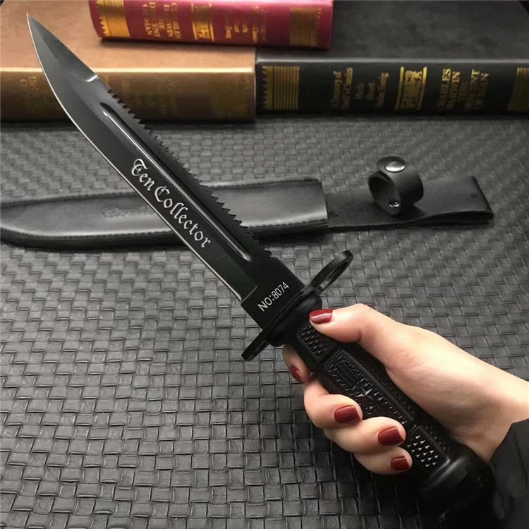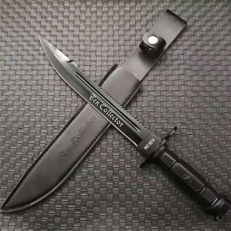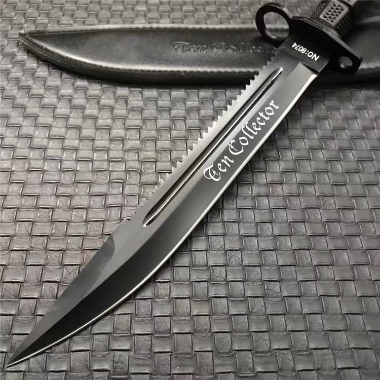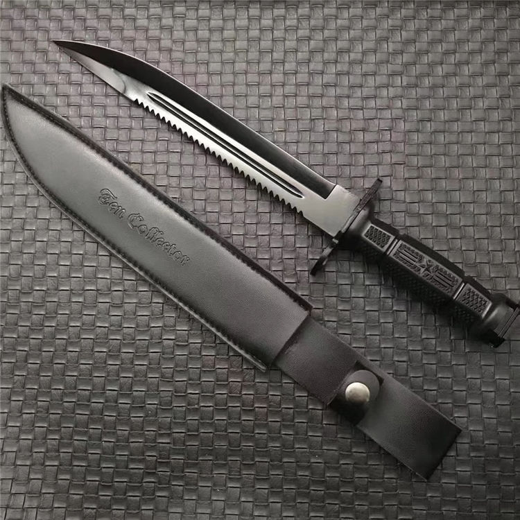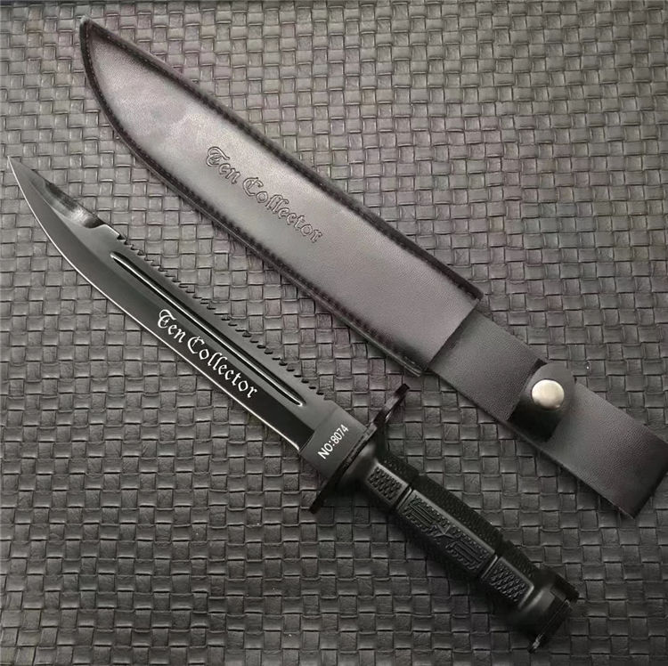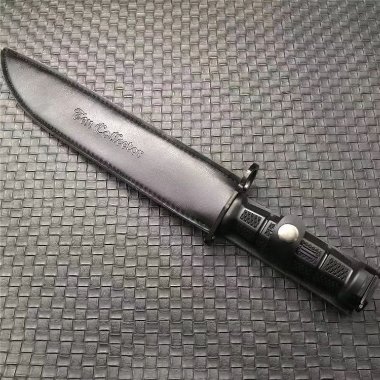 新版加厚型95刺勇士直刀 全长:380mm 刃长:240mm 柄长:120mm 刃宽:31mm 刃厚:6mm 柄材:5CR15MOV 净重:408g 刀+皮套:463g 硬度:57HRC 表面:电镀发黑 柄材:复合弹性材料