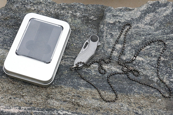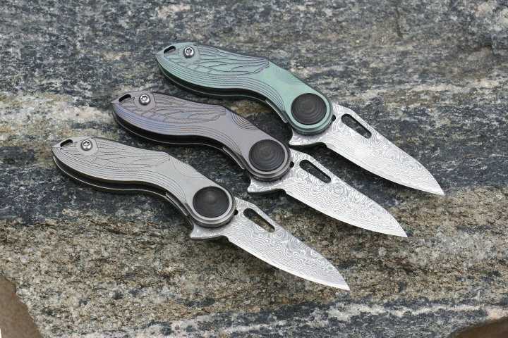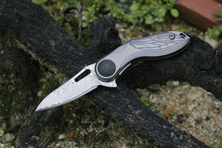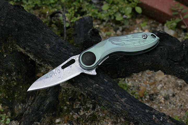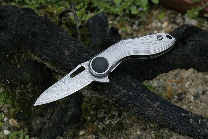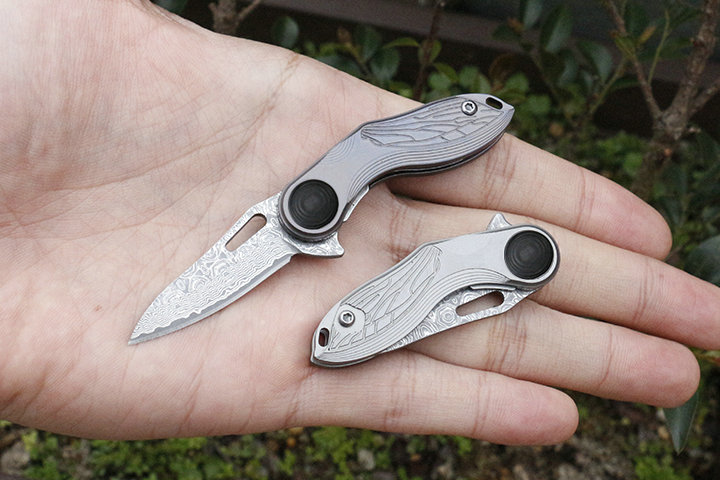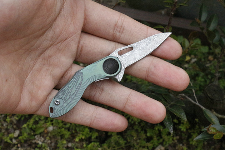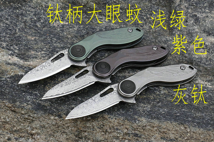 大马士革钛柄大眼纹项练折刀 全长:9.2cm 柄长:5.2cm 刃材:大马士革钢 柄材:碳纤维+TC4钛合金CNC,三色任选,下单请注明 刃长:4.0cm 刃厚:2.1mm 宽度:1.4mm 硬度:58HRC 垫片:内置轴承 螺丝:416L不锈钢 背夹:TC4钛合金 重量:63克(含包装物) 包装:铁盒装,送项练一条 产地:中国
