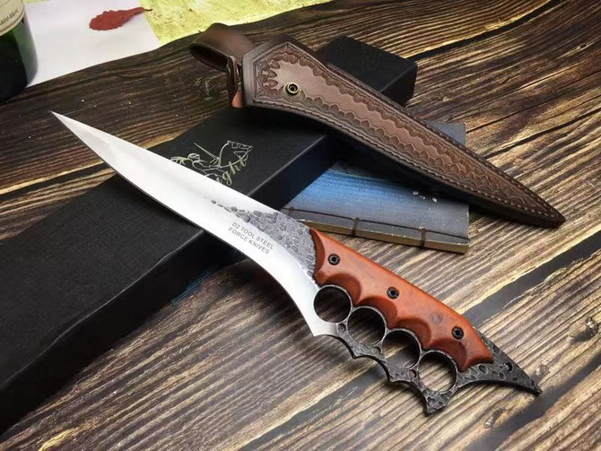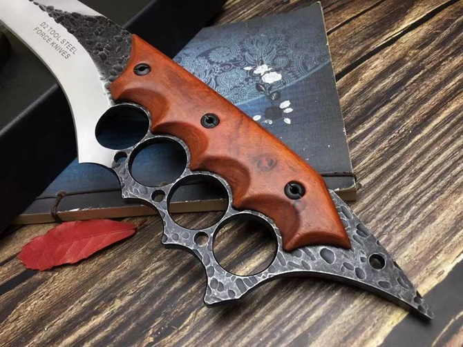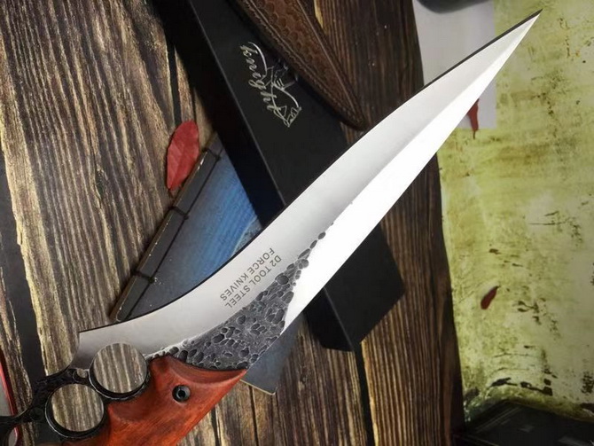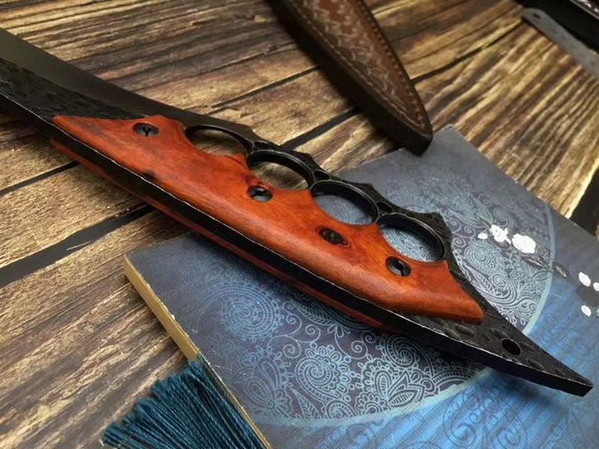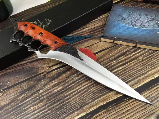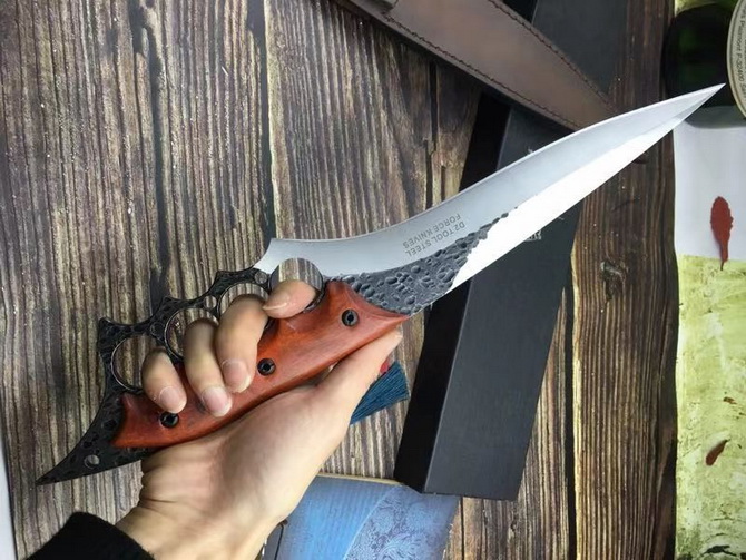 牧马人三号直刀 全长:39CM 刃长:26CM 柄长:约13CM 刀厚:0.55CM 刃面:砂光+锻打黑色 毛重:约600克(含手工皮套) 钢材::8cr13mov钢 硬度:58HRC(真空油冷热处理) 柄材:紫檀木 刀鞘:手工真皮套(锋利)