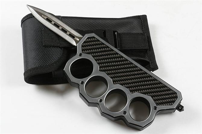 微技术拳套双锋直出跳刀 类型:直出弹簧刀 品牌:微技术 全长:23.8cm(含尾锥长度) 刃长:9.0cm 刃厚:3mm 刃材:440 硬度:57HRC 总重量:4700.0克(含包装物) 表面:沙光(刀刃) 柄材:锌铝合金+碳纤 刀鞘:尼龙 锁闭:弹簧直出 备注:带背夹和撞玻器