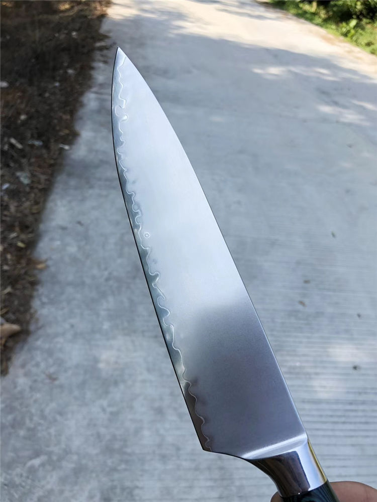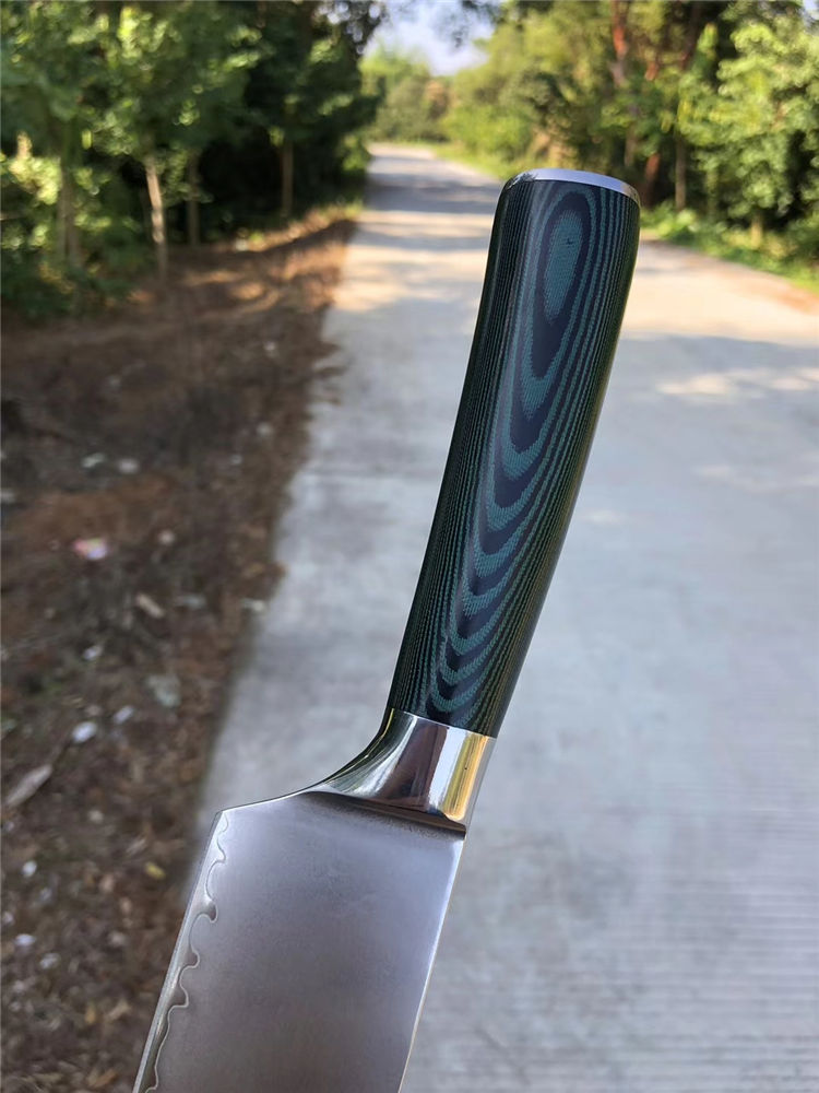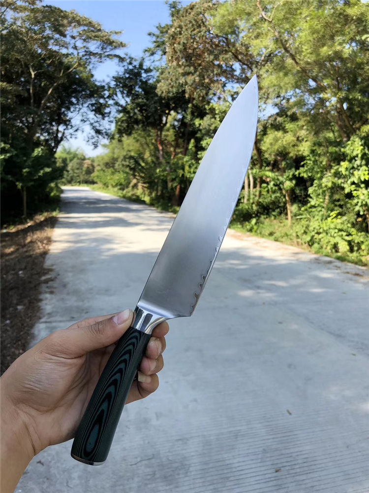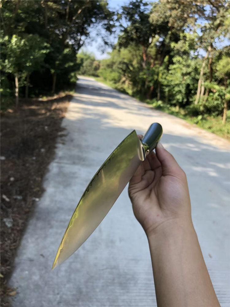 出口台湾8寸家用厨房刀 总长:33cm 刃长:21cm 手柄:12cm 刃材:进口三合钢 厚度:2.2mm 硬度:59HRC 手柄:进口米卡塔材料+钢头 包装:出口原手工盒