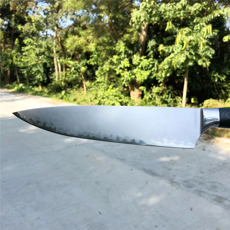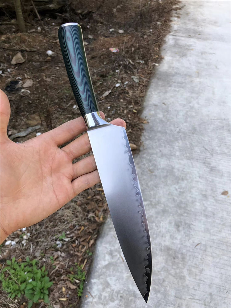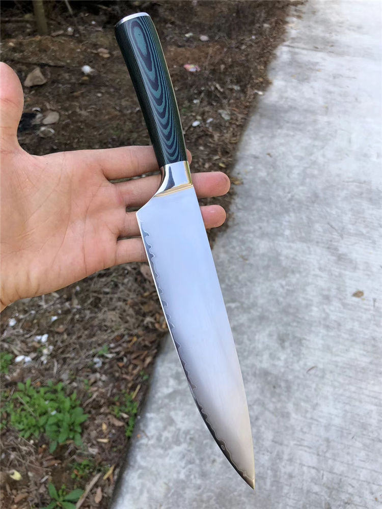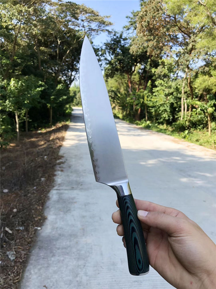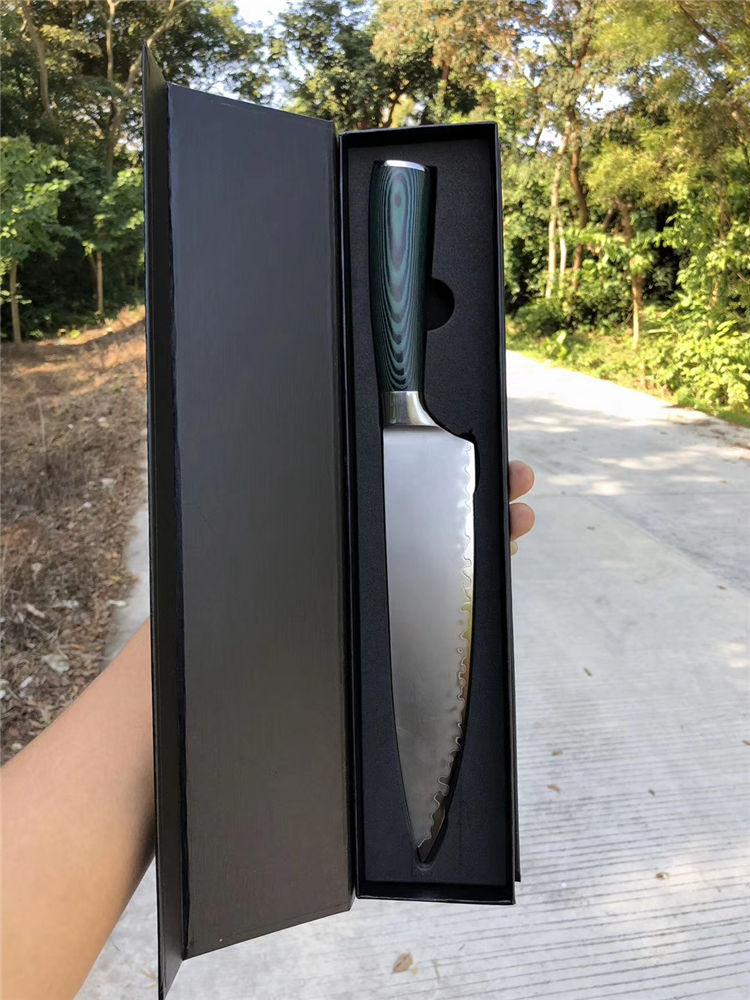 出口台湾8寸家用厨房刀 总长:33cm 刃长:21cm 手柄:12cm 刃材:进口三合钢 厚度:2.2mm 硬度:59HRC 手柄:进口米卡塔材料+钢头 包装:出口原手工盒