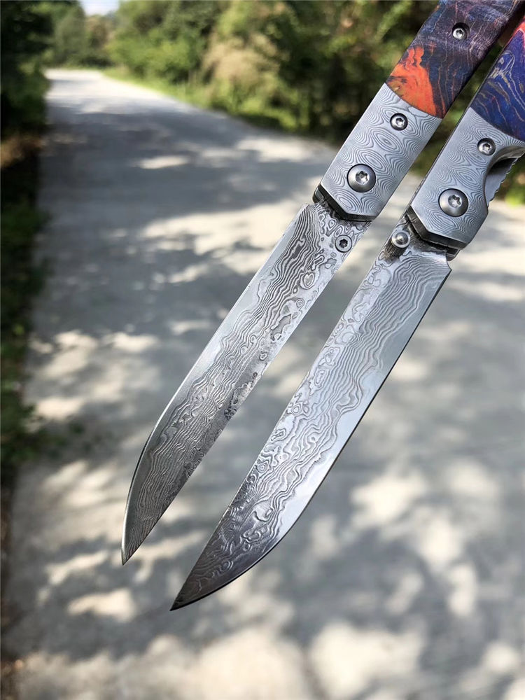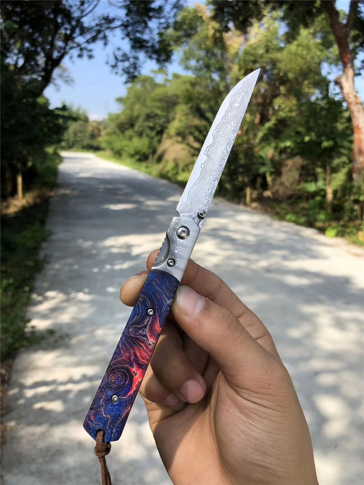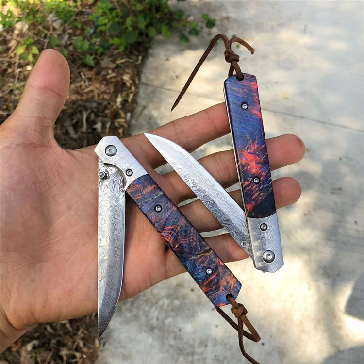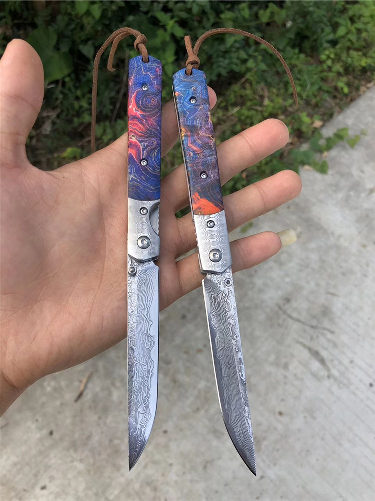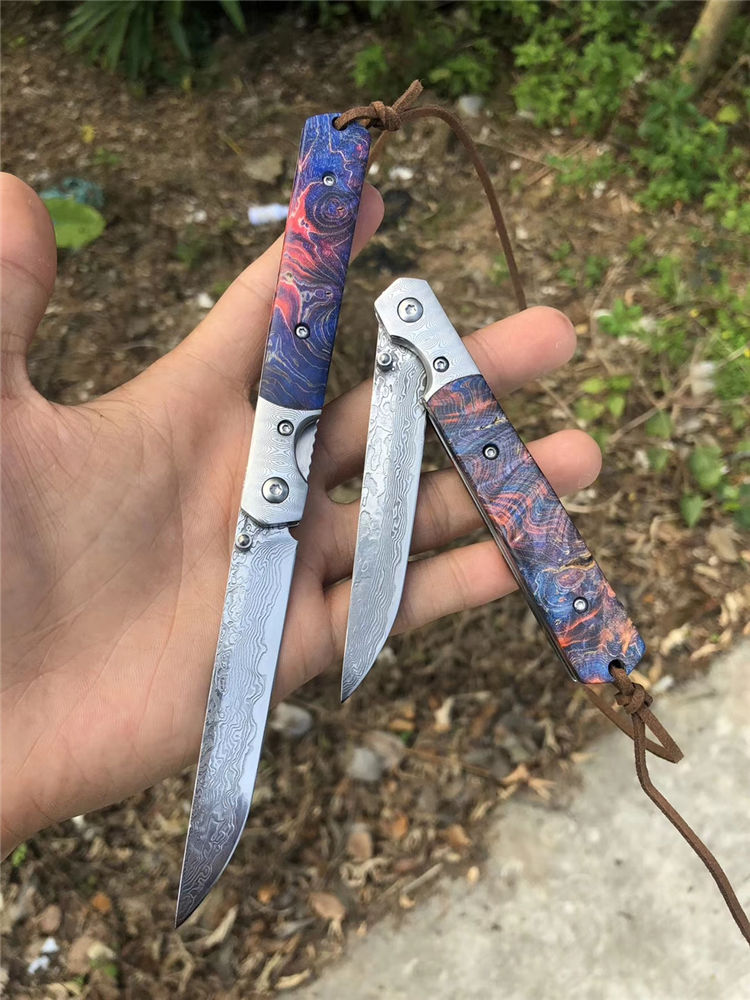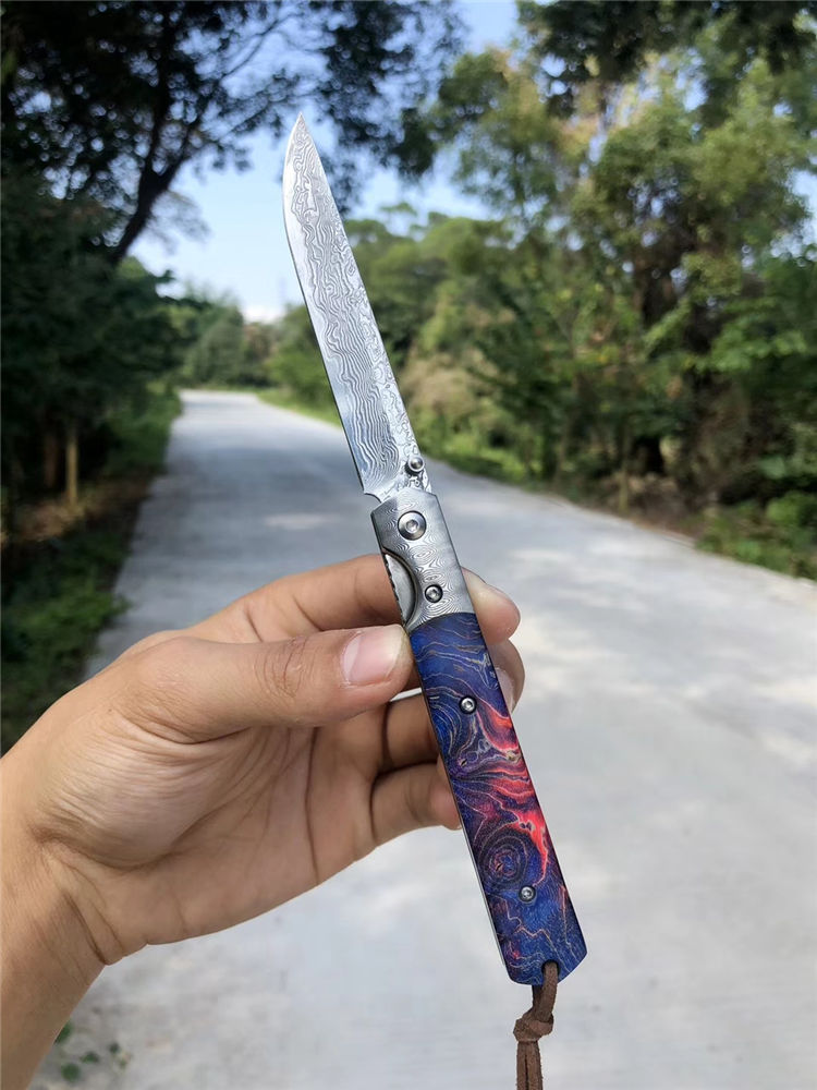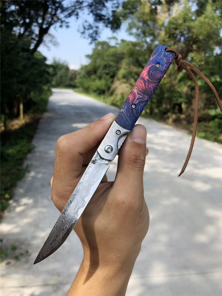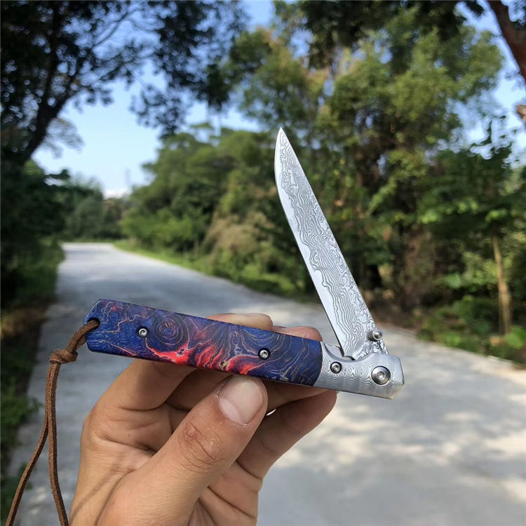 大马士革幻影折刀 总长:20cm 刃长:9cm 柄长:10.5cm 钢材:锻造大马士革钢 硬度:60HRC、真空热处理,手工开锋 厚度:2.1mm 柄材:大马士革钢头+固化稳定木 包装:手工盒 幻影系列/纯手工版制作,95层大马士革钢头+进口固化稳定木材搭配柄部幻彩星际,收藏玩把价值高,刃钢材,锻造大马士革钢VG10,真空热处理,硬度60HRC,老师傅手工开刃锋利度极高、轻松切割一切作业,喜欢的朋友不要错过机会