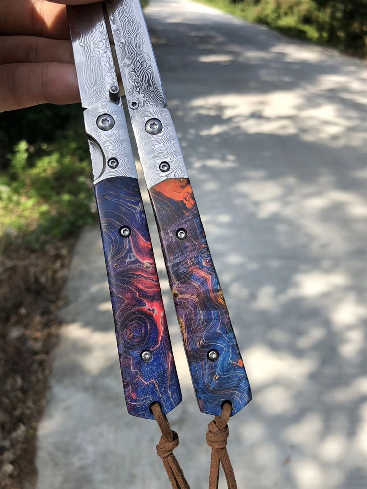 幻影系列/纯手工版制作,95层大马士革钢头+进口固化稳定木材搭配柄部幻彩星际,收藏玩把价值高,刃钢材,锻造大马士革钢VG10,真空热处理,硬度60HRC,老师傅手工开刃锋利度极高、轻松切割一切作业,喜欢的朋友不要错过机会