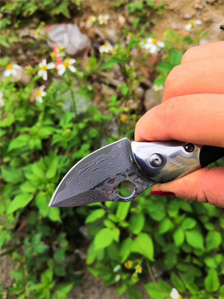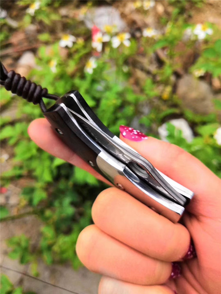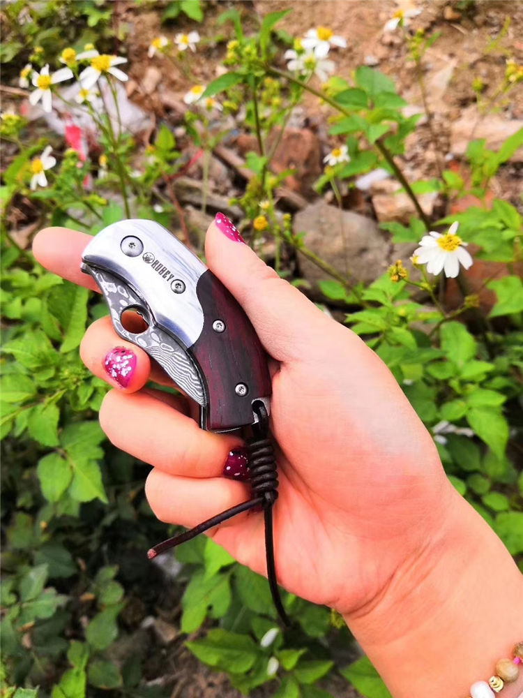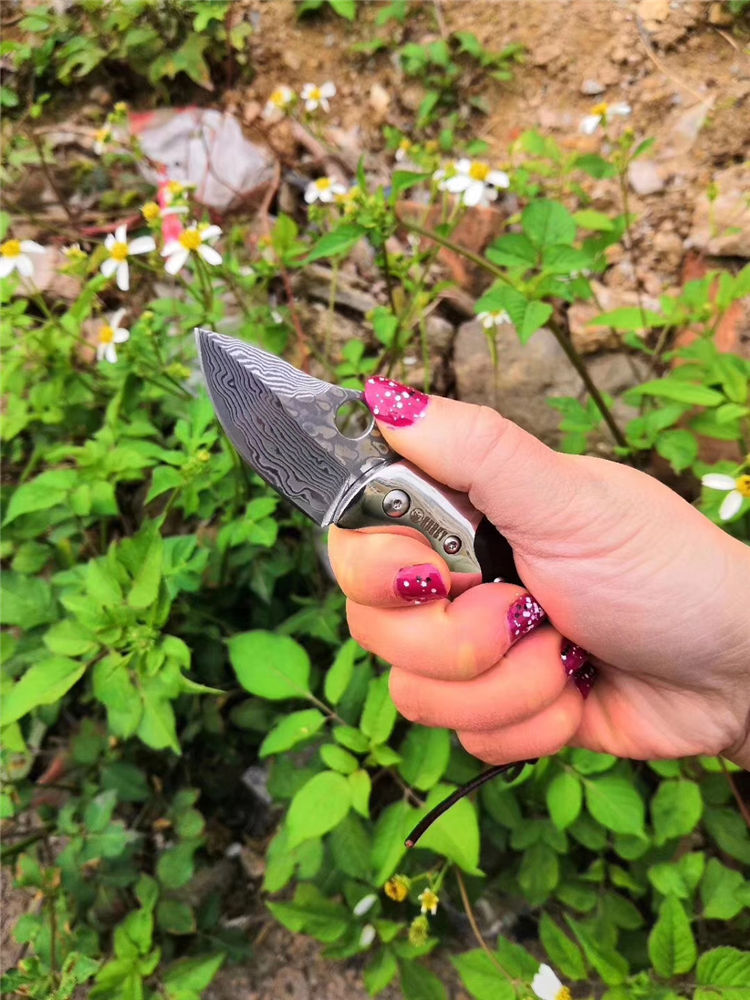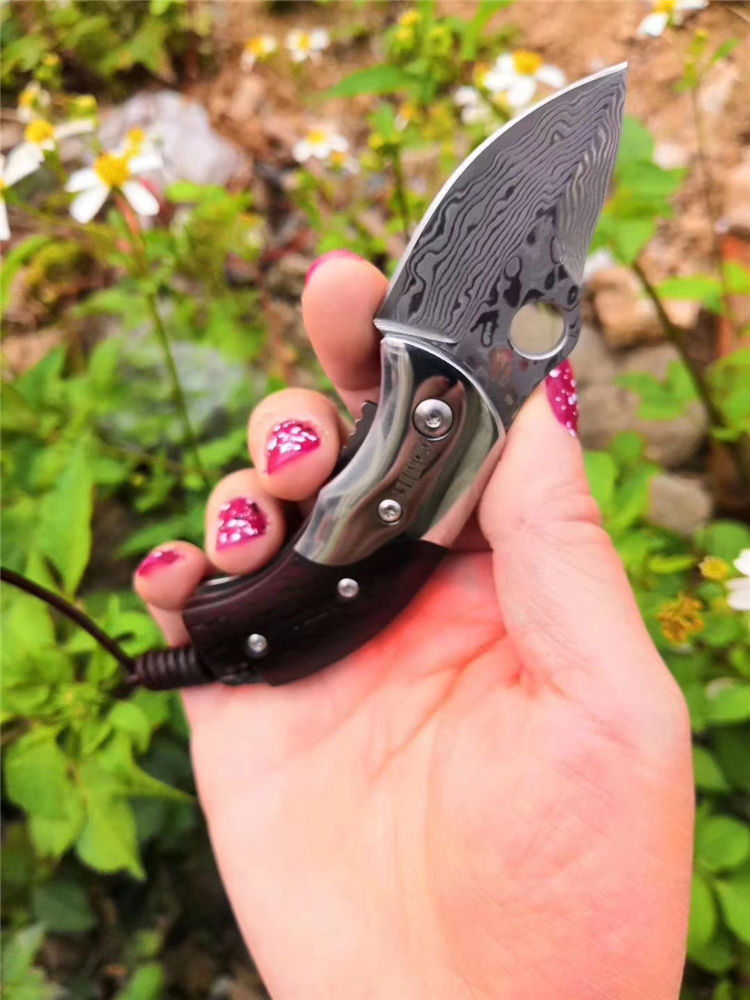 大马士革鸭嘴兽折刀 总长:11.5cm 闭合长度:6.7cm 刃长:4.8cm 刃宽:3cm 刃厚:2.9mm 硬度:58HRC 刃材:大马士革钢 柄长:6.7cm 柄材:科檀+不锈钢