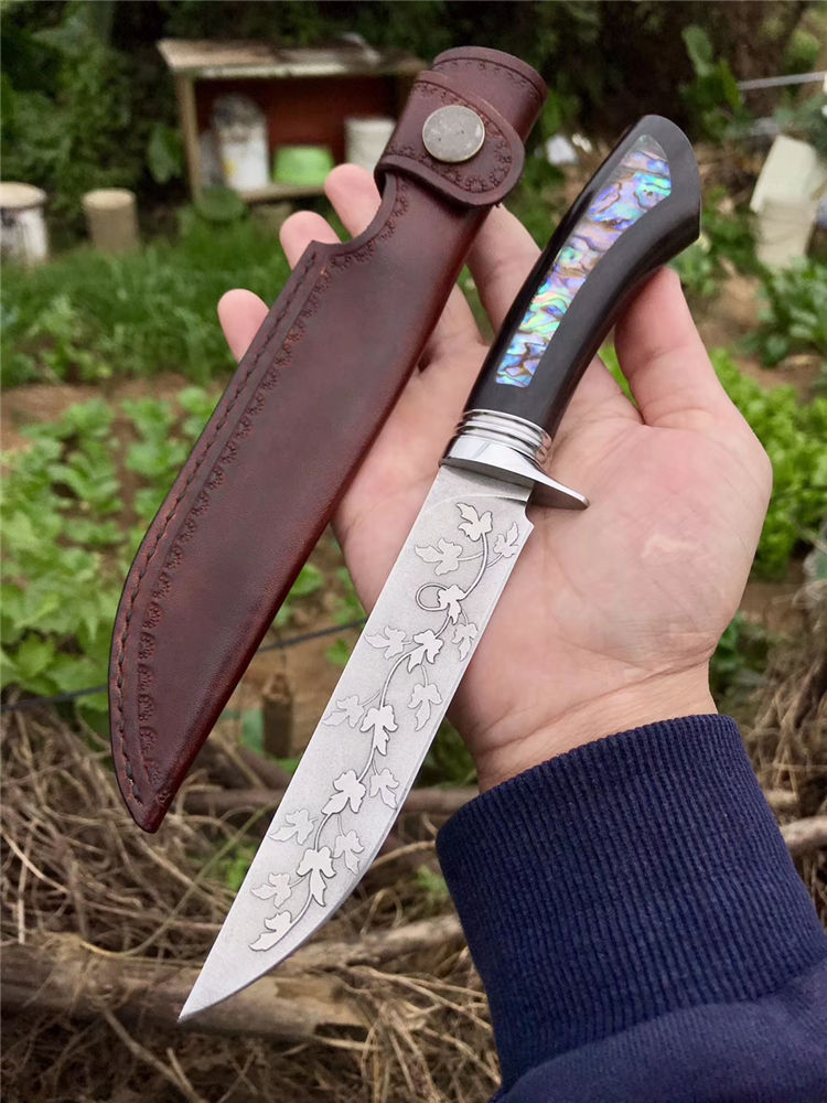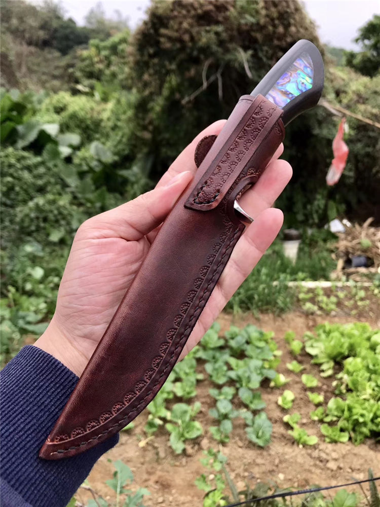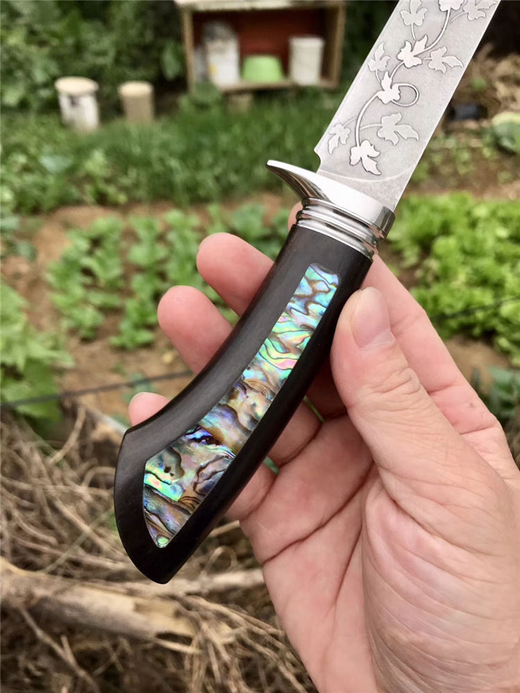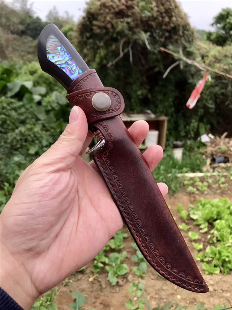 宁乐手工常青藤直刀 全长:24.3cm 刃长:13cm 柄长:11.3cm 刃宽:2.6cm 刃厚:0.4cm 钢材:VG10 柄材:黑檀木镶天然鲍鱼壳 硬度:60HRC 配:手工缝制皮套