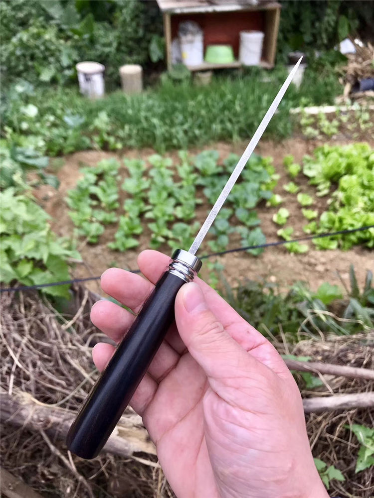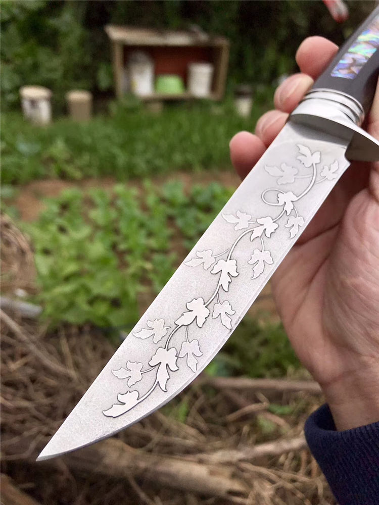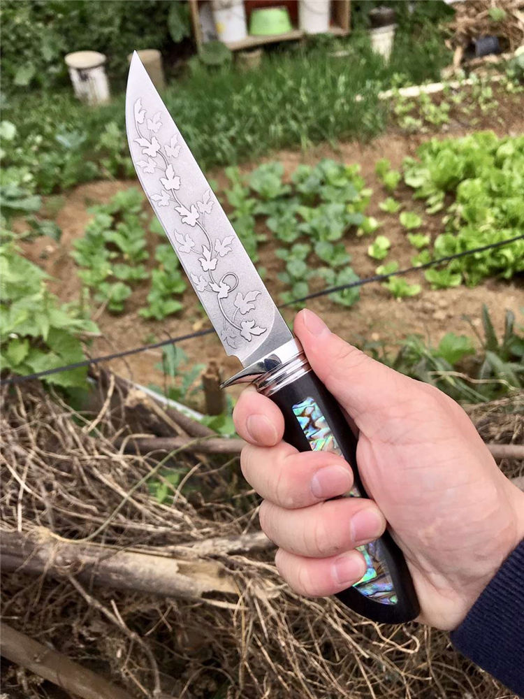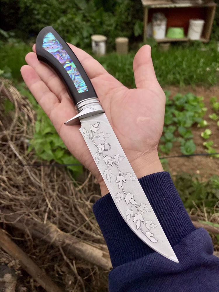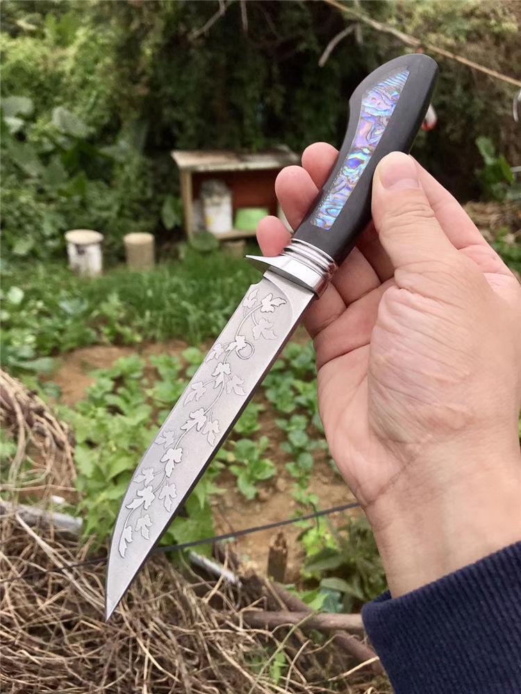 宁乐手工常青藤直刀 全长:24.3cm 刃长:13cm 柄长:11.3cm 刃宽:2.6cm 刃厚:0.4cm 钢材:VG10 柄材:黑檀木镶天然鲍鱼壳 硬度:60HRC 配:手工缝制皮套