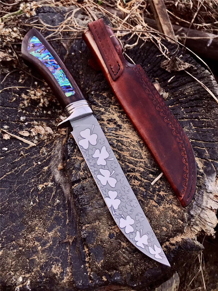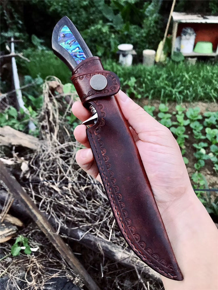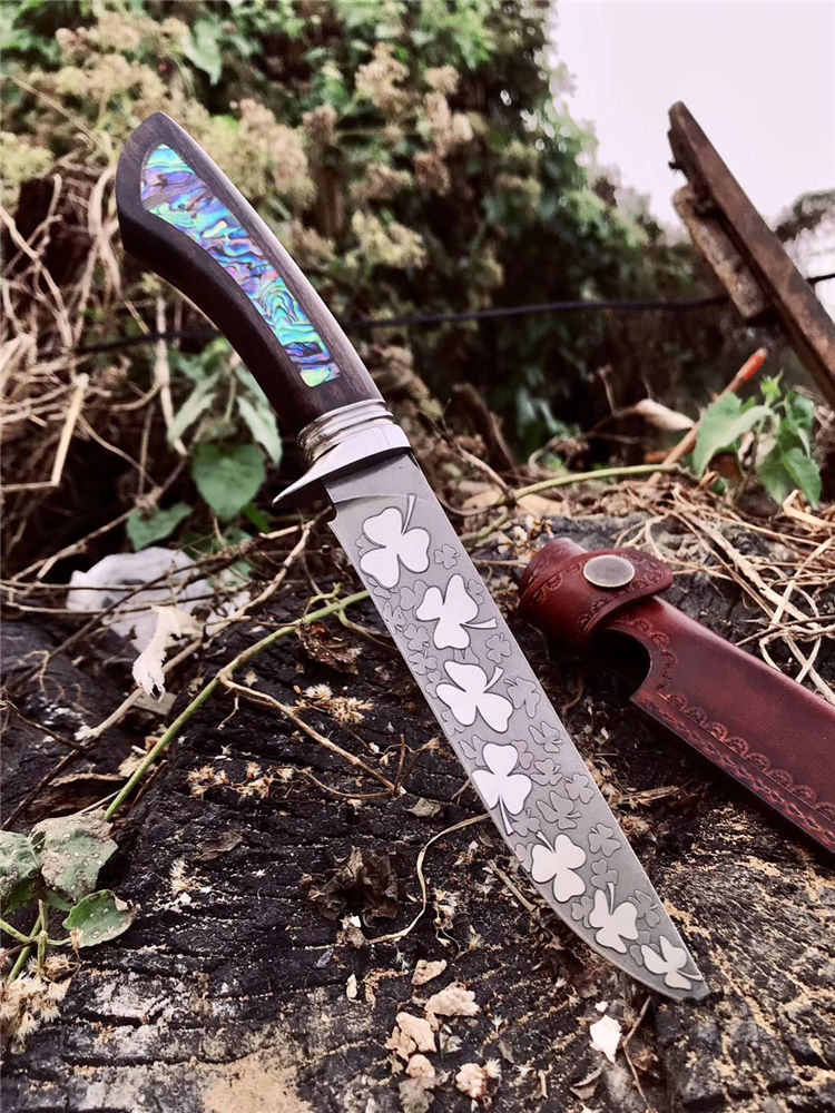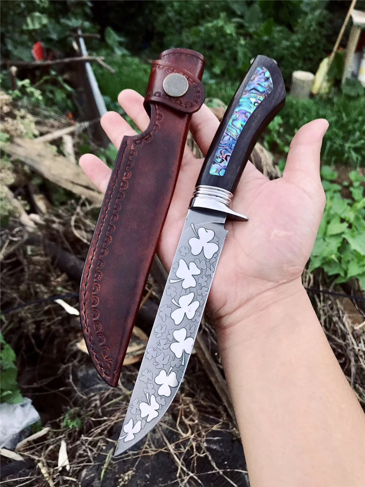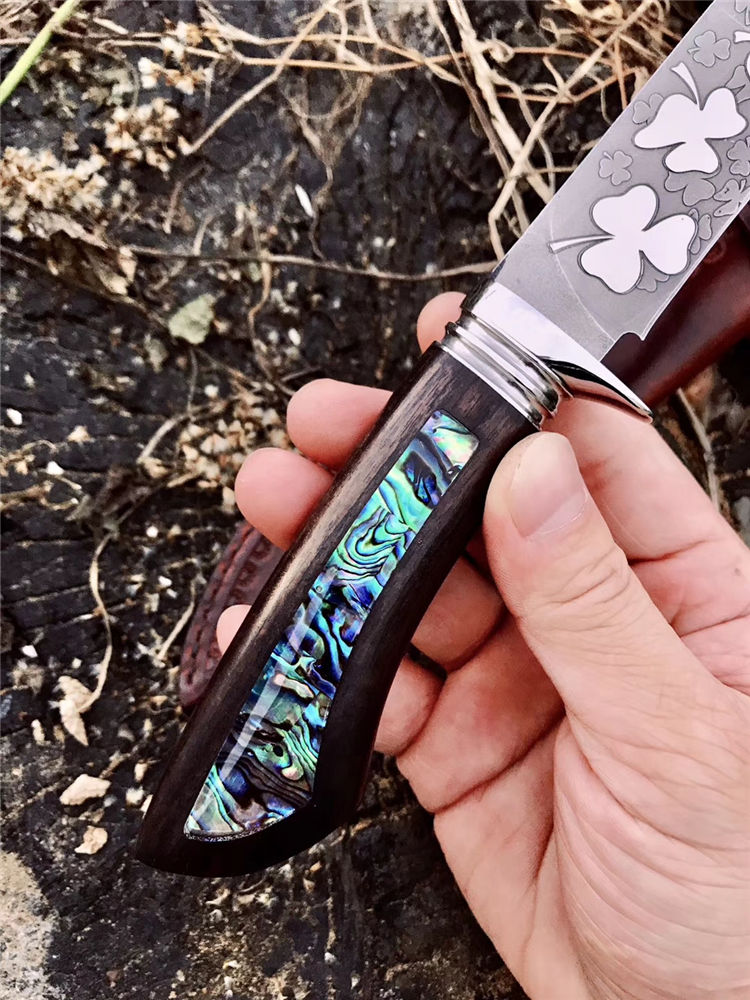 宁乐手工三叶草直刀 全长:24.3cm 刃长:13cm 柄长:11.3cm 刃宽:2.6cm 刃厚:0.4cm 钢材:VG10 柄材:黑檀木镶天然鲍鱼壳 硬度:60HRC 配:手工缝制皮套
