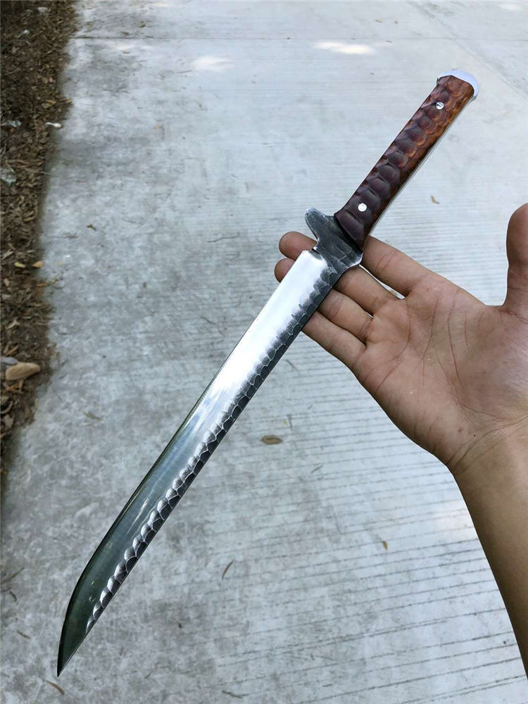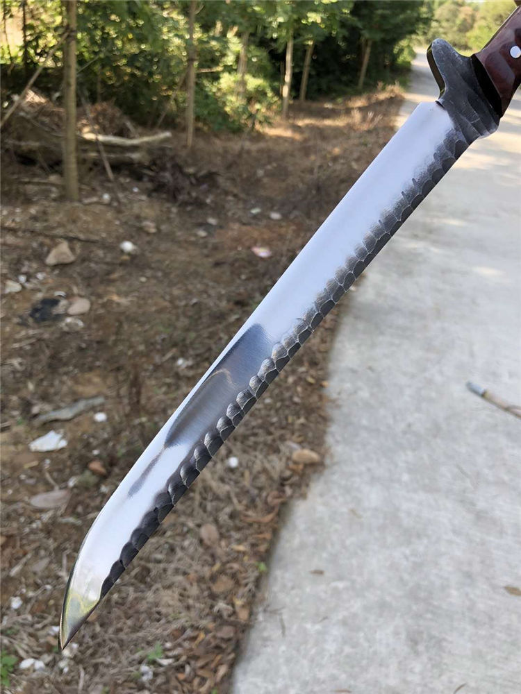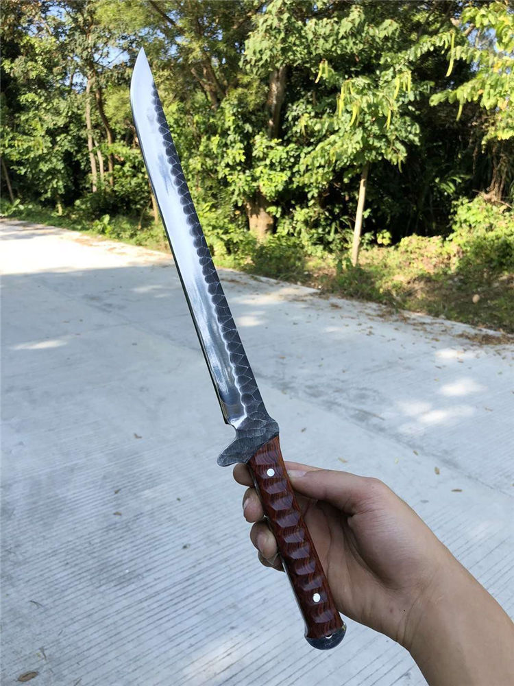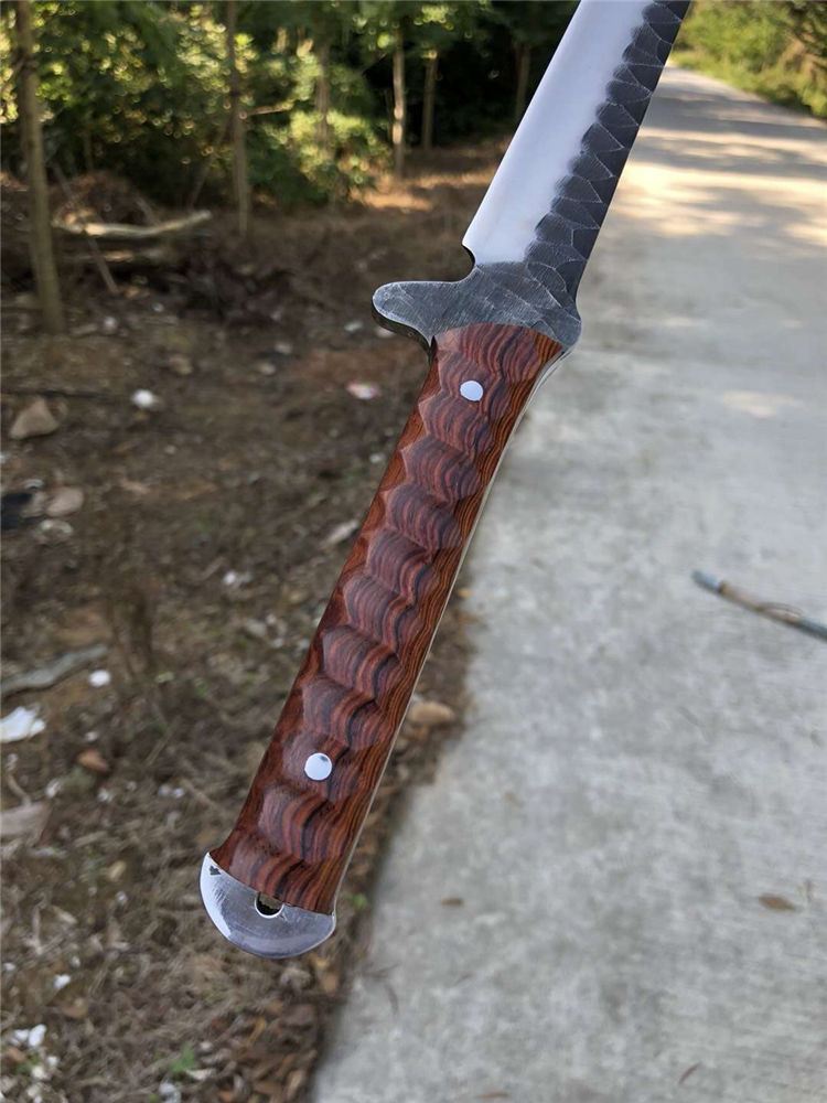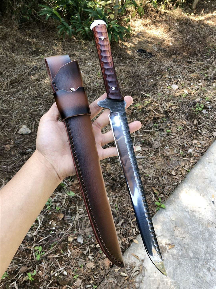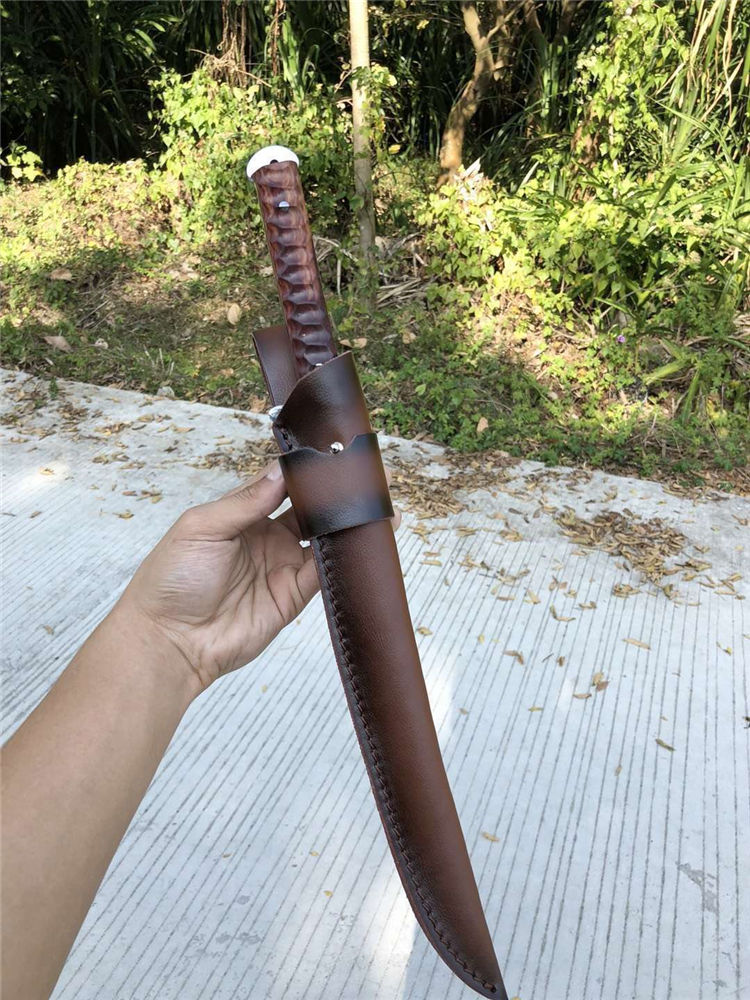 手工沼泽鼠武士刀 总长:44cm 刃长:28.5cm 柄长:14cm 厚度:5.5MM 钢材:进口高速钢、真空热处理 硬度:61HRC 柄材:进口红酸枝木 搭配:手工牛皮套 高端武士,大师作品,进口一体高速钢锻造制作,纯手工表面雕工沧桑复古效果,刃部镜光效果出色,首批数量150把,手工开刃方式,蛤刃,非常锋利,造型相当霸气,柄部搭配进口红酸枝木材手工打磨山丘式防滑效果,佩手工牛皮套