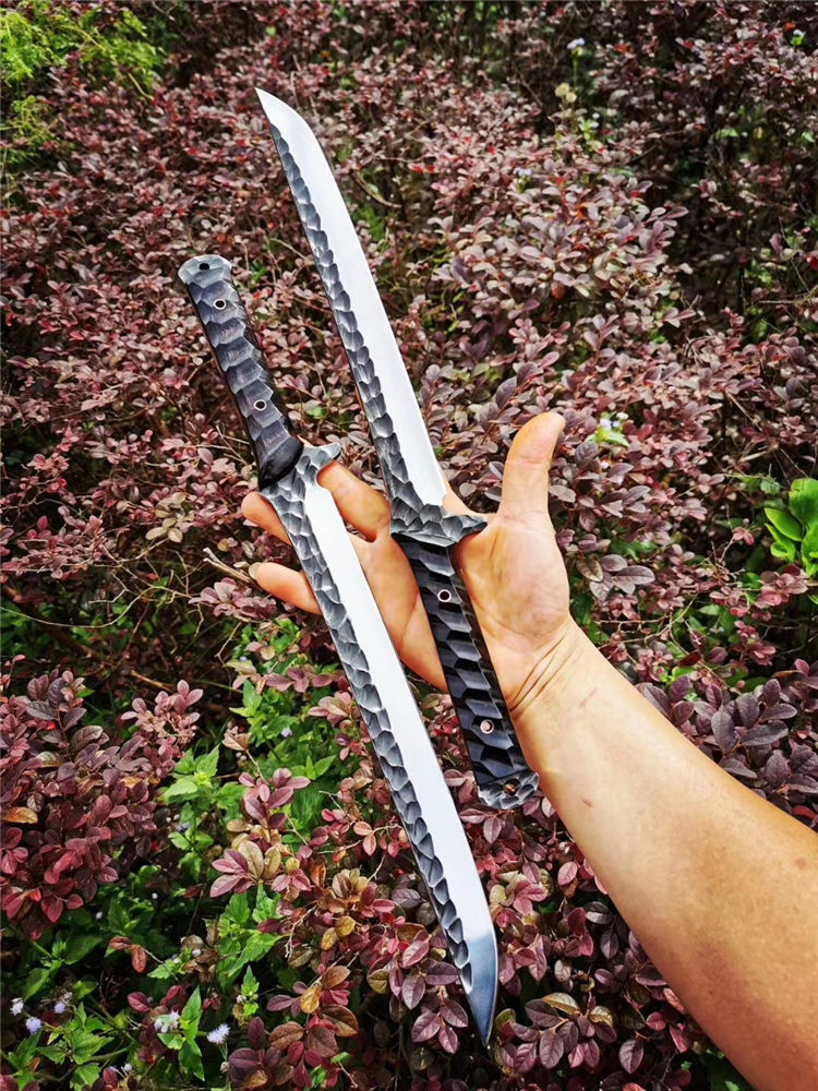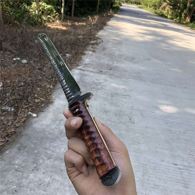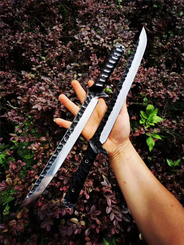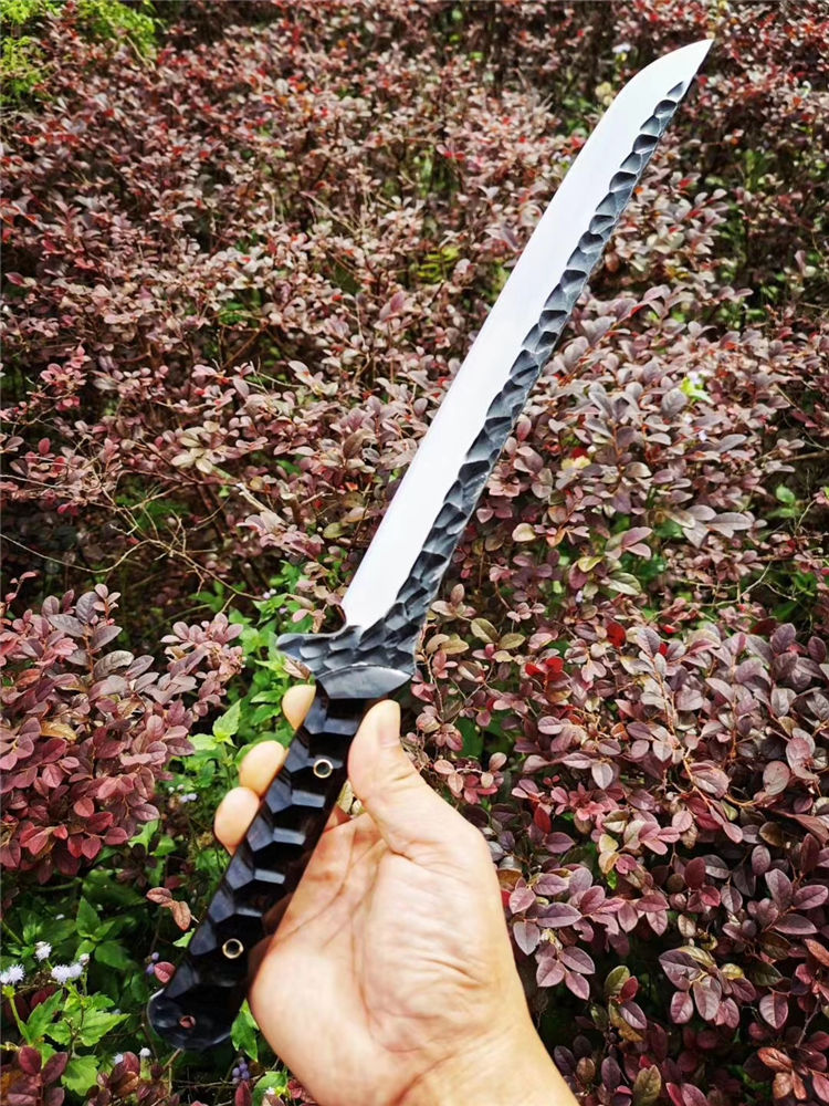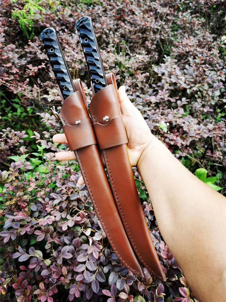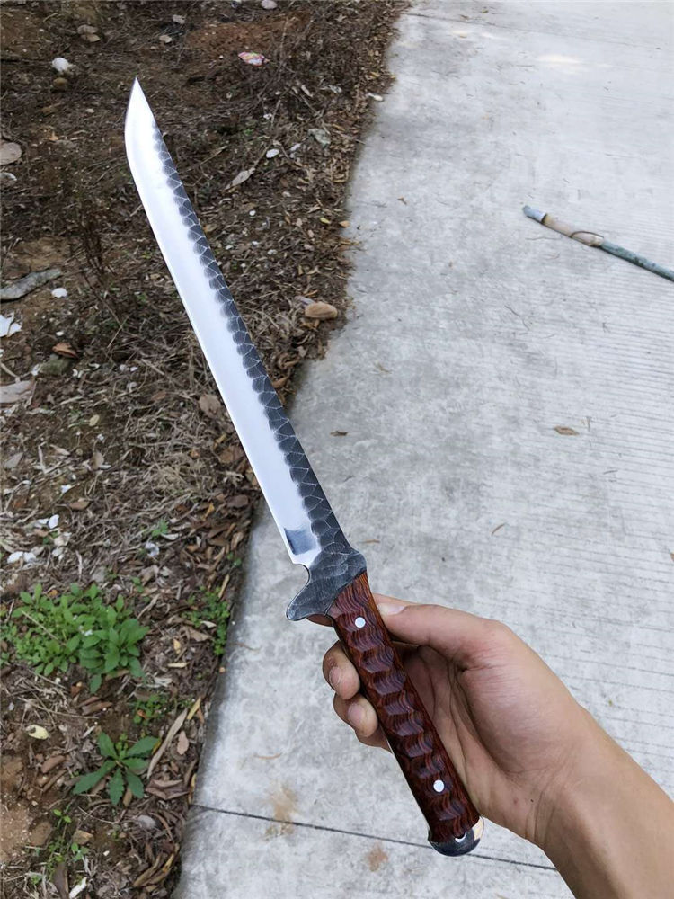 手工沼泽鼠武士刀 总长:44cm 刃长:28.5cm 柄长:14cm 厚度:5.5MM 钢材:进口高速钢、真空热处理 硬度:61HRC 柄材:进口红酸枝木 搭配:手工牛皮套 高端武士,大师作品,进口一体高速钢锻造制作,纯手工表面雕工沧桑复古效果,刃部镜光效果出色,首批数量150把,手工开刃方式,蛤刃,非常锋利,造型相当霸气,柄部搭配进口红酸枝木材手工打磨山丘式防滑效果,佩手工牛皮套