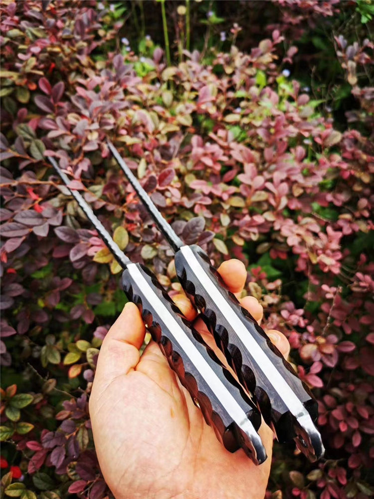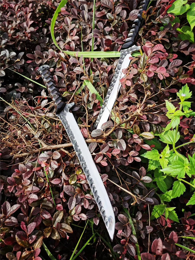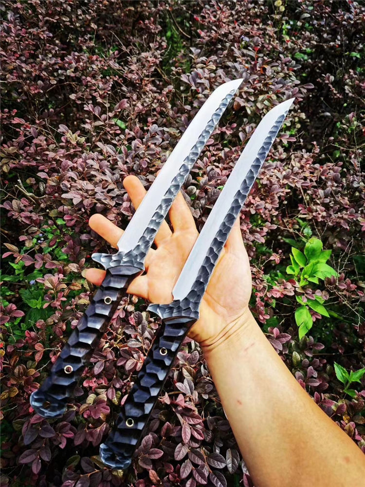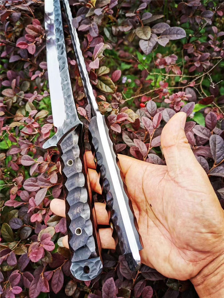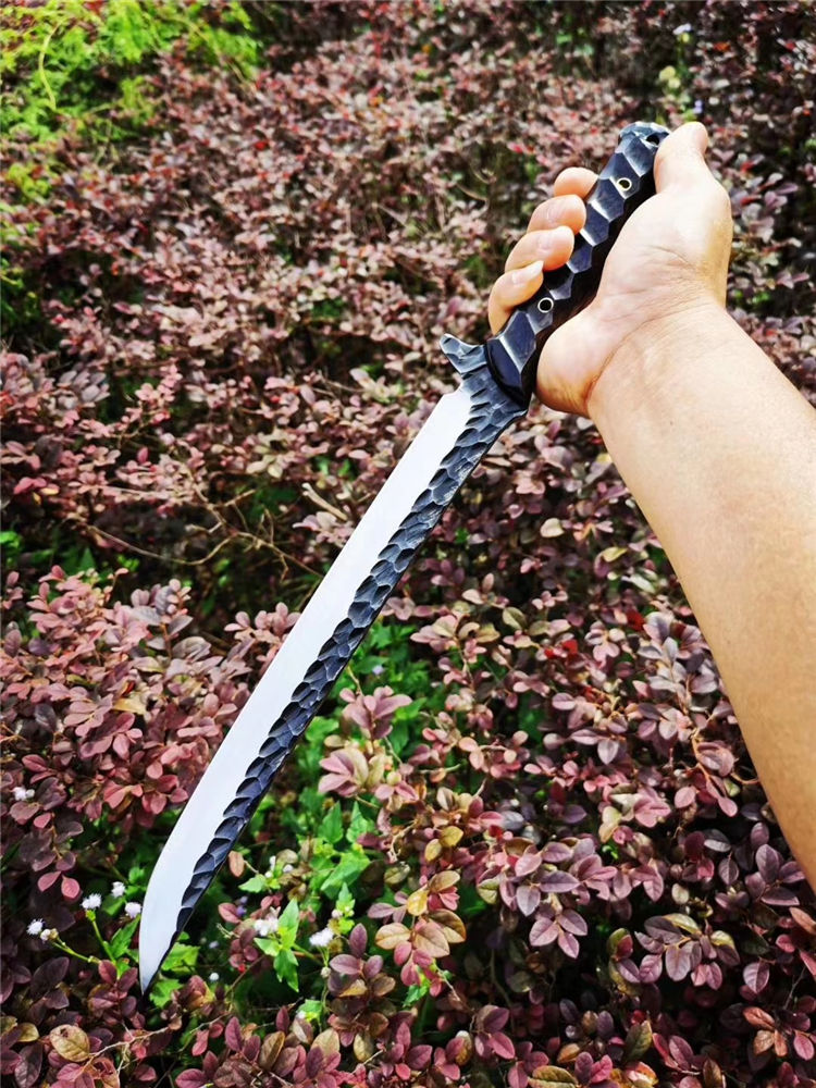 高端武士,大师作品,进口一体高速钢锻造制作,纯手工表面雕工沧桑复古效果,刃部镜光效果出色,首批数量150把,手工开刃方式,蛤刃,非常锋利,造型相当霸气,柄部搭配进口红酸枝木材手工打磨山丘式防滑效果,佩手工牛皮套