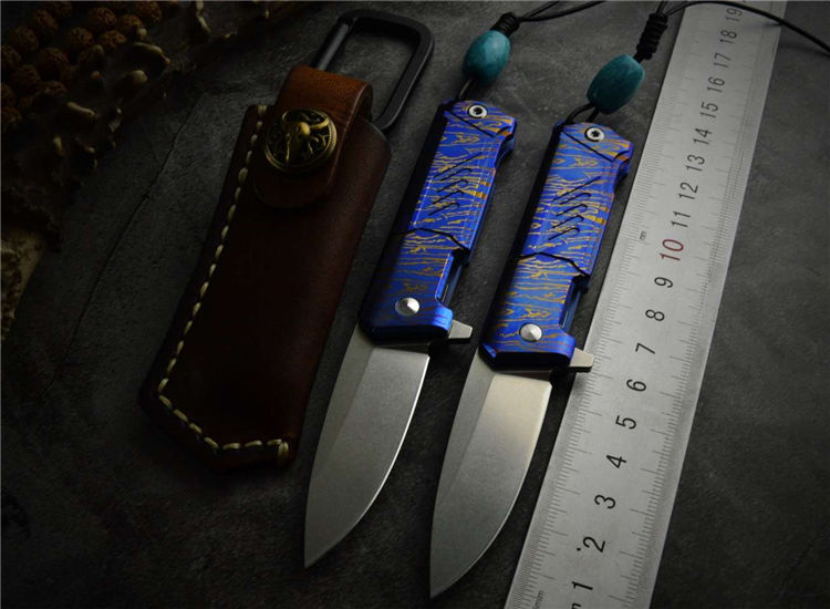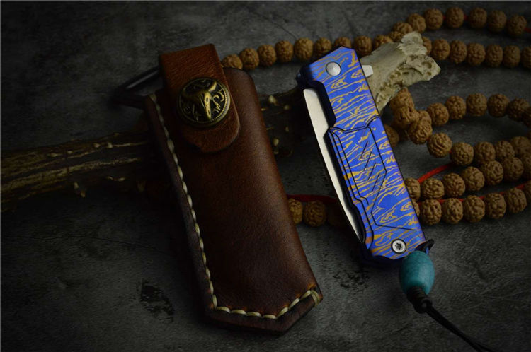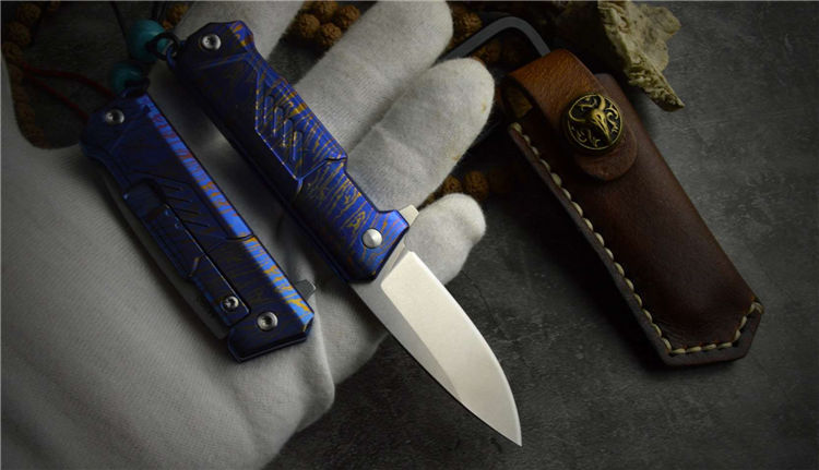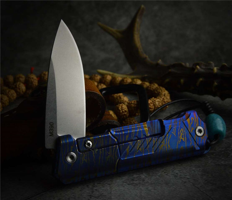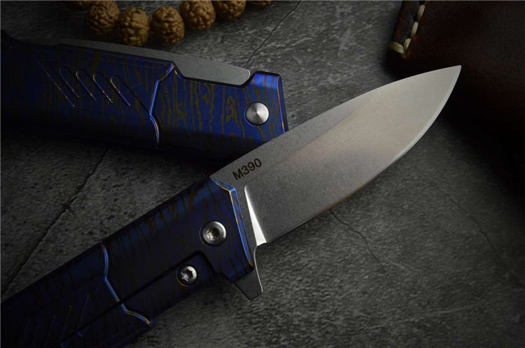 M390小金钢折刀 总长:13cm 刃长:5.5cm 刃厚:2.5mm 刃宽:1.8cm 柄材:TC4钛合金 轴承:陶瓷滚珠轴承 钢材:奥地利进口m390粉末钢 表面效果:精幼石洗 配置:头层牛皮刀套 小金钢m390粉末钢快开陶瓷轴承折刀震撼上市,自主设计开发,质量保证,进口奥地利m390粉末钢。手柄采用TC4钛合金,表面烤亮蓝色激大马纹工艺设计。陶瓷轴承结构,开合顺畅,专业真空热处理,硬度在60-61HRC之间,韧性与保持性防锈性对于m390钢被称为综合性最好的神钢