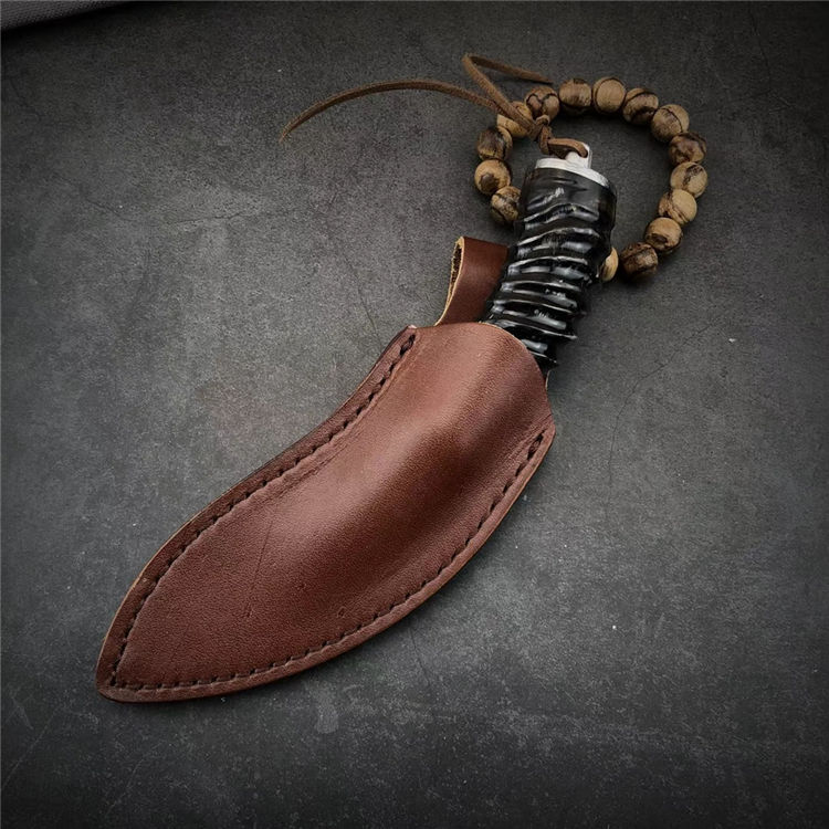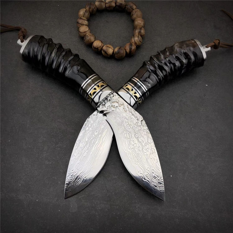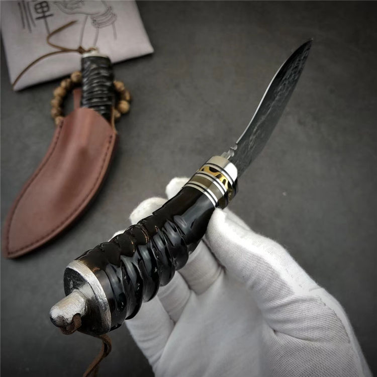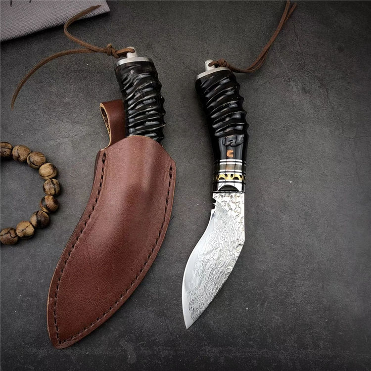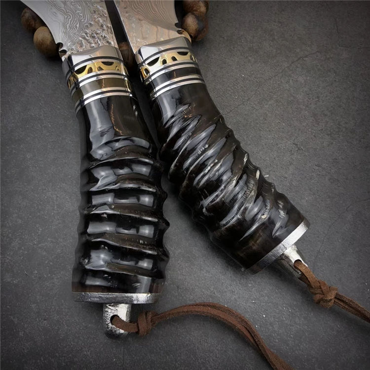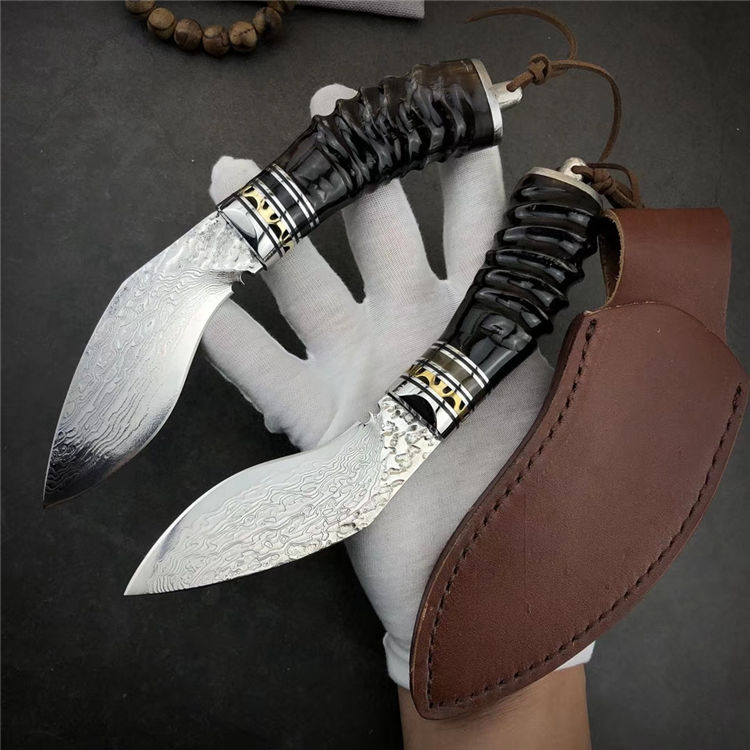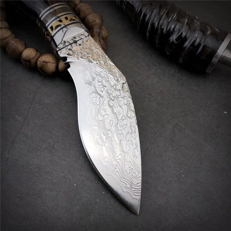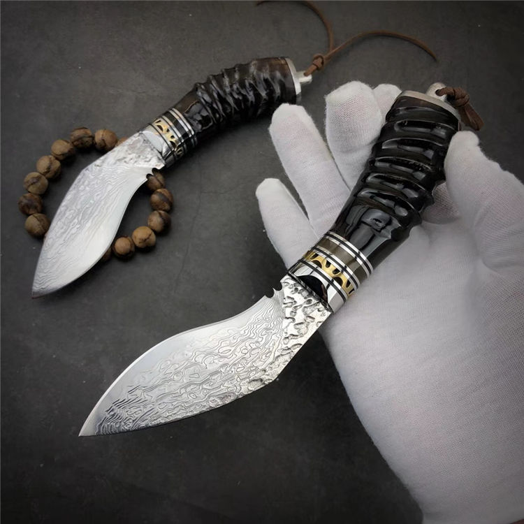 大马士革黄羊角小狗腿弯刀 总长:19.5cm 刃长:9.5cm 手柄:10.5cm 刃厚:4mm 刃宽:4cm 钢材:大马士革钢,祥云纹 硬度:59-60HRC 刃材:大马士革钢VG10制作、手工研磨抛光完成、每把全新无暇 配:真牛皮套+高档包装盒