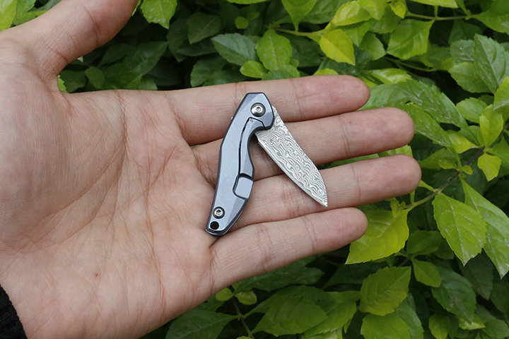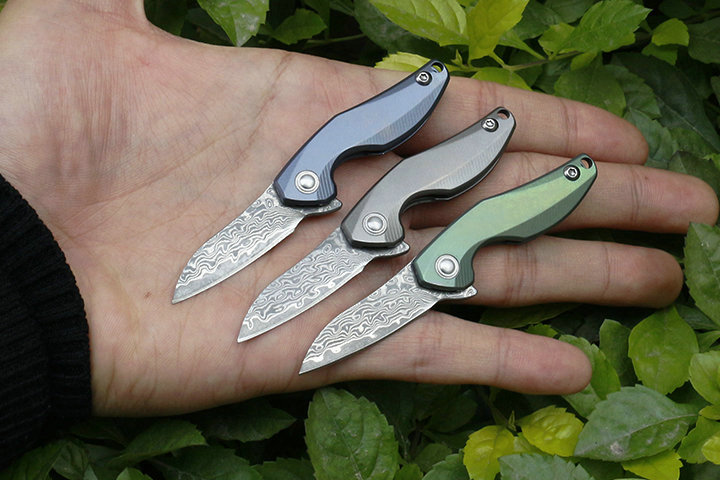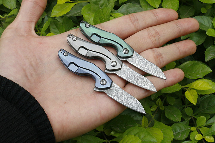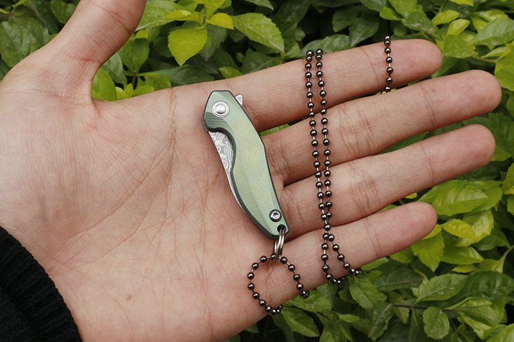 大马士革JJ005钛柄快开折刀 品名:轴承快开折刀 全长:8.7cm 刃长:3.5cm 柄长:5.2cm 刃宽:1.2cm 刃厚:2.0mm 刃材:VG10大马士革 重量:60g(含包装) 硬度:57-58HRC 表面:大马士革原有纹 柄材:钛柄(绿色+灰色+蓝色三种,下单请注明) 锁型:侧锁 其他:铁盒+项练,可以扣在匙扣上,方便户外削切小用途