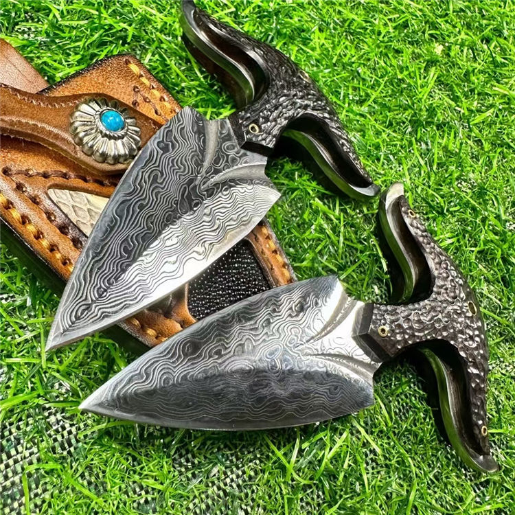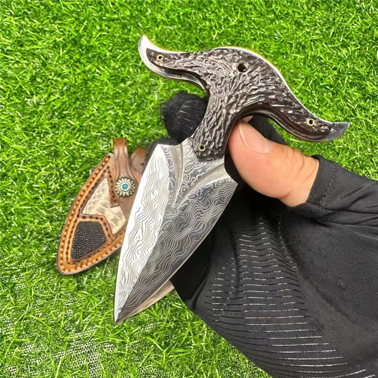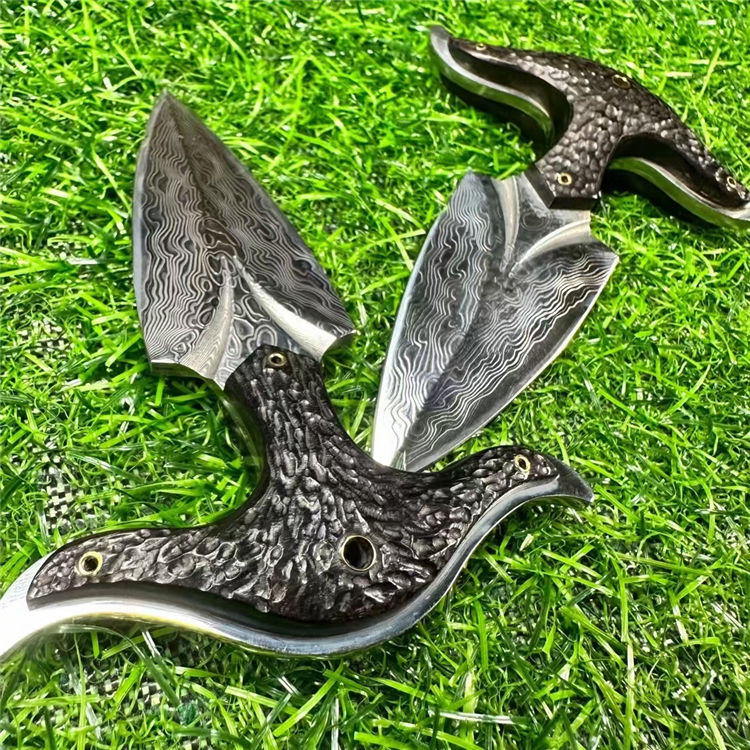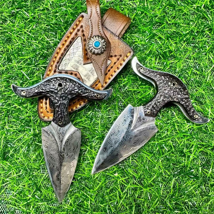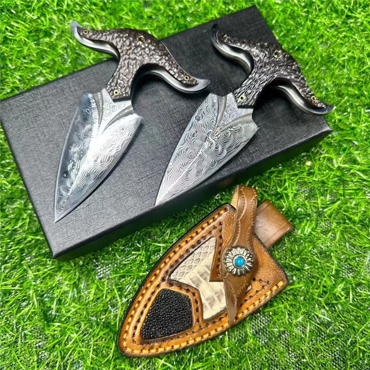 大马士革牛魔王手刺 全长:12cm 刃长:7cm 手柄:5cm 刃宽:3.4cm 厚度:3.2mm 钢材:进口锻造大马士革钢 硬度:60HRC 柄材:名贵黑檀木手工雕刻凹凸纹理 皮套:意大利进口优质手工雕花皮套镶嵌蛇皮 包装:手工礼盒包装 进口锻造大马士革钢(90层)真空热处理,硬度60HRC,表面雕刻双条气槽非常霸气,手柄搭配名贵黑檀木,手工雕刻表面不规则凹凸花纹,防滑耐磨性极高