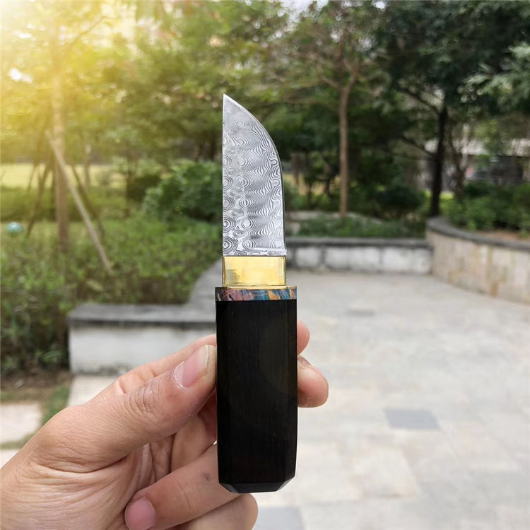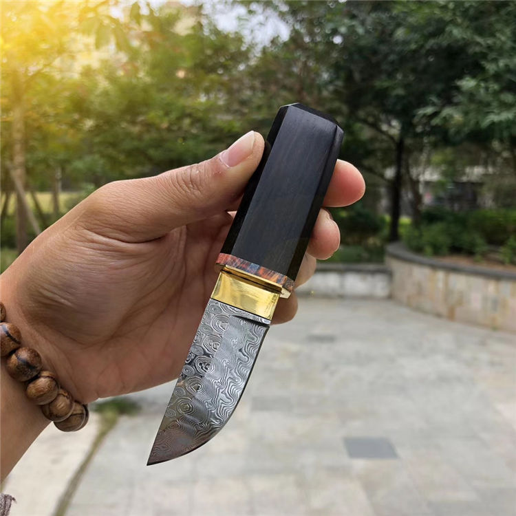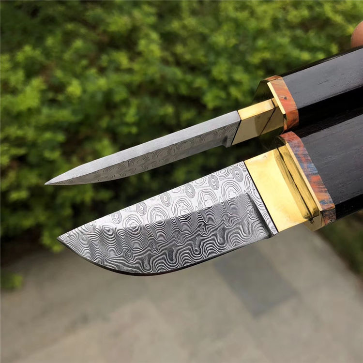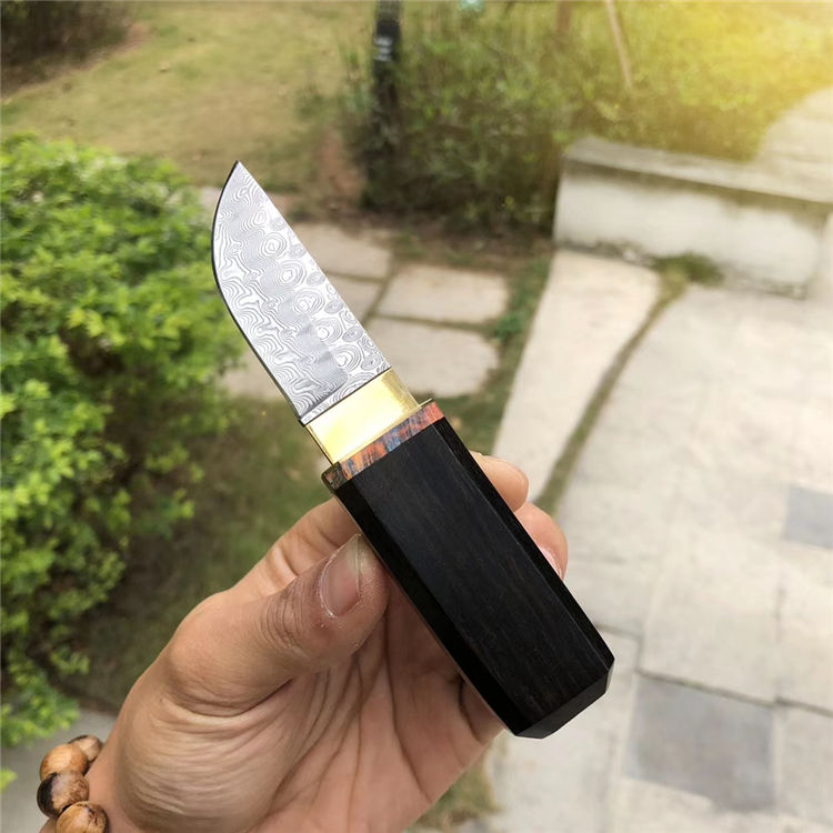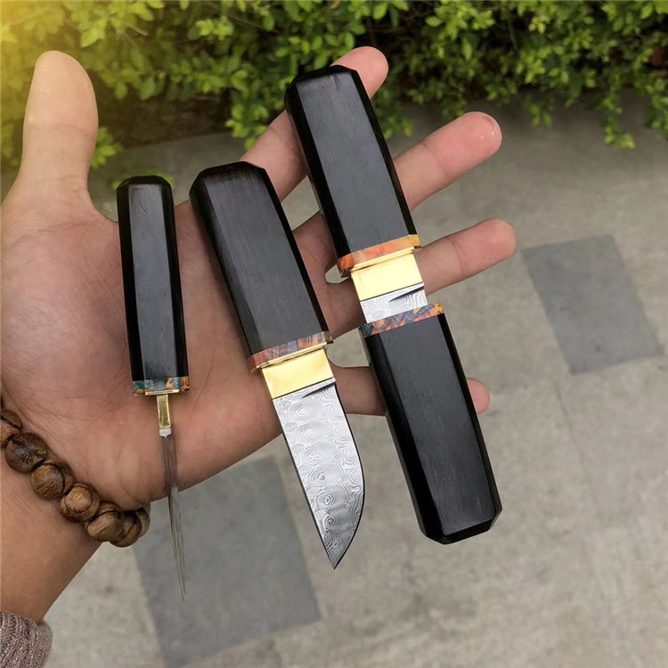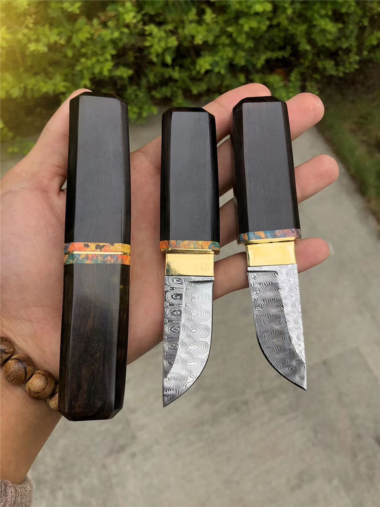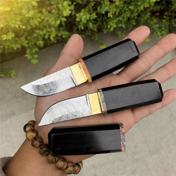 大马士革肥守小武士刀 全长:14cm 刃长:7cm 柄长:6.5cm 刃宽:2.2cm 厚度:3mm 钢材:进口锻造无钢芯层大马士革钢 硬度:60-61HRC,真空热处理,表面抛光效果 开刃方式:水冷手工二次开刃 柄材:名贵黑檀木+进口固化稳定木材隔片 鞘:黑檀木 包装:黄色盒子包装 不要怀疑好不好,无论做工用料都是非常不错配置,平时收藏或者是户外使用都非常实用,安全,放在家可以镇宅摆设也是很高的档次,天然名贵黑檀木独一无二,每一把都是手工师傅匠心之作,好货!喜欢尽快下手