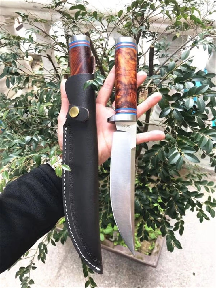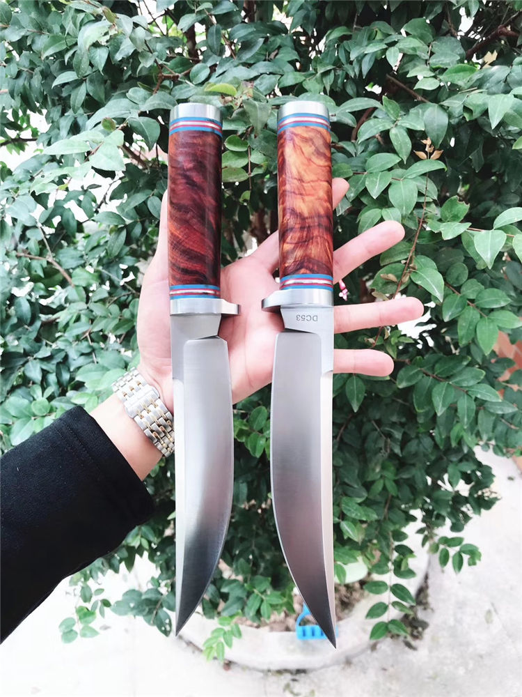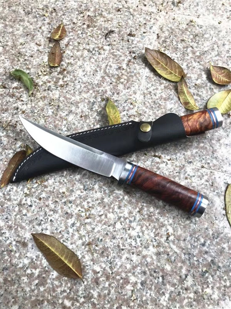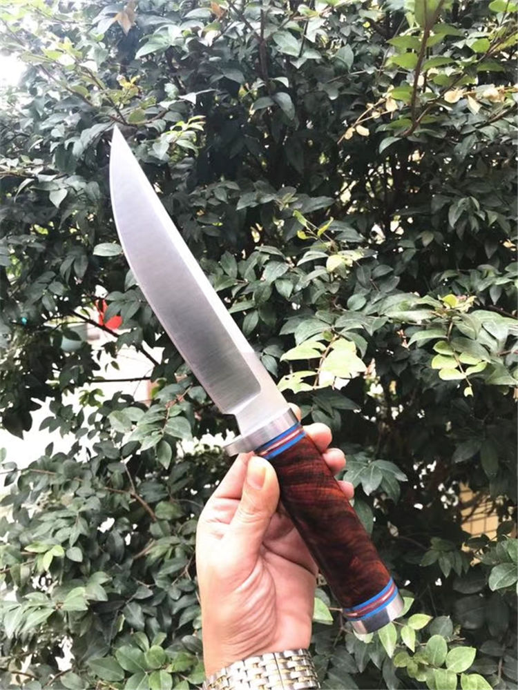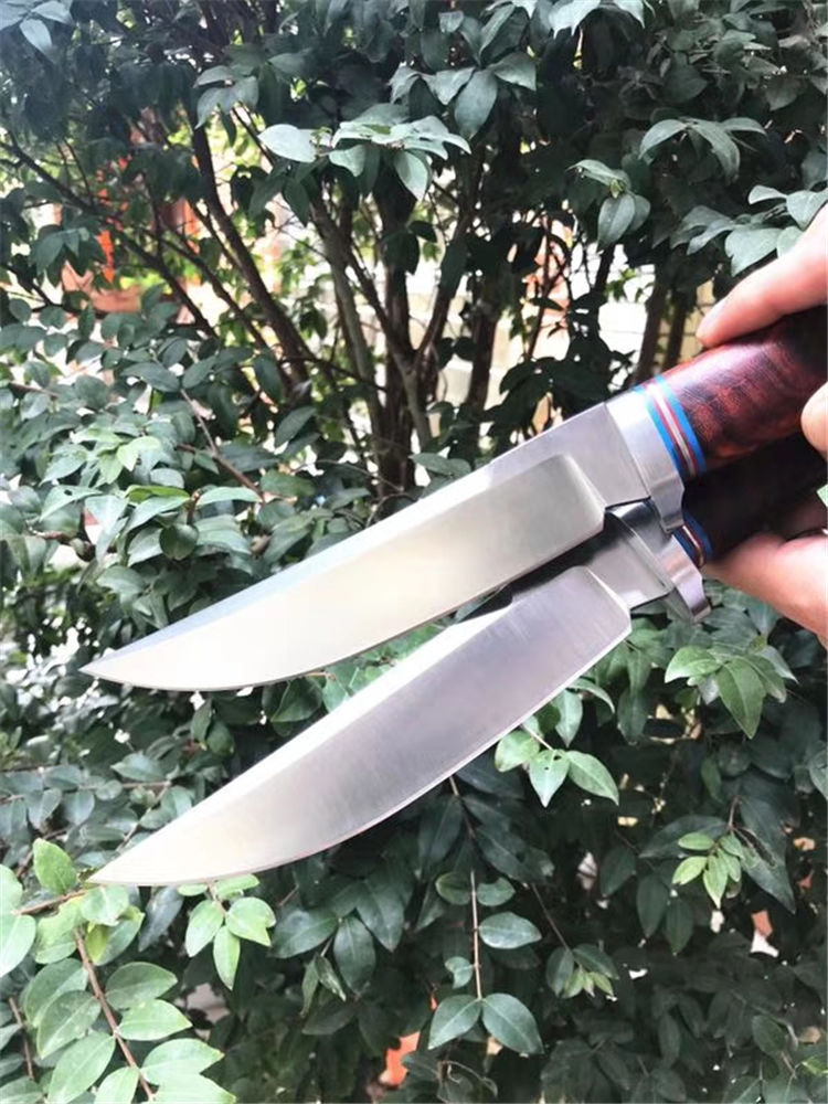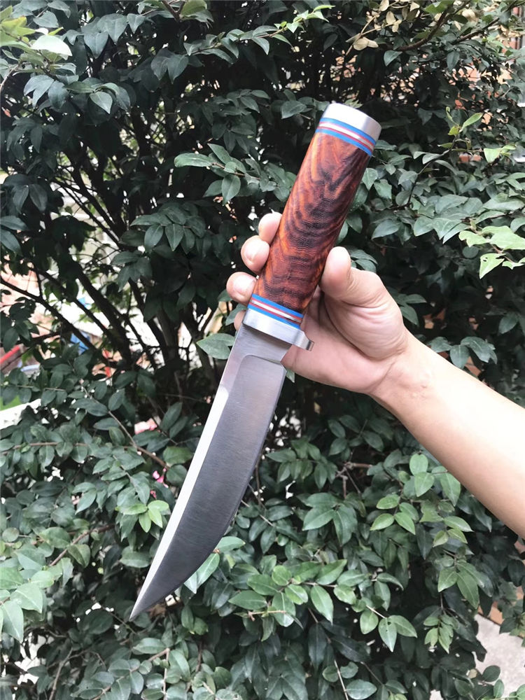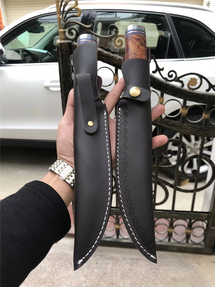 苏科特蛮牛猎刀 全长:297mm 刃长:177mm 柄长:120mm 刃宽:34mm 刃厚:5mm 刃材:进口DC53钢 重量:490g(含包装) 硬度:60HRC 表面:砂光 柄材:黄金檀+钢+蓝色G10+红色G10 锁型:定锁 其他:配牛皮套
