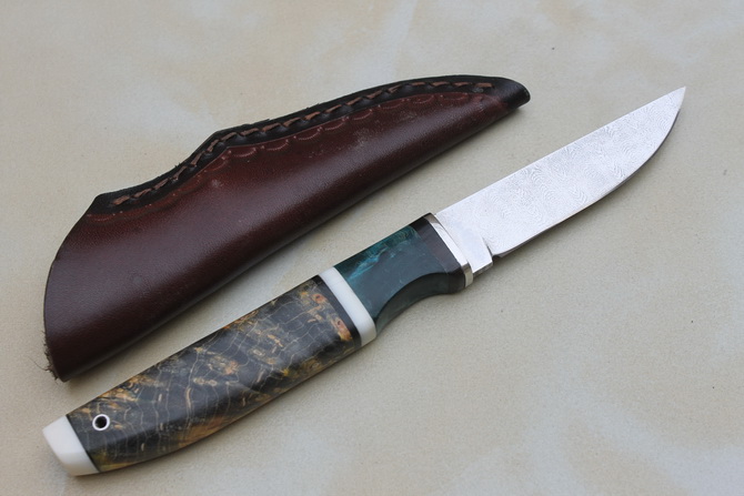 大马士革托马斯刃材猎刀 全长:190mm 刃长:75mm 刃厚:3mm 刃宽:18mm 材料:托马斯刃材 硬度:59-60 手柄:搭配钢头+黑木+进口固化稳定木材+白骨头 此款小刀是根据一些内蒙客户用的吃肉小刀改款,手感好,手工现货