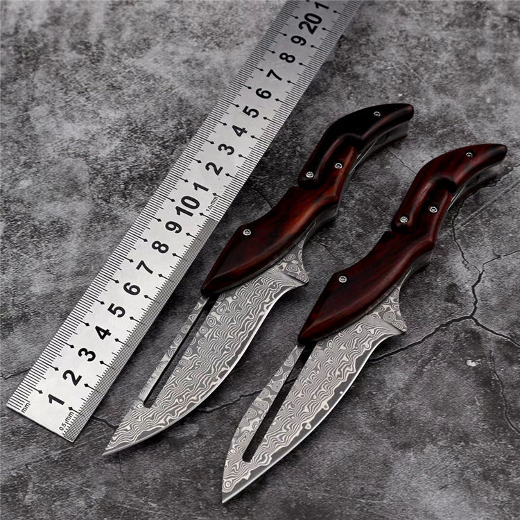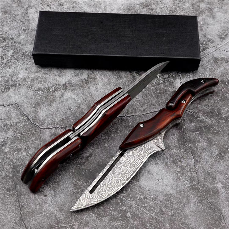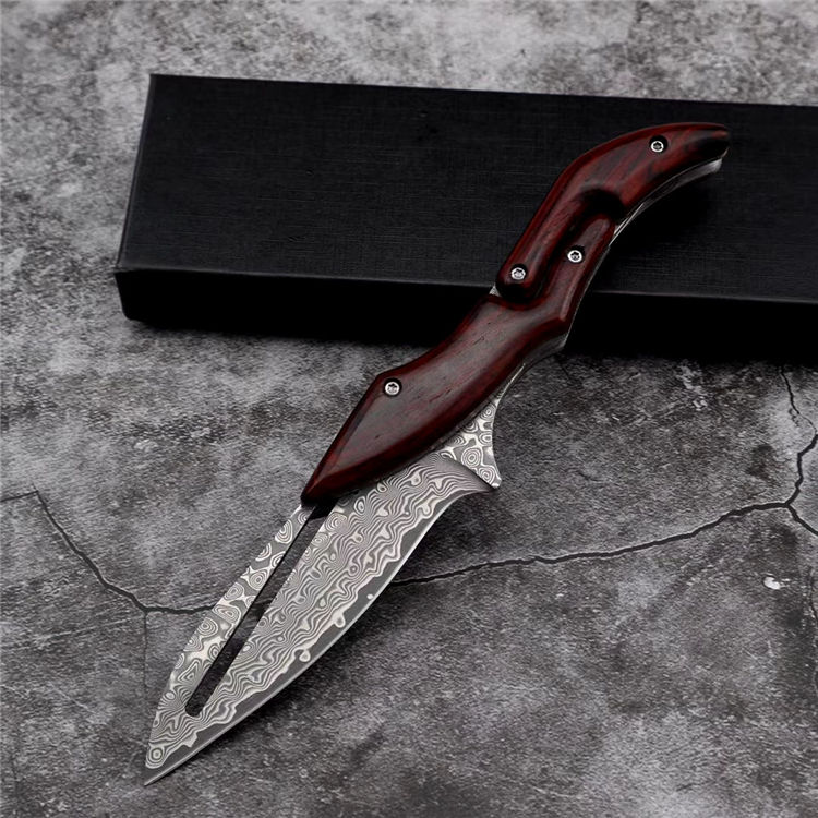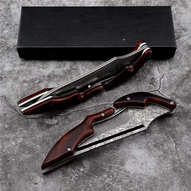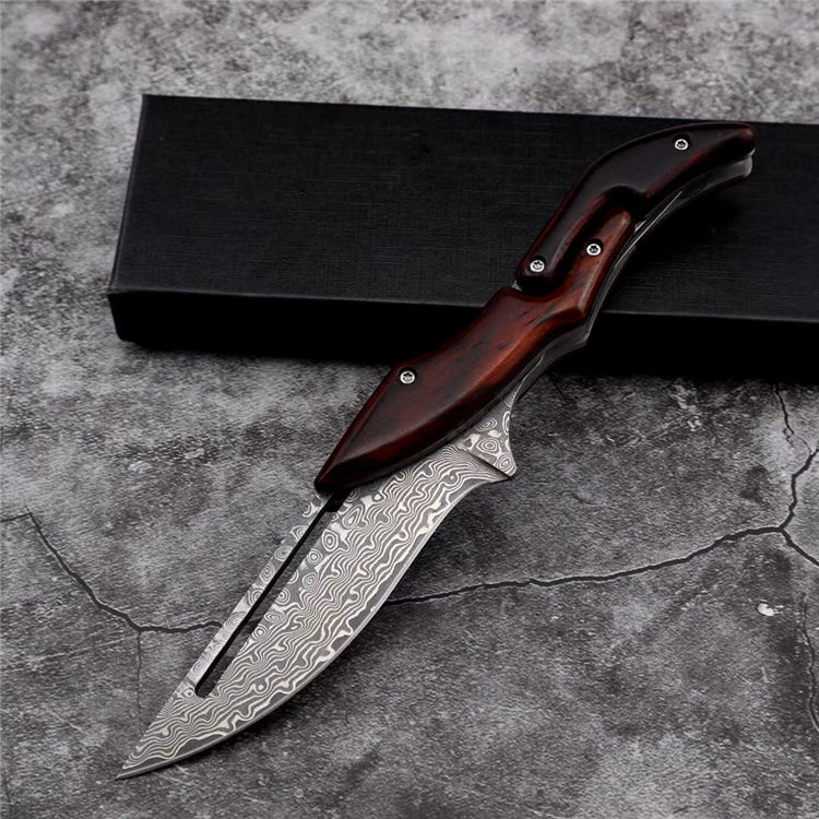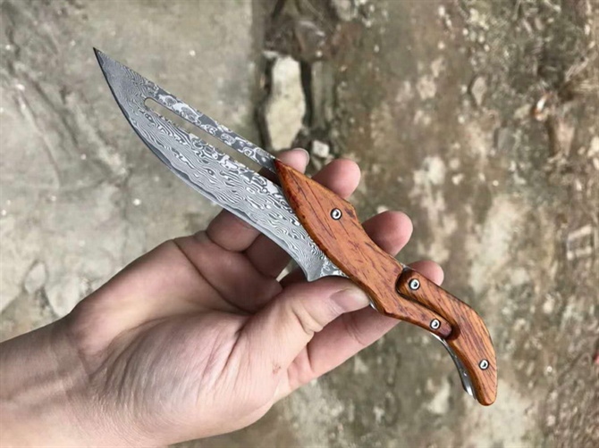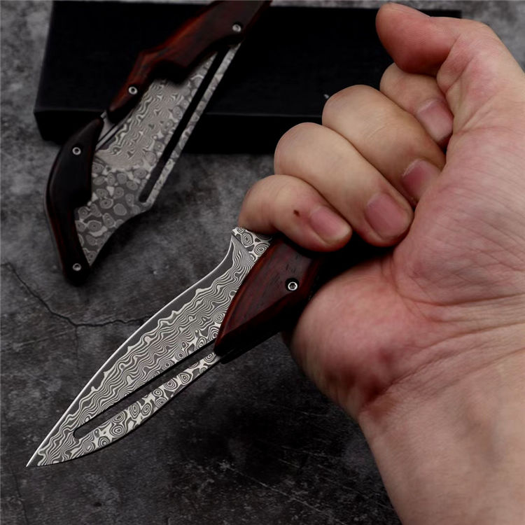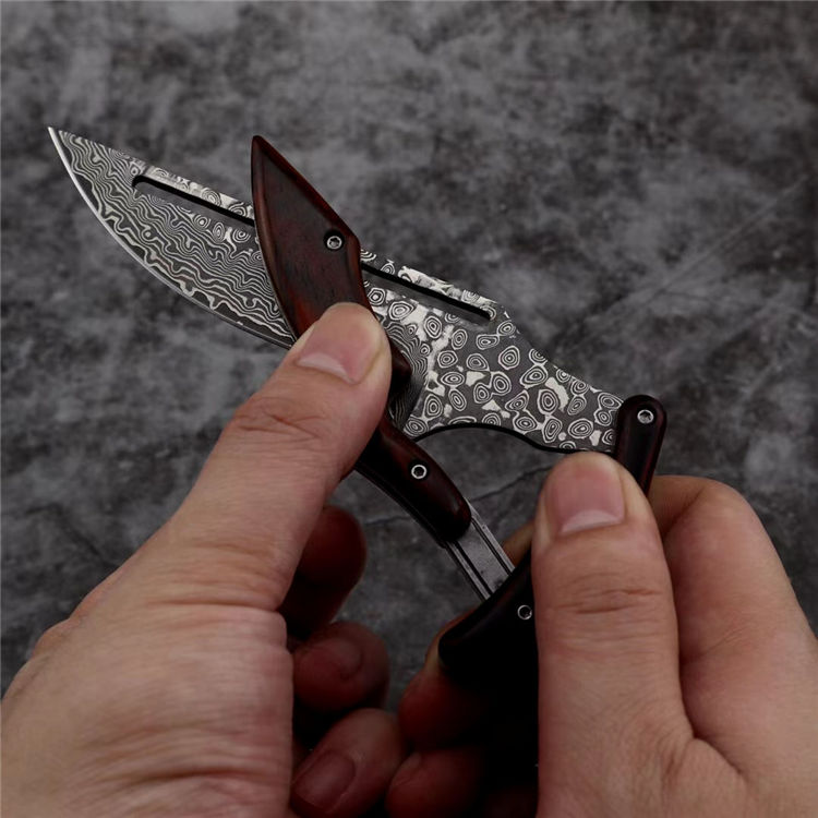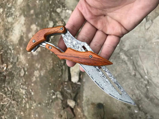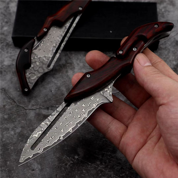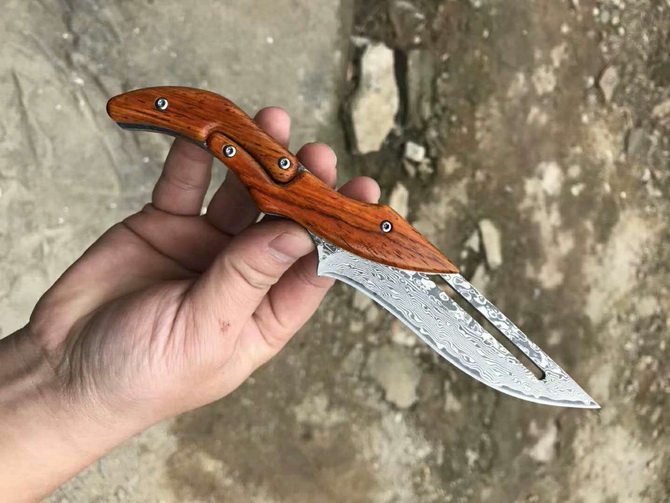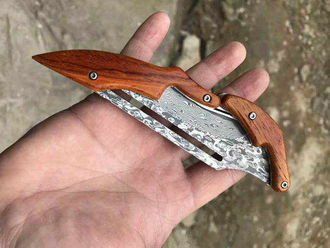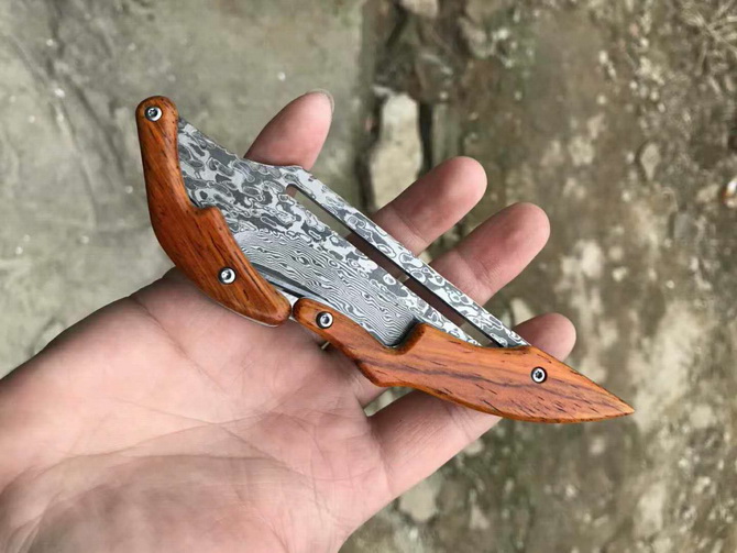 2019最新款大马士革蚂蟥机械折刀 类型:中型折刀 全长:190mm 刃长:105mm 刃宽:25-33mm 厚度:3.3mm 材料:大马Vg10 硬度:钢芯硬度60-61 手柄:黄檀木手柄 锁定:机械锁 刃口:锋利表面 独特的造型,创新的操作方式,打破传统构思,令人焕然一新 开刀:刀柄尾端的三角部分可以象活动夹子一样,用手指稍用力一夹,即可将刀刃打开(看附图) 关刀:同样压住刀柄三角尾部,即可将刀刃收起(看附图)