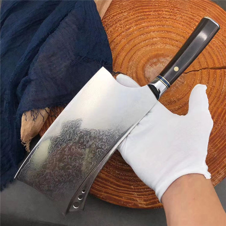 大马士革将军砍切两用厨刀 总长:32cm 刃长:20cm 刃厚:3.5mm 刃宽:8.8cm 重量;500g 钢材:进口日本进口VG10钢芯锻造大马士革钢97层 硬度:61-62HRC,真空热处理,锋利度级别:国际一级锋利标准,食品级安全检查 柄材;进口黑檀木+稳定固话木隔片,马赛克柳丁固定 包装:手工黑色盒子包装!数量有限,喜欢的朋友不要错过