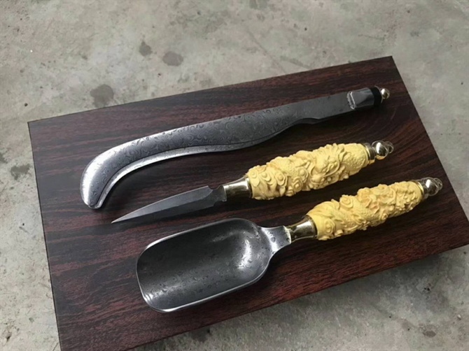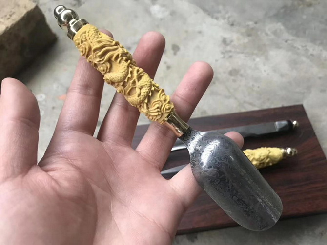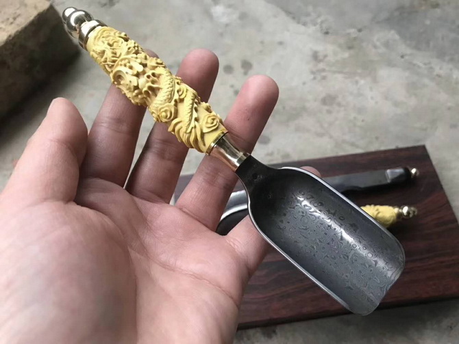 高端系列:大马茶针-大马茶勺-大马茶夹,大马士革钢料制作、老师傅·纯手工打造,黄杨木精雕手柄,高档品茶用具之一,喜欢泡茶的老铁们,不要错过哦