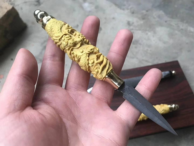 大马士革龙雕三件套装茶刀 茶针约总长:16cm 刃长6.5cm 刃厚2.5mm 茶勺约总长:17cm 勺钢长8cm 厚度:2mm 茶夹约总长:18cm 厚度:2mm 钢材:大马士革钢 硬度:59HRC 表面:大马士革原纹 柄材:精选黄杨木精雕神龙 包装配置:高级礼品硬盒 高端系列:大马茶针-大马茶勺-大马茶夹,大马士革钢料制作、老师傅·纯手工打造,黄杨木精雕手柄,高档品茶用具之一,喜欢泡茶的老铁们,不要错过哦