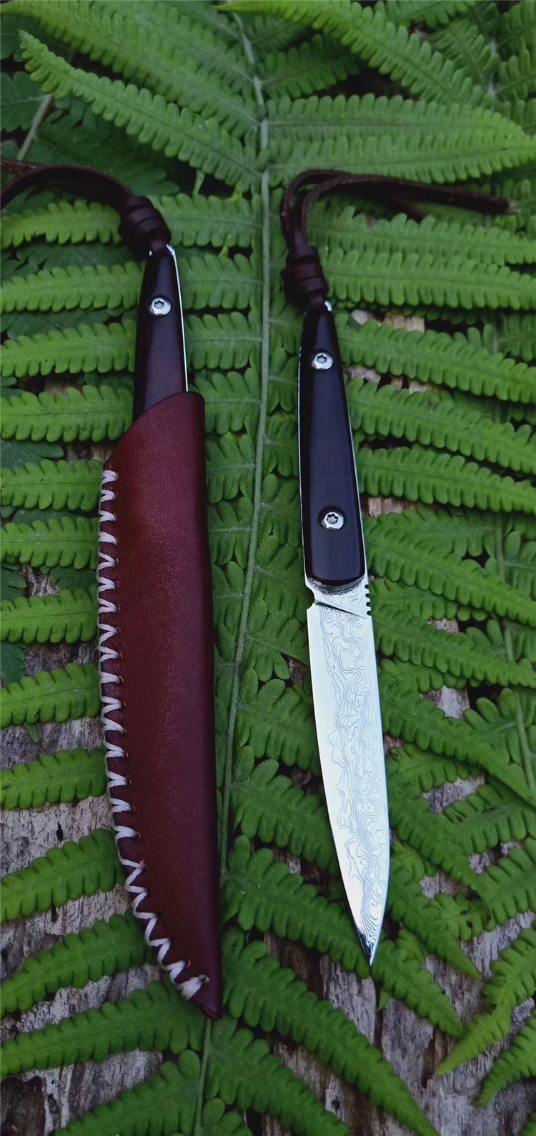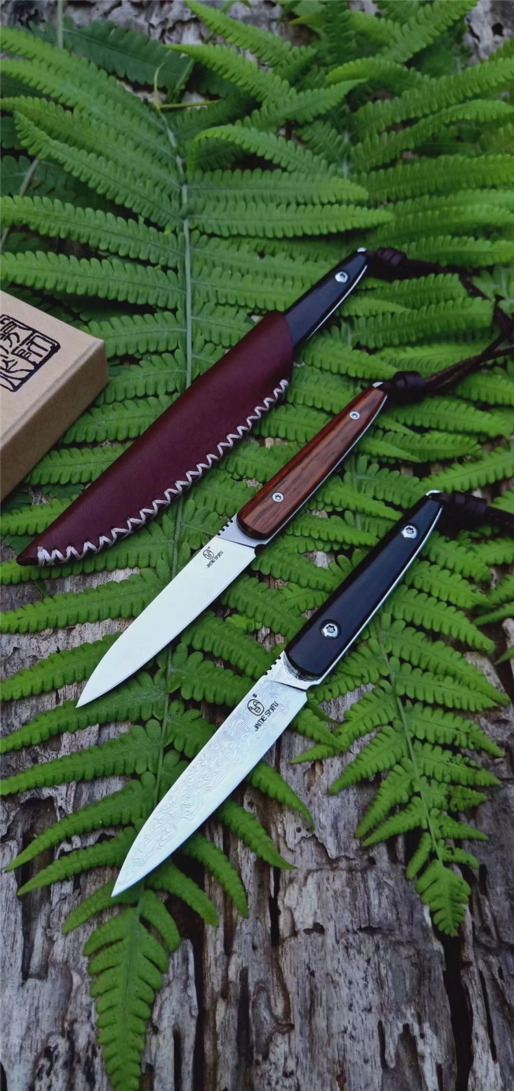 简师傅和刃水果刀 全长:15.5cm 刃长:7cm 刃厚:2.mm 硬度:60-61HRC 配置头层牛皮手工缝制皮套,头层牛皮尾绳,复古礼盒包装带简师傅正品LOGO保证盒子,非常实用一款水果刀,数量有限!不要错过哦