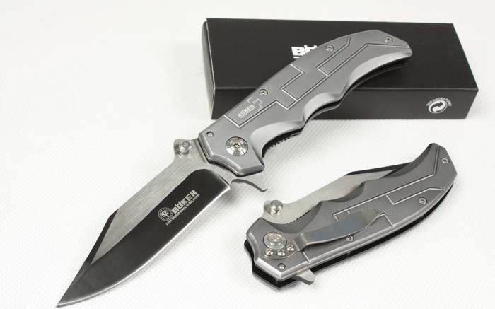 博克-柏林墙纪念版(银色) 全长:21.5cm 刃长:9.5cm 刃宽:2.5cm 闭合:12cm 刃厚:0.28cm 钢材:440C 硬度:56-58 净重:110g 柄材:金属铝 锁型:侧锁 包装:彩纸盒 产地:国内代工