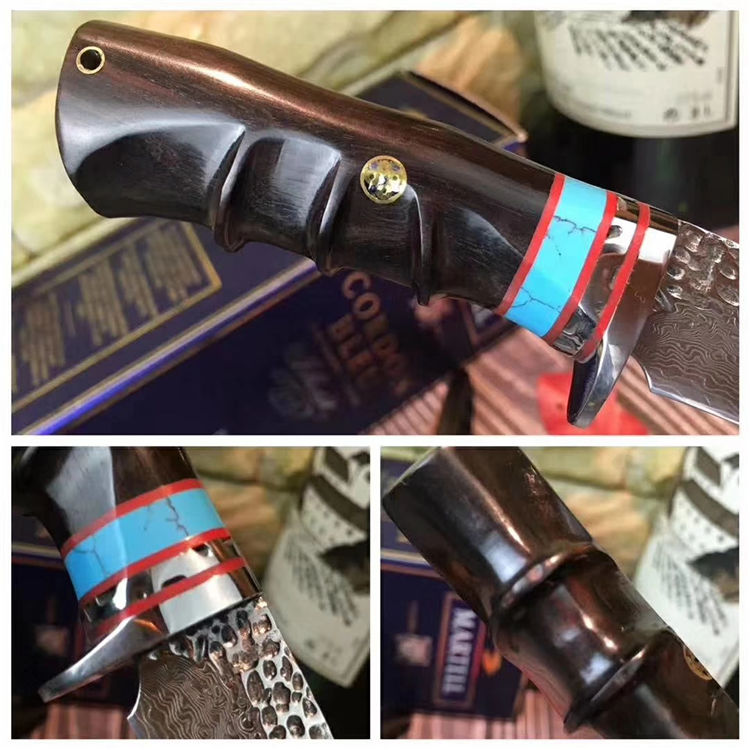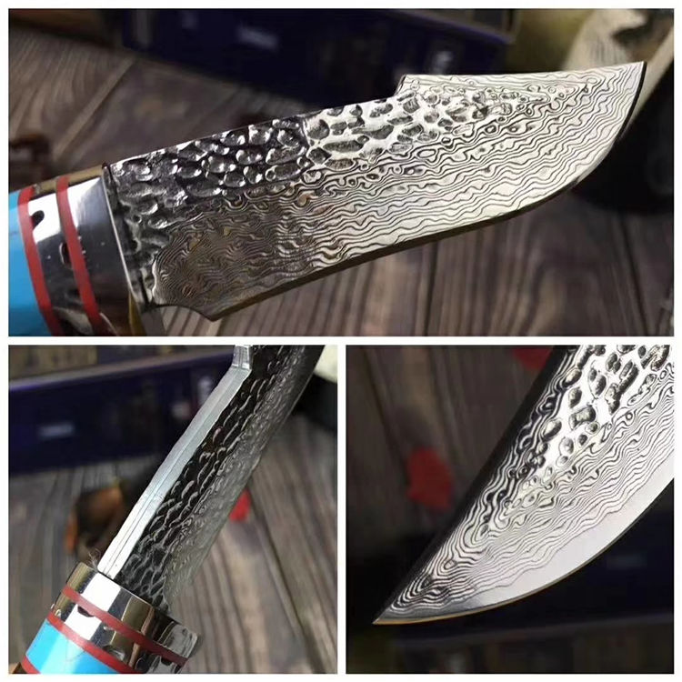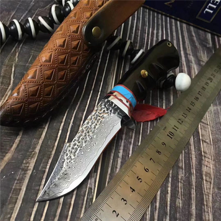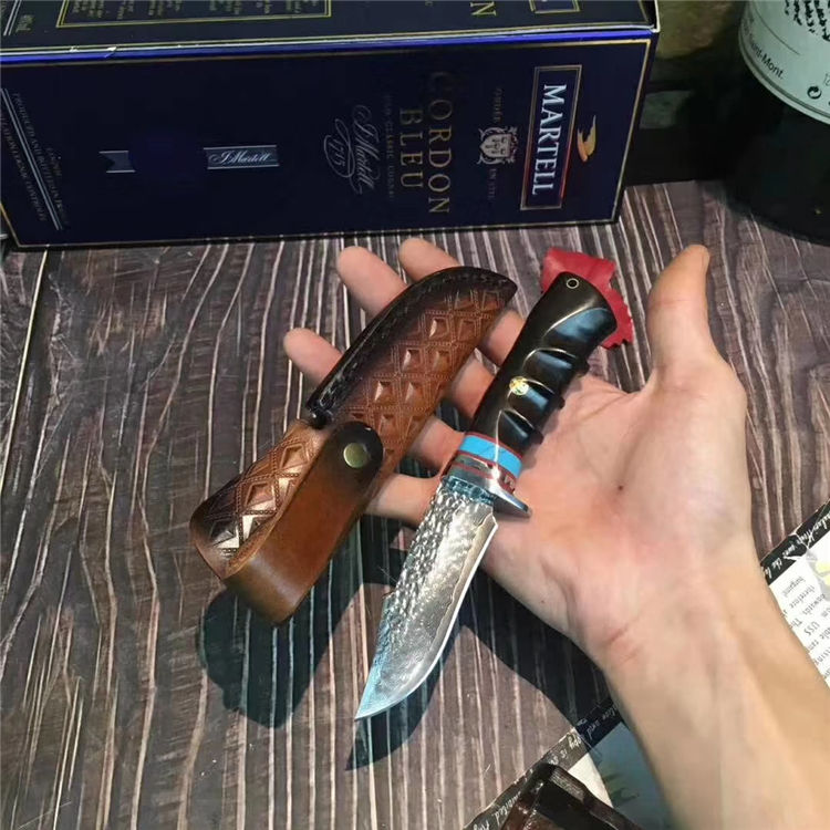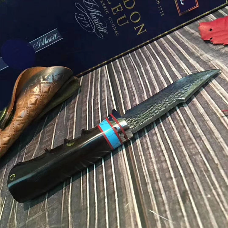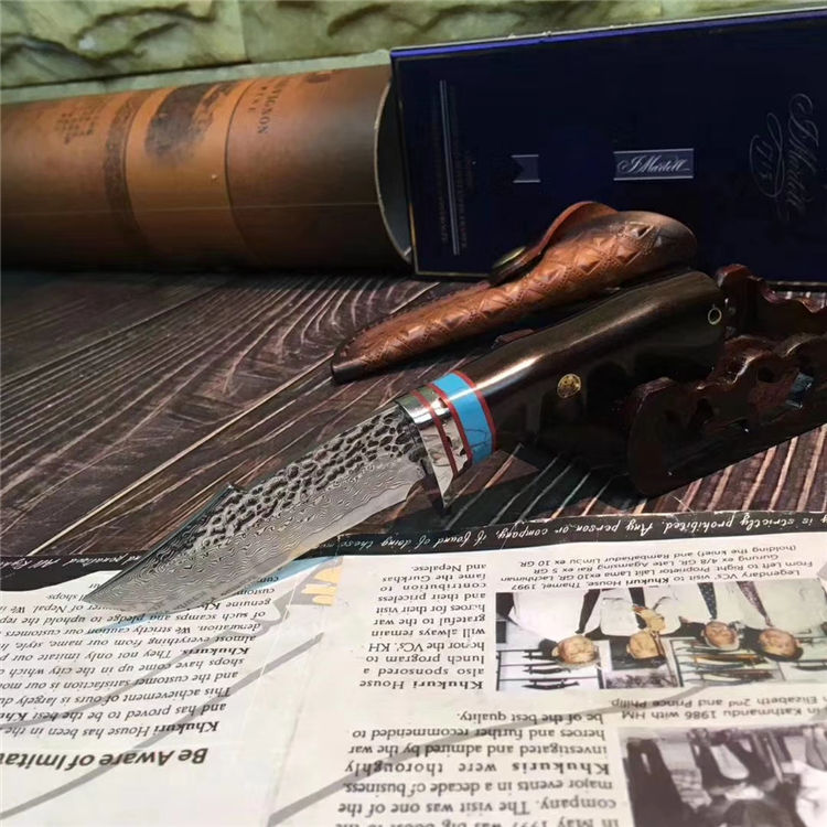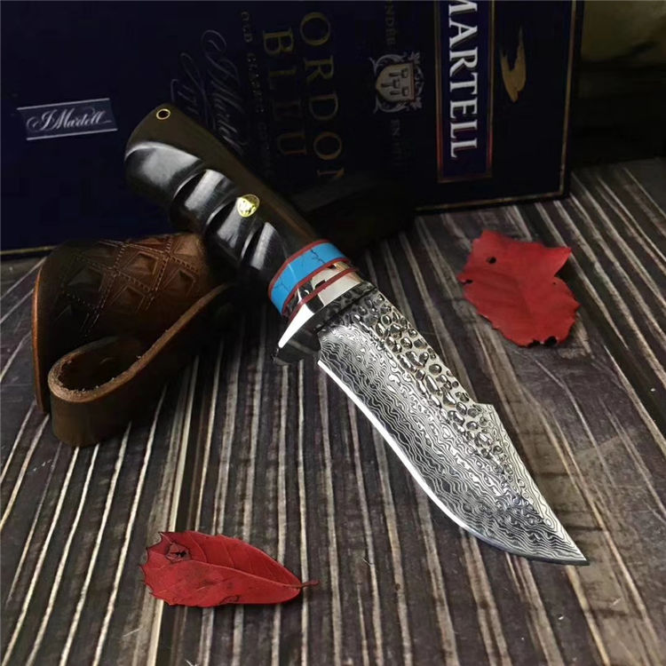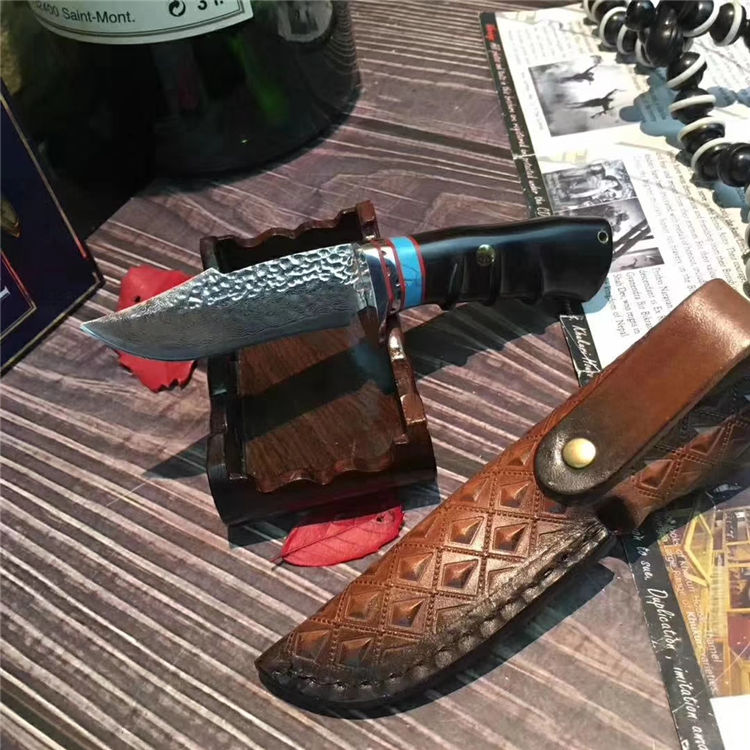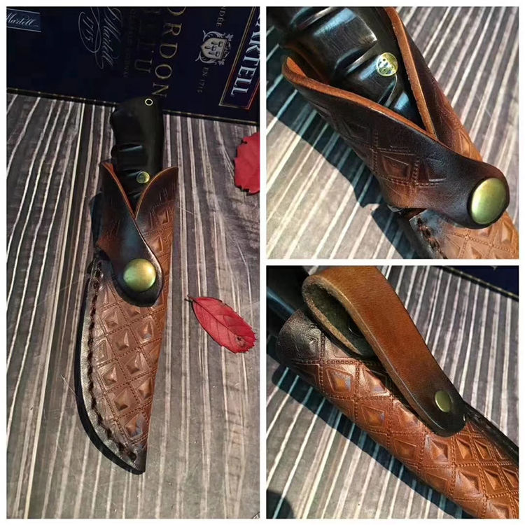 大马士革玄雨猎刀 总长:170MM 刃长:80MM 刃厚:4MM 刃宽:23MM 硬度:60HRC 刃材:大马士革钢VG10 刀柄:钢头+黑檀木+CNC精雕 热处理技术:真空热处理表面 效果:电脑数控水磨,砂光效果 护手:430不锈钢 重量:刀+套120克左右 皮套:意大利进口手工雕花手工缝线植鞣皮,复古经典怀旧效果 开刃方式:水冷二次开刃,以锋利度为主