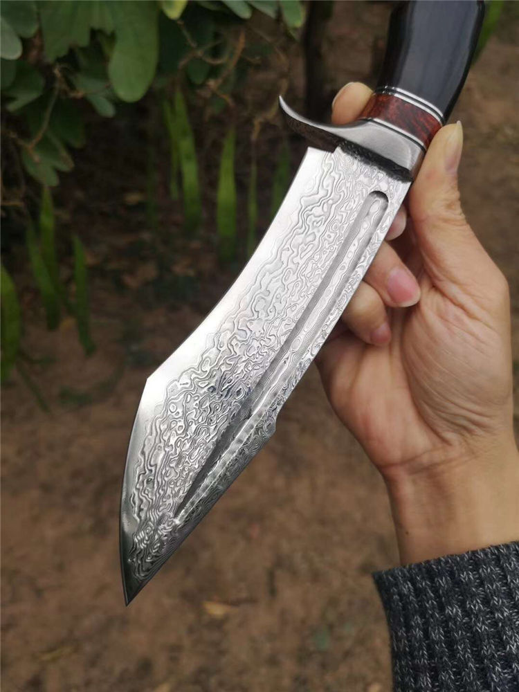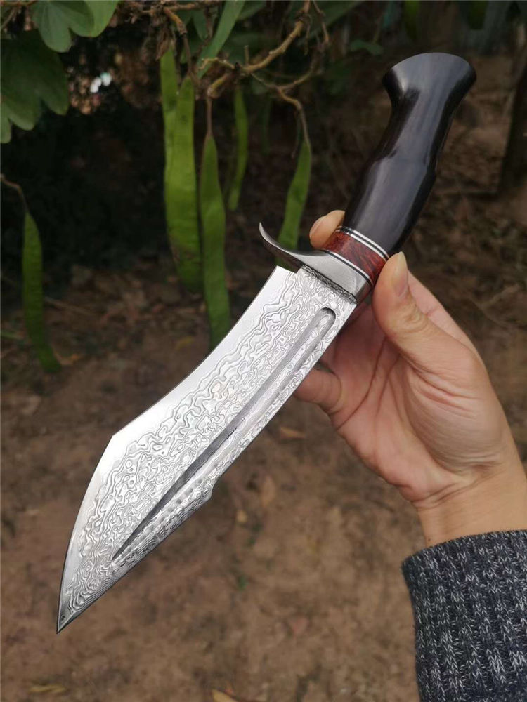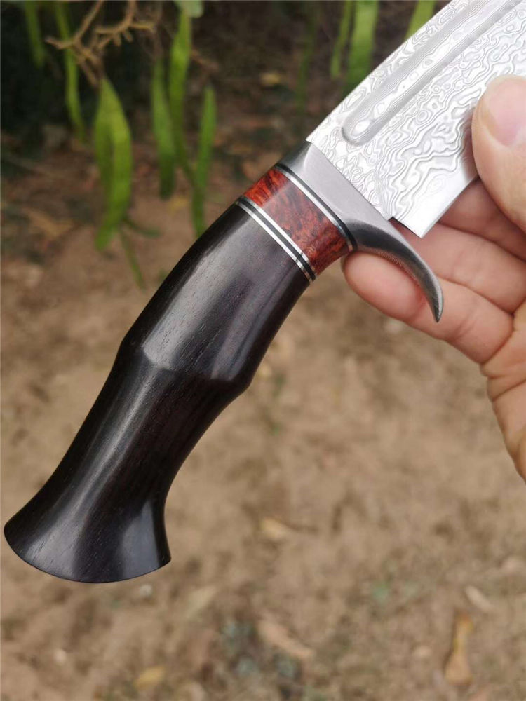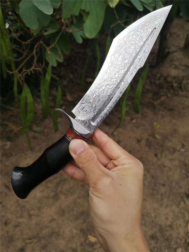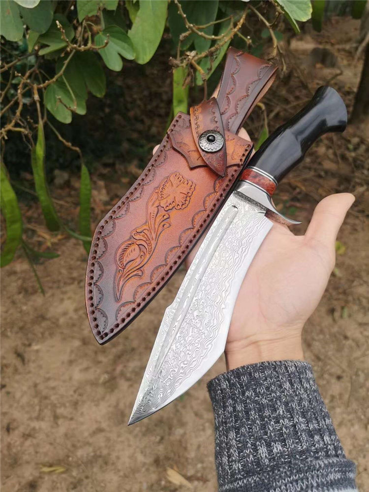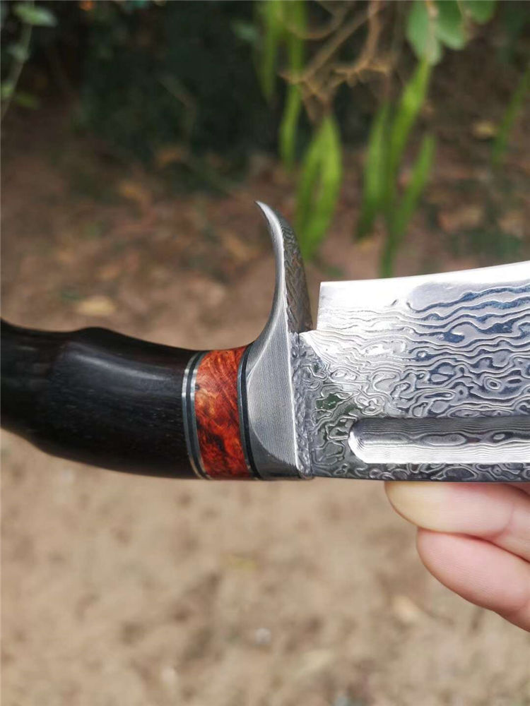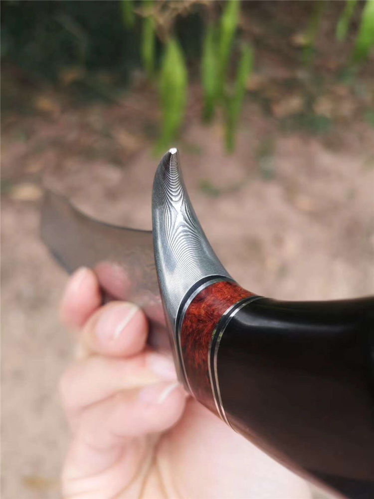 大马士革雷神博弈刀 总长:31cm 刃长:18cm 刃宽:4.8cm 刃厚:4.1cm 钢材:进口VG10芯层大马士革钢,真空深冷热处理 钢头:大马士革千层钢 柄材:非洲黑檀木+老挝花梨瘿瘤料 皮套:意大利进口植鞣皮手工雕花缝线 盒子:礼盒包装!一款是高端名贵收藏级玩家必备用刀,送朋友领导必备品,高端好东西不要错过