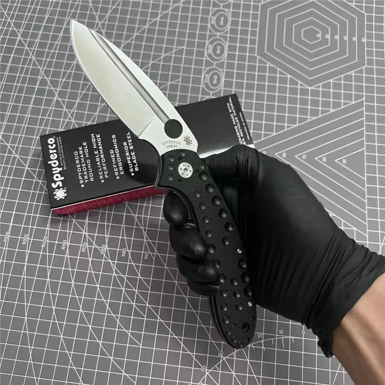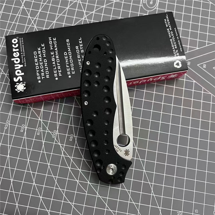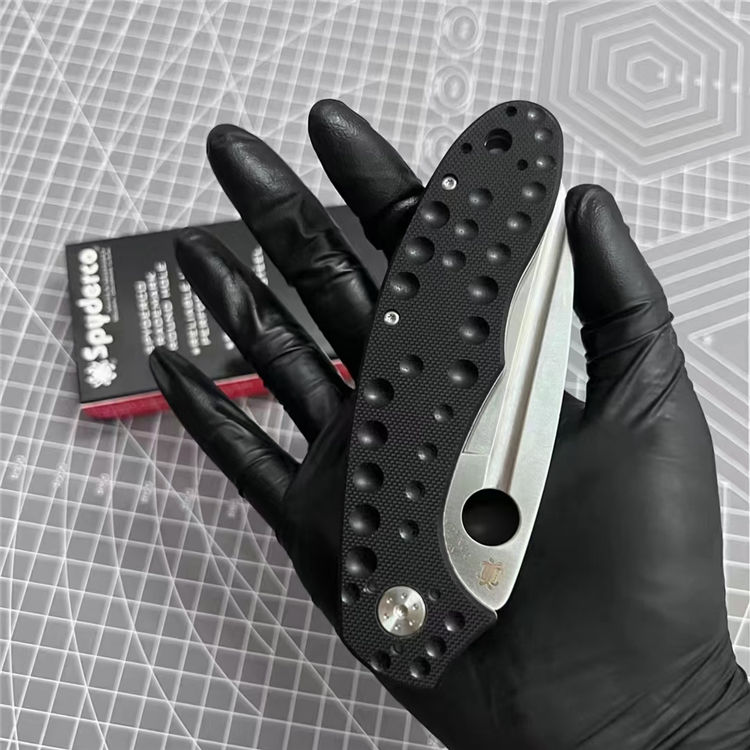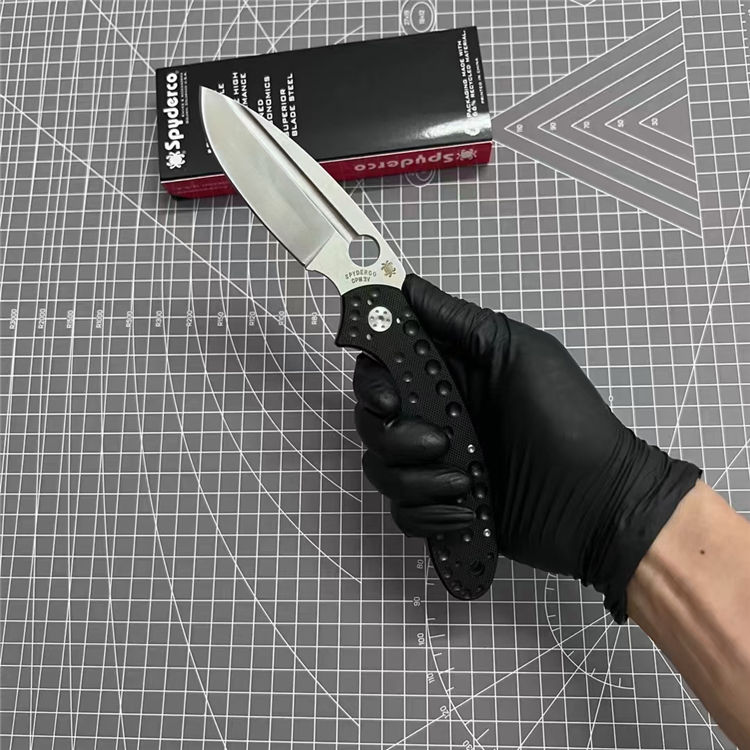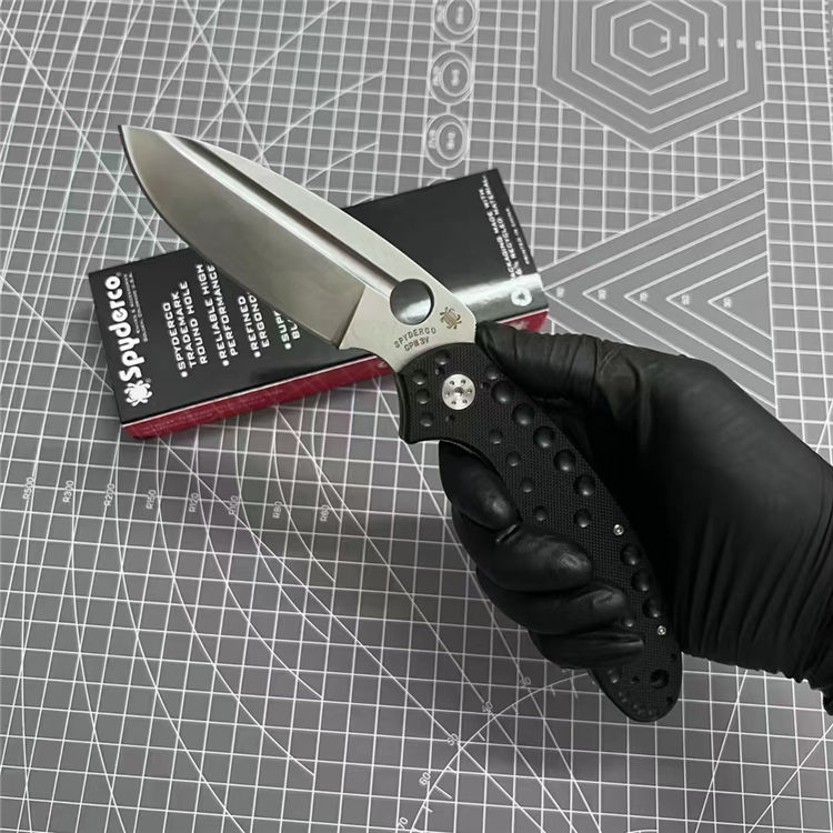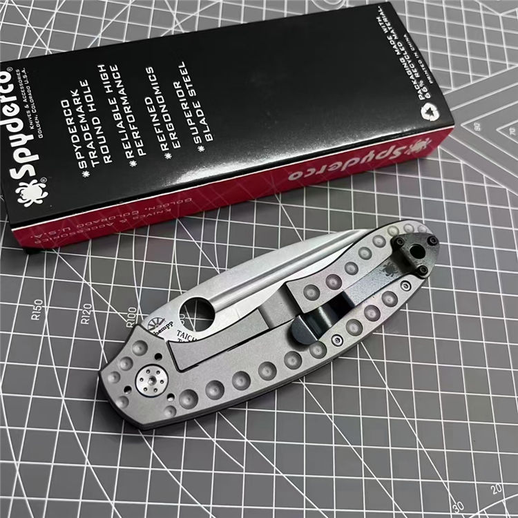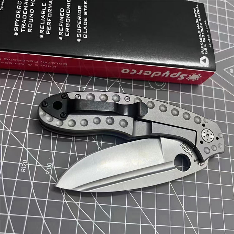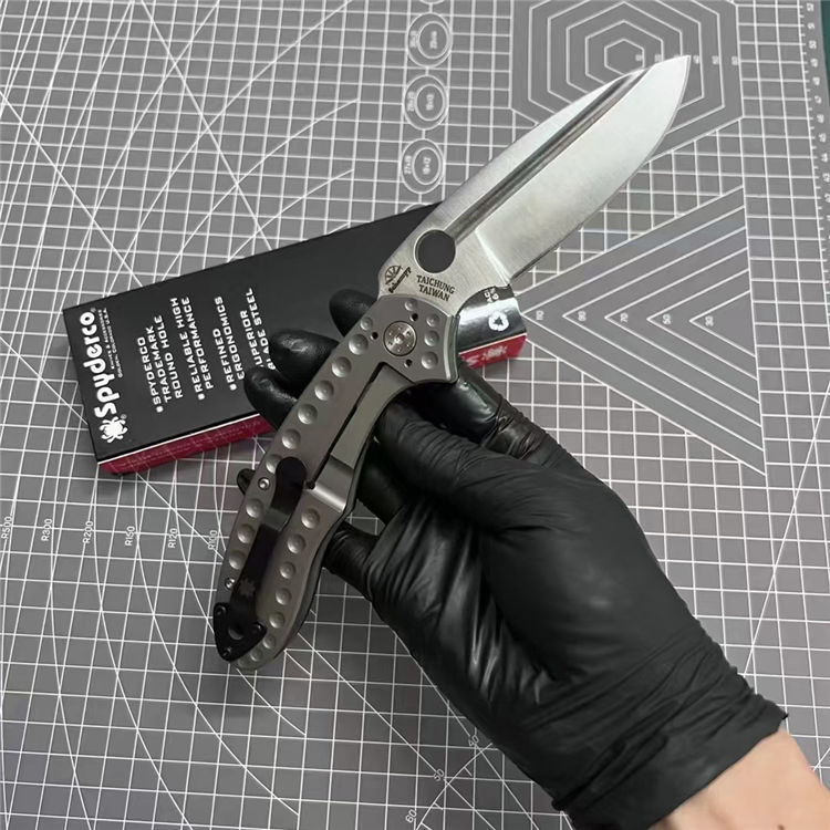 蜘蛛C151折刀 全长:22.2cm 刃长:9.3cm 柄长:12.9cm 刃厚:0.38cm 刃宽:3.3cm 刃材:D2钢 柄材:左面G10+右面钛合金 表面:刀刃砂光/钛合金喷砂 硬度:59HRC 重量:150g 包装:蜘蛛纸盒