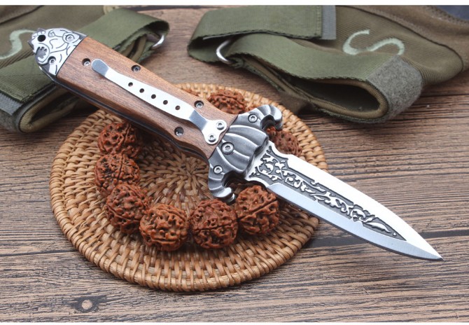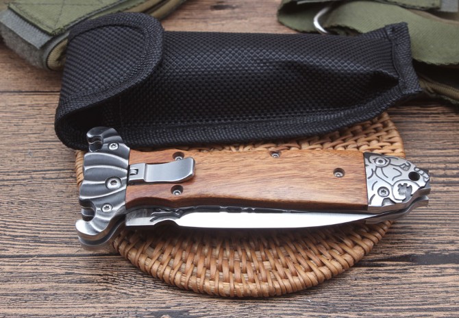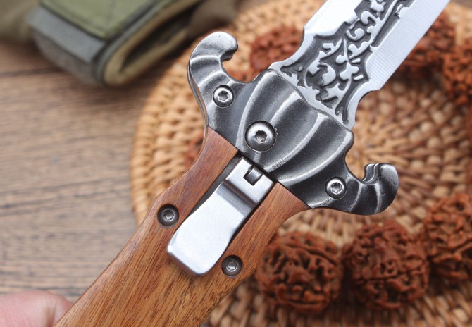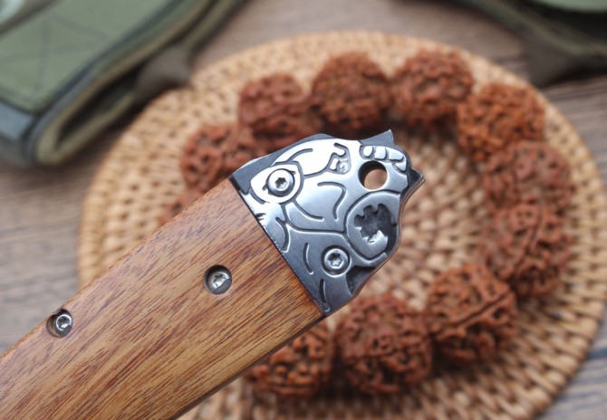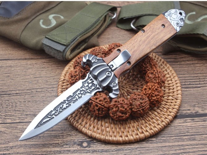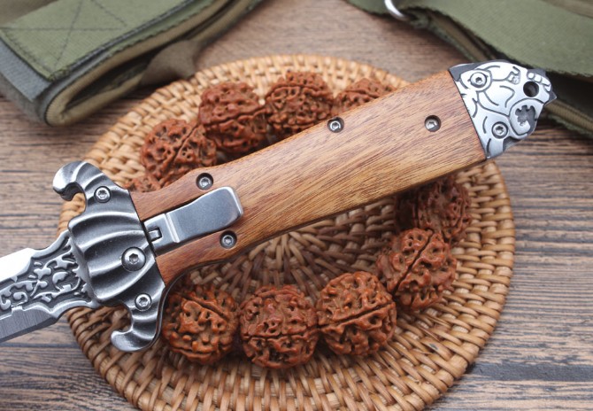 德国疯牛侧跳折刀 全长:210mm 刃长:87mm 柄长:120mm 刃宽:20mm 刃厚:2.9mm 刃材:高硬度钢 刀重;140g 重量:204g(含刀套) 硬度:58HRC 表面:雕花刃口沙光 柄材:双雕花钢头+酸枝木 锁型:横出开关 其他:配尼龙套