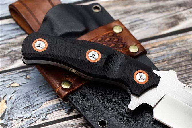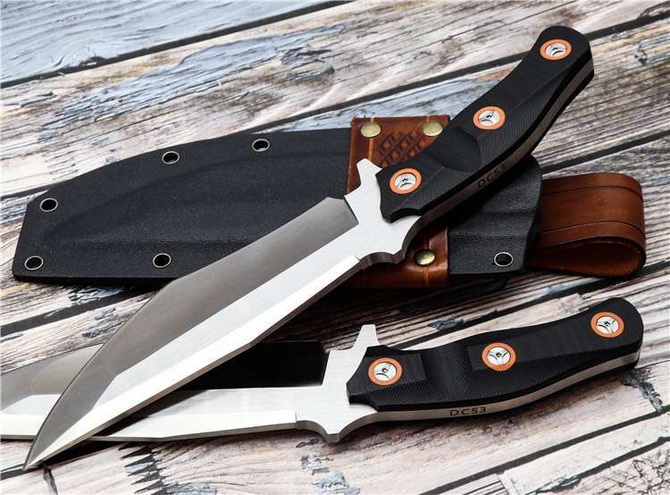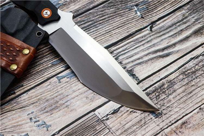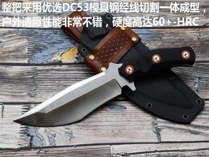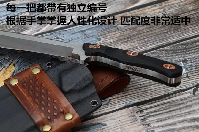 意大利定制版战术刀 全长:29.5cm 刃长:16.9cm 刃宽:5.3cm 刃厚:6mm 柄长:12cm 刃材:DC53模具钢 热处理:真空深冷油淬,回火处理,保持韧性 硬度:60HRC 净重:380g 表面:拉丝 柄材:G10 其他:K鞘+意大利植鞣皮,每把带独立偏号