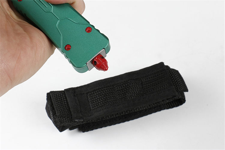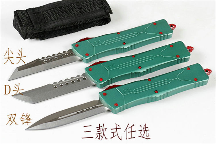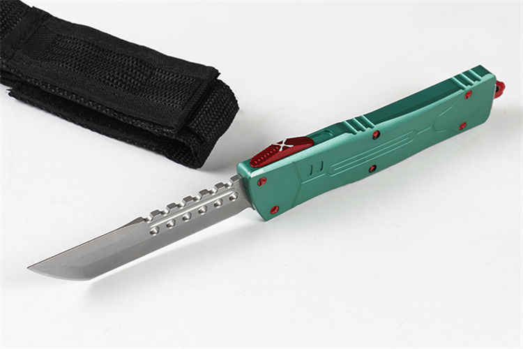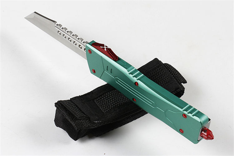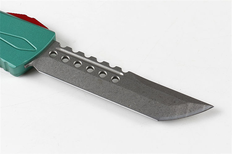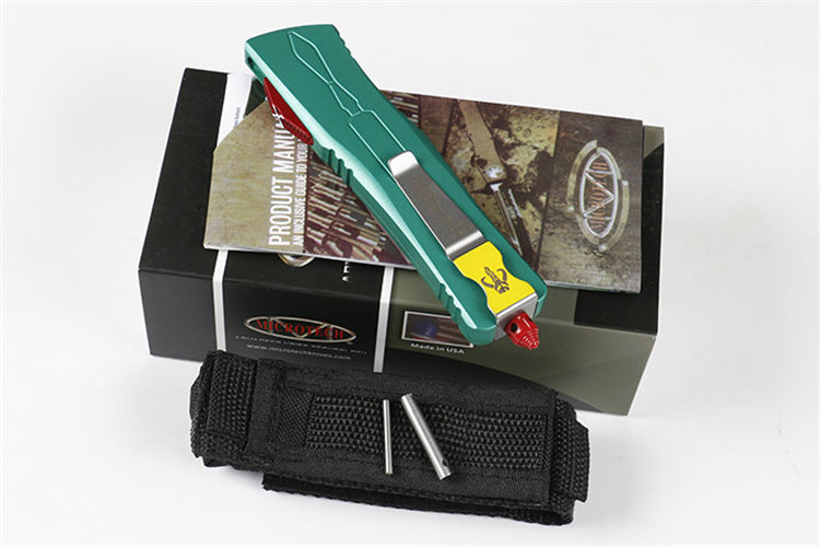 微技术赏金A10大龙直出跳刀 品牌:MICROTECH 美国微技术 全长:24.5CM 刃长:9.5CM 柄长:15.0CM 刃宽:2.1CM 刃厚:0.3CM 刀刃材质:7CR17灰钛加石洗处理. 尖头沙光处理 柄材:铝合金镀绿钛 刀型:直跳 锁定类型:按钮锁 重量:250克(含包装) 附件:彩盒,送拆刀工具 整刀用CNC,电脑锣,线切割制作而成,手工,精密度非常高,绝对不会缩头,很值得收藏的一把刀