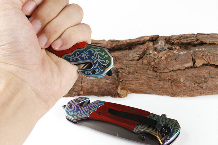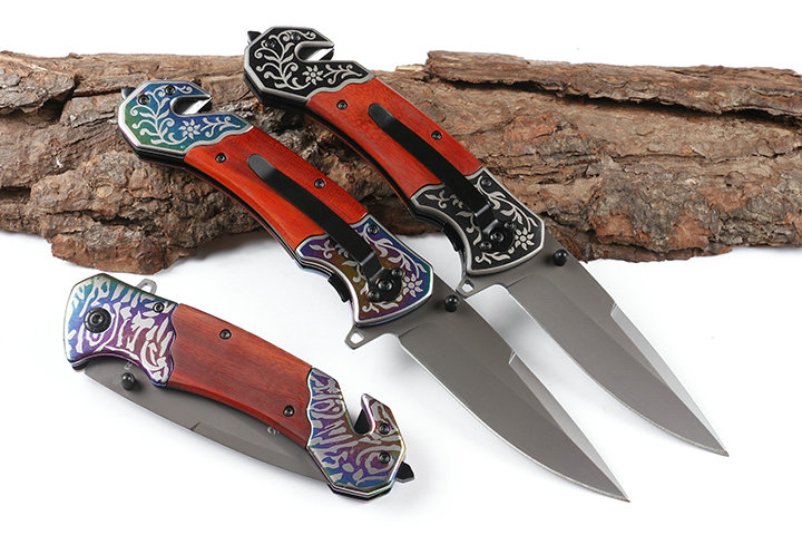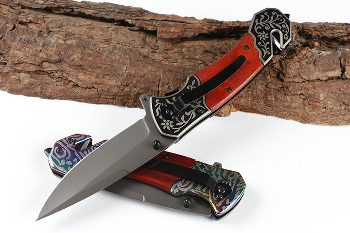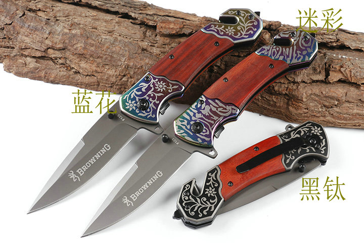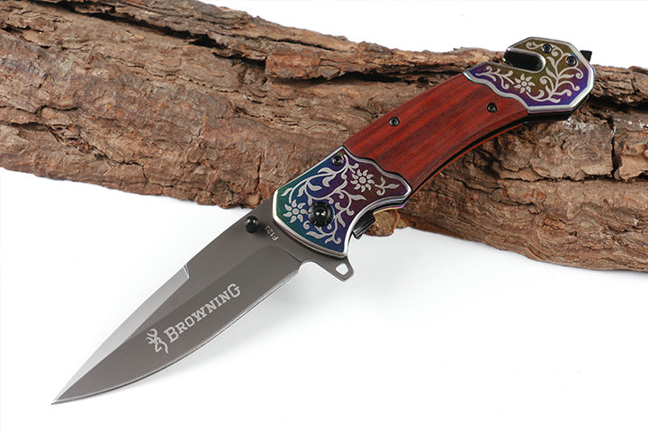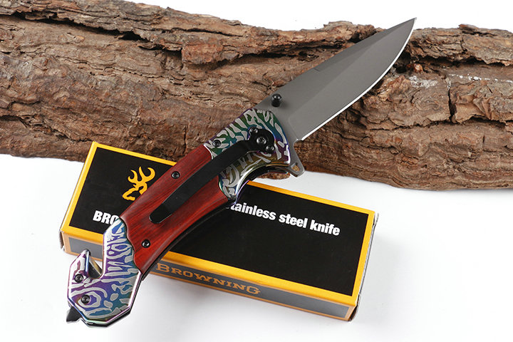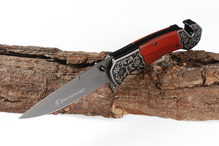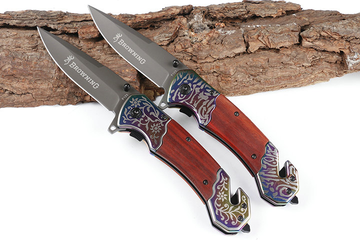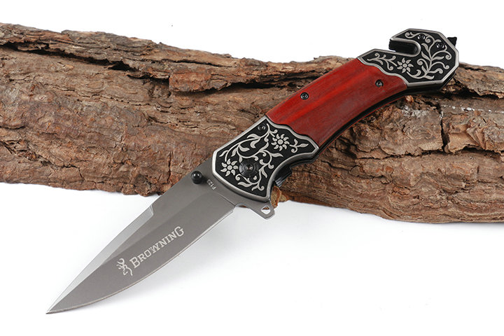 勃朗宁F123快开折刀 品牌:勃朗宁 全长:22.5cm 刃长;9.8cm 柄长:12.7cm 刃宽:2.8cm 刃厚:3.0mm 刃材:440C 重量:240g(含包装物) 硬度:57HRC 表面:沙光伴拉丝 柄材:钢头三D打印图案+天然实木 锁型:线锁 其他:配彩盒,配刀背夹