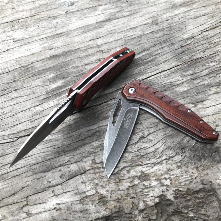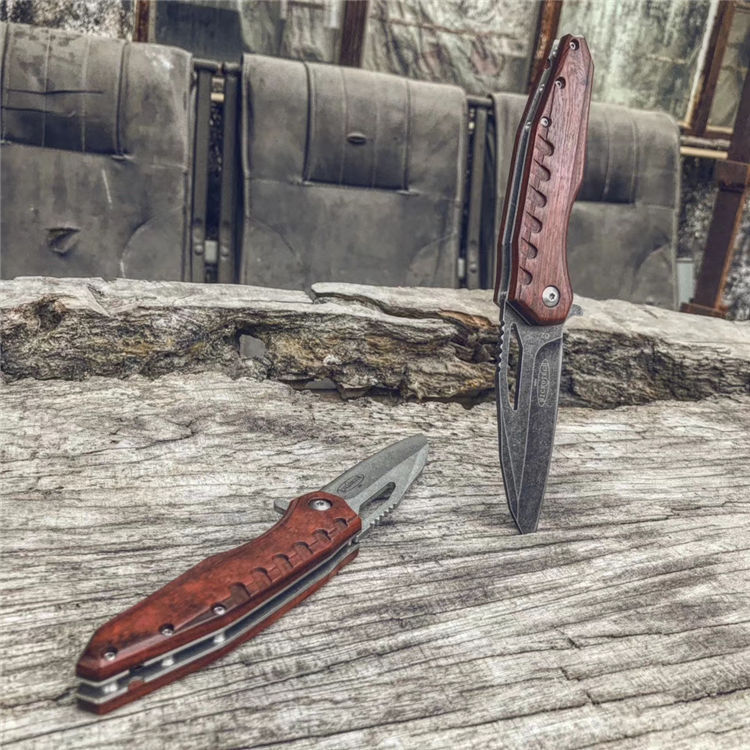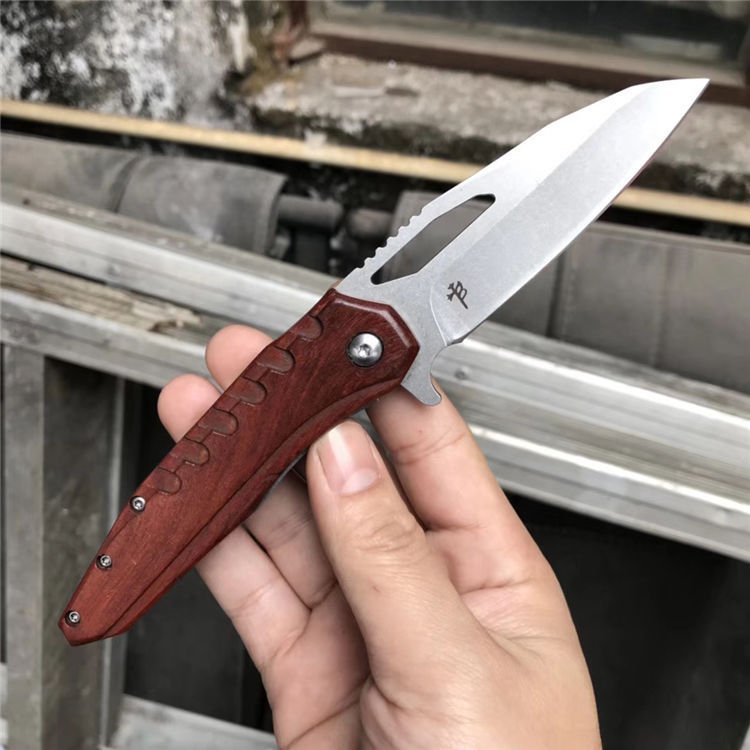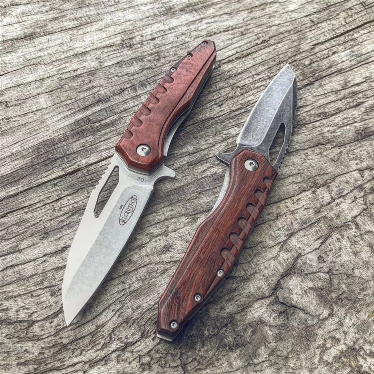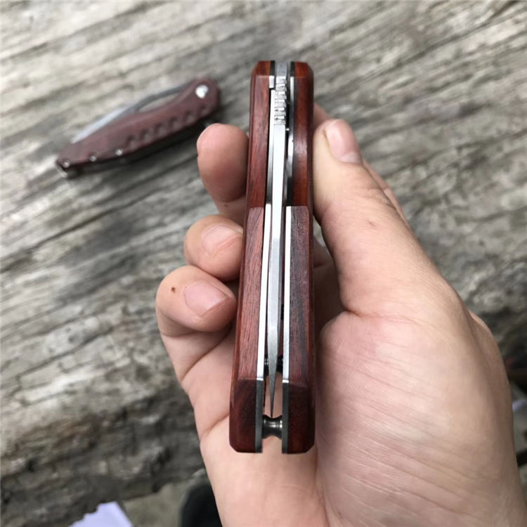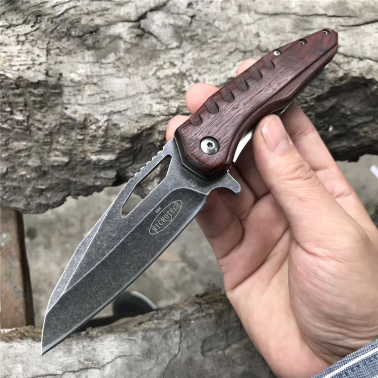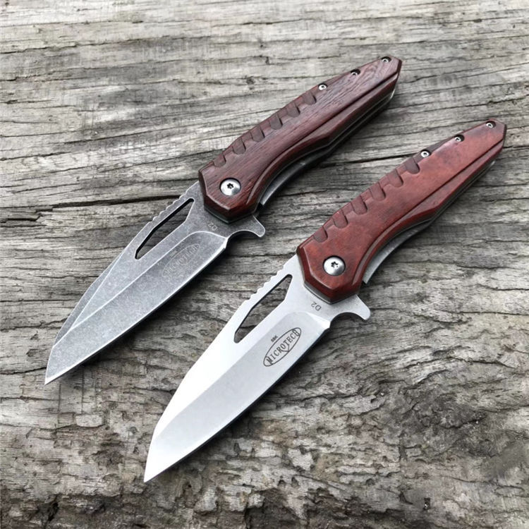 微技术魔符折刀 柄材:科檀木 全长:20cm 刃长:8.3cm 刃厚:0.35cm 钢材:D2 硬度:59HRC(真空油淬热处理+回火2次) 重量:105g 刀刃表面处理:石洗或沧桑石洗 包装:黑色纸盒