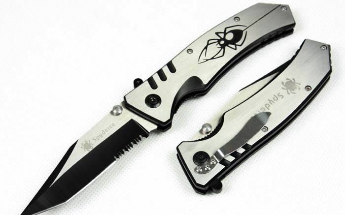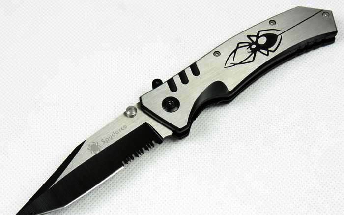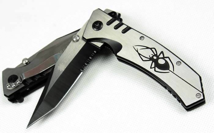 蜘蛛黑寡妇 全长:22.2cm 刃长:9.5cm 刃宽:2.5cm 闭合:12.70cm 刃厚:0.28cm 钢材:440C 硬度:56-58 净重:240g 柄材:全钢手工拉丝 锁型:齿轮助力 包装:彩纸盒 产地:国内代工